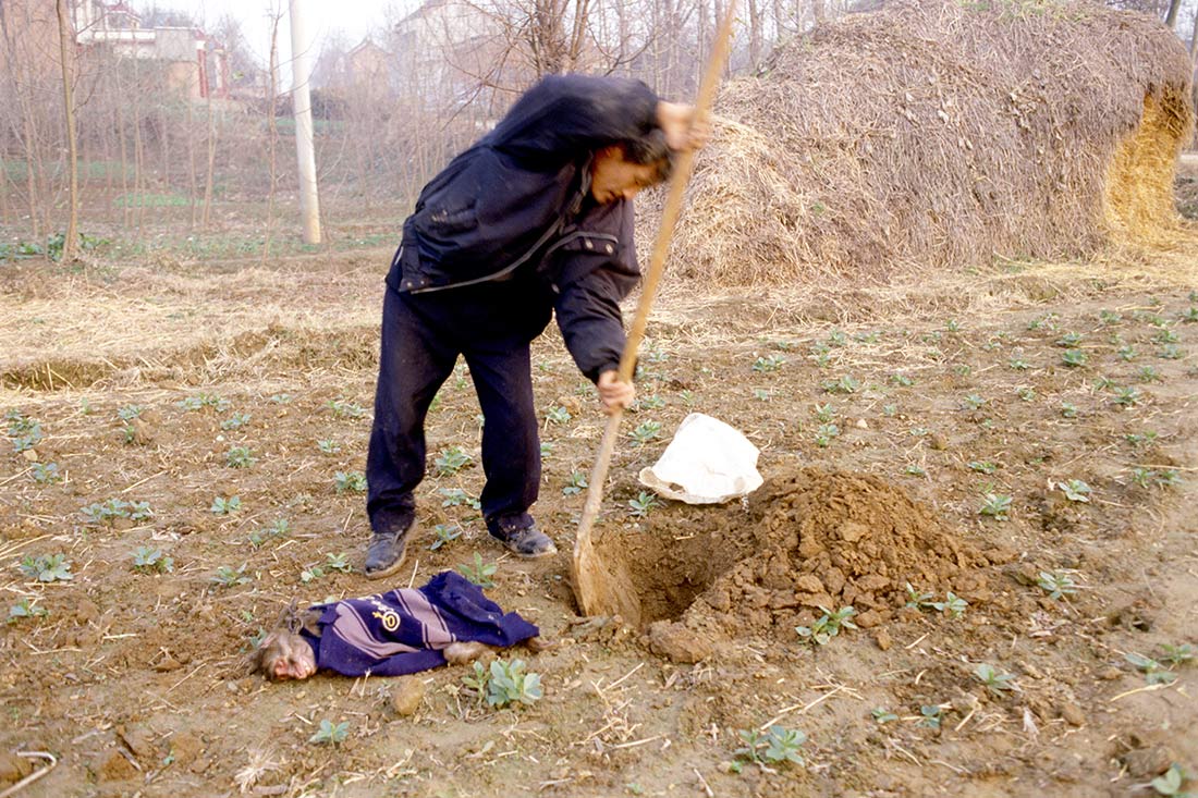 Yang digs a grave for one of his monkeys that died. Yang said monkey buskers are devastated to see their monkeys die. Yang said traveling to perform has been getting more difficult as he gets older. He plans to breed monkeys in the future. figcaption >