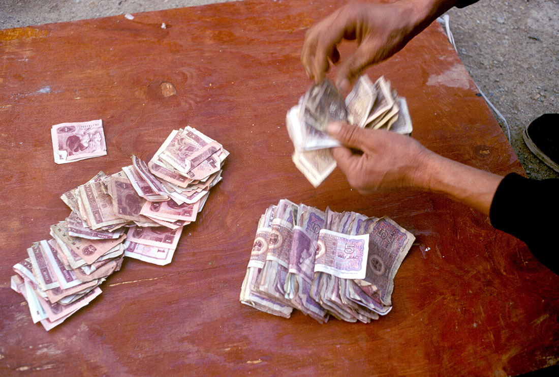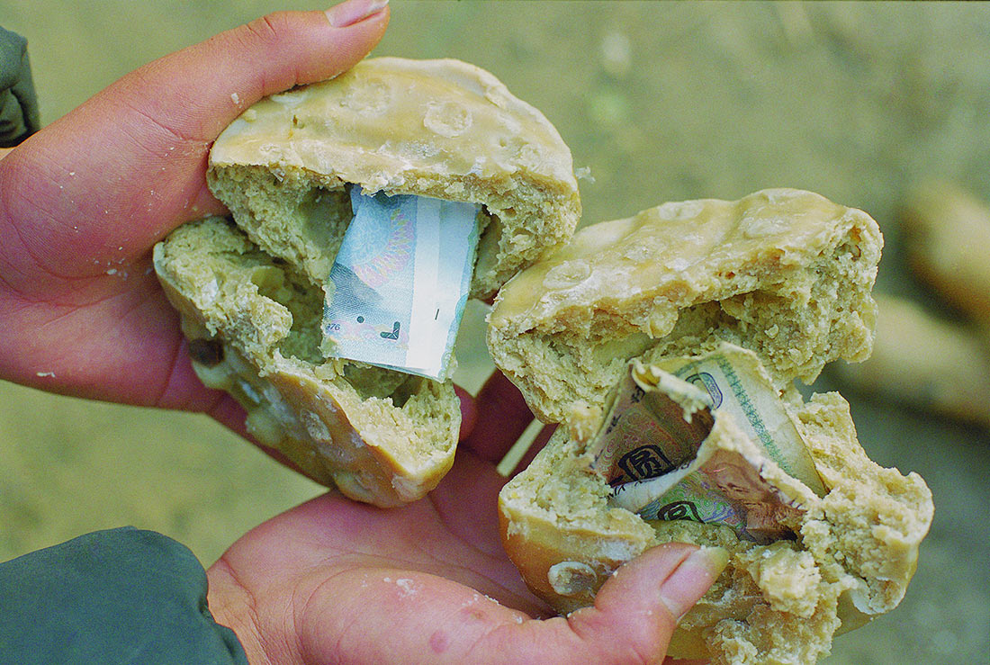 Yang shows his earnings hidden in dried steamed buns. Yang explained he stashes his money in order to prevent from being robbed by armed thieves or punished by law enforcement. figcaption >