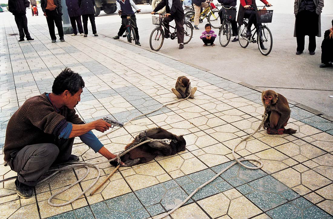 Yang and his monkeys perform a routine with a toy gun on a Chengdu street. figcaption >