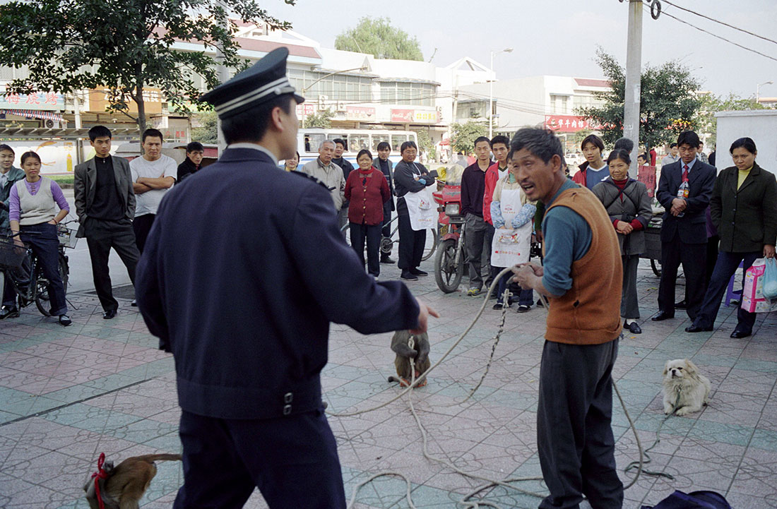 With only 50 yuan ($7.99) between them, the group of monkey buskers had to earn some money as soon as possible. Yang started to perform outside a development zone on Qingjiang Lu, which attracted many onlookers. Around 10 minutes later the security guard came and stopped it.
