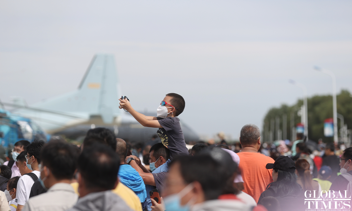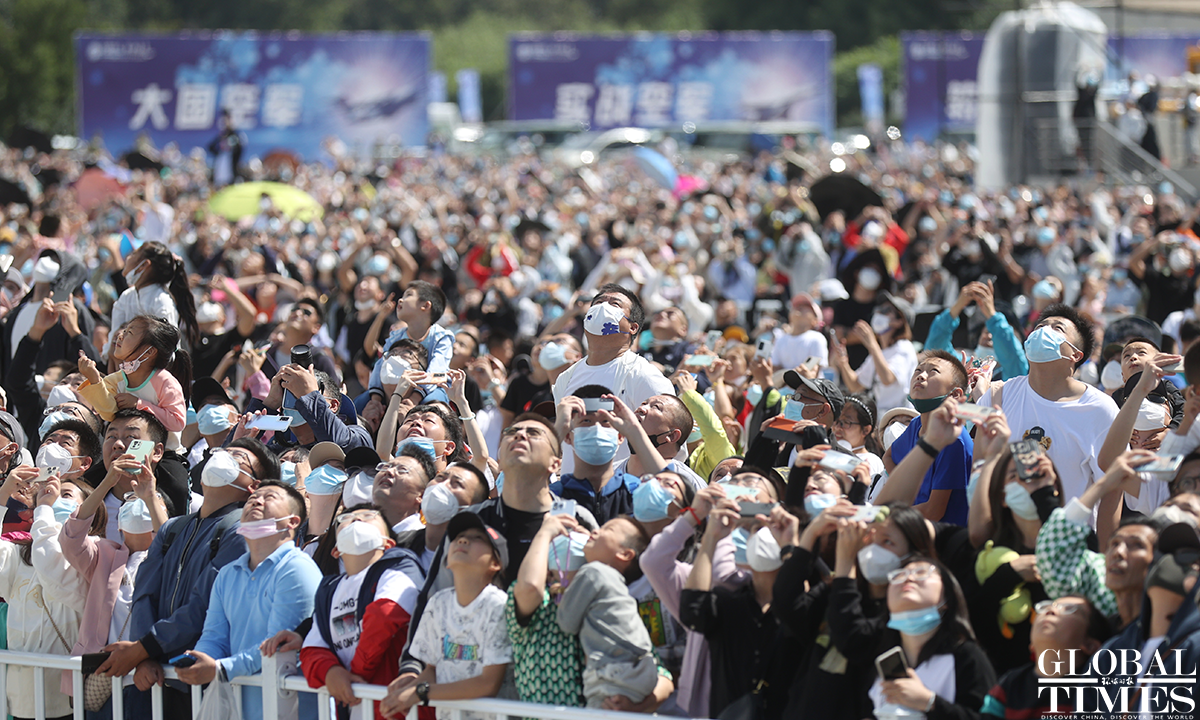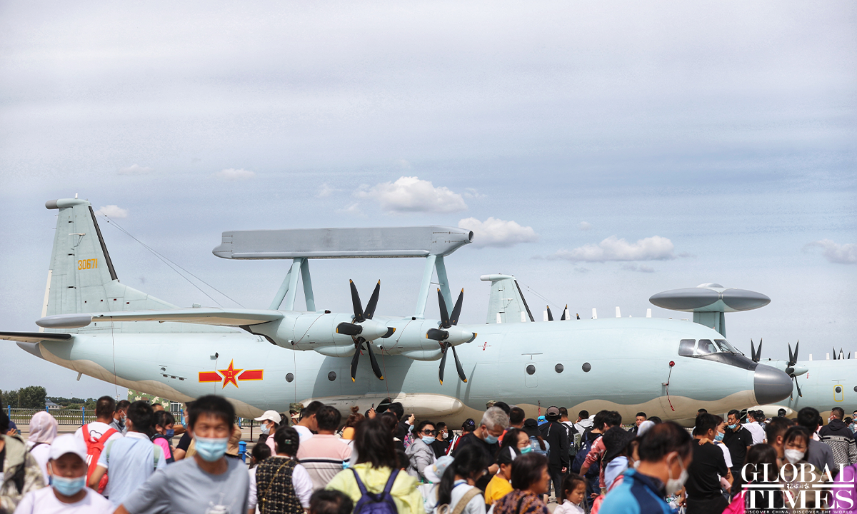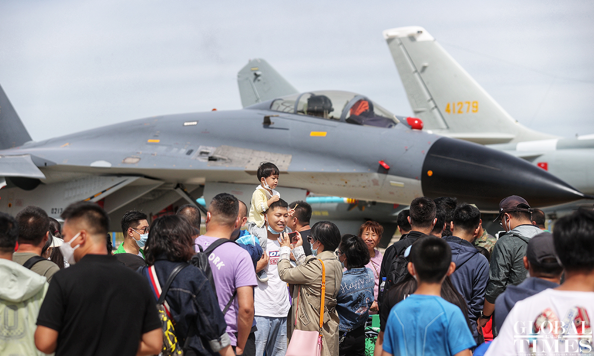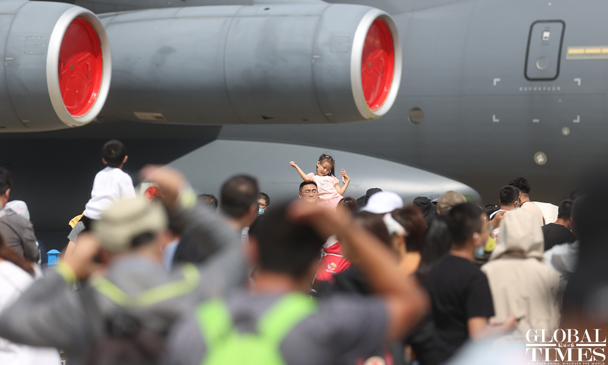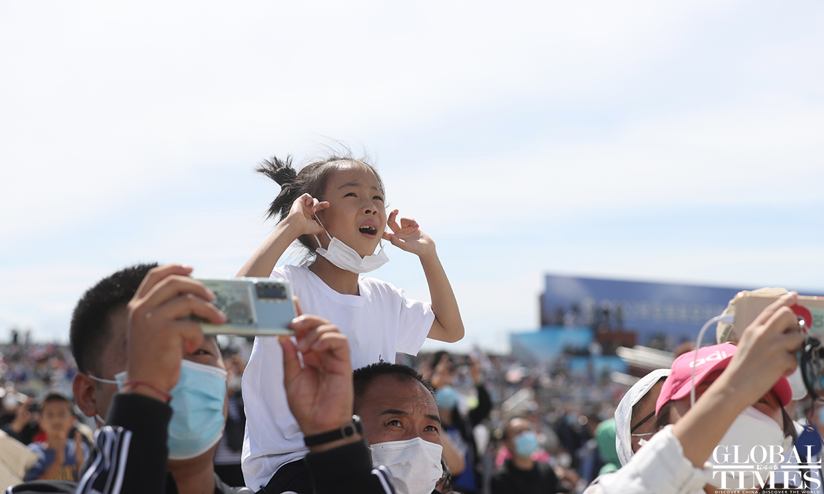 About 140,000 spectators gathered at Dafangshen Airport in Changchun for the PLA Air Force open day event on Sun. The audience was mesmerized by the flight performances of various types of aircraft and the display of star jets including YU-20, H-6, J-10C and KJ-500. Photo: Cui Meng figcaption >