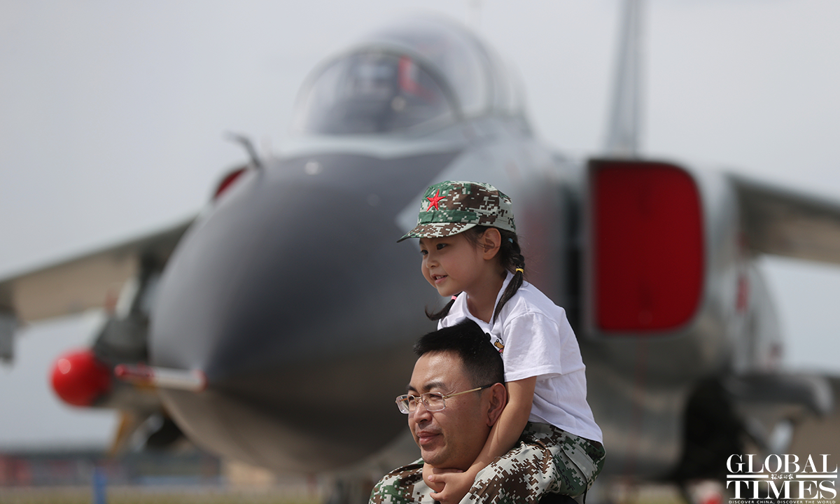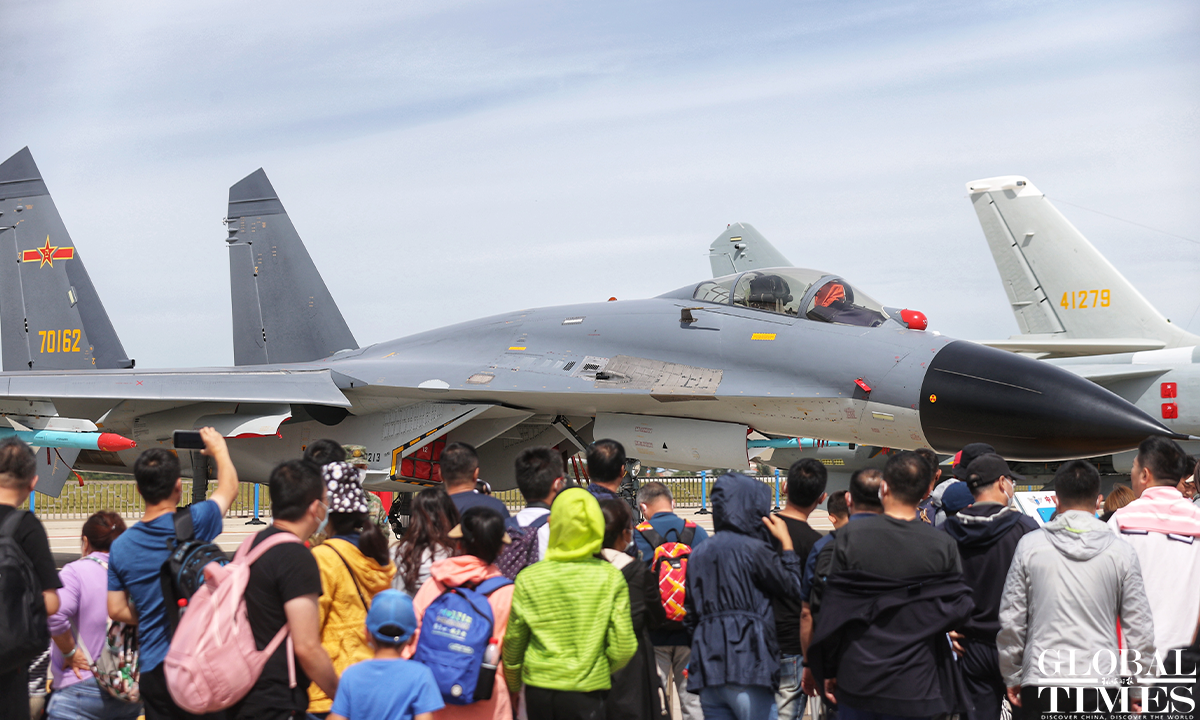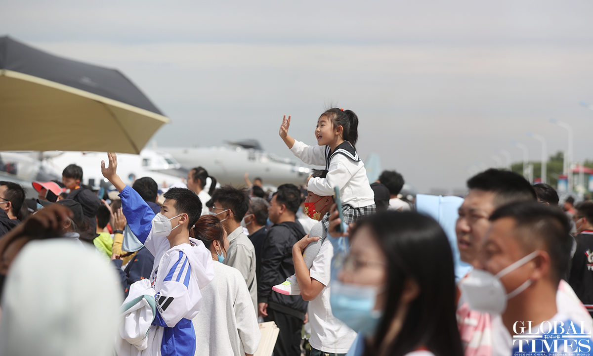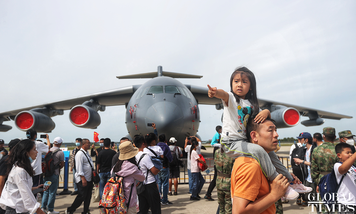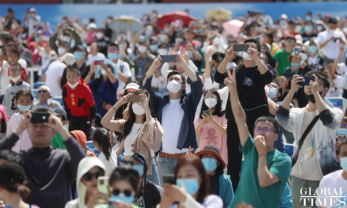 About 140,000 spectators gathered at Dafangshen Airport in Changchun for the PLA Air Force open day event on Sun. The audience was mesmerized by the flight performances of various types of aircraft and the display of star jets including YU-20, H-6, J-10C and KJ-500. Photo: Cui Meng figcaption >