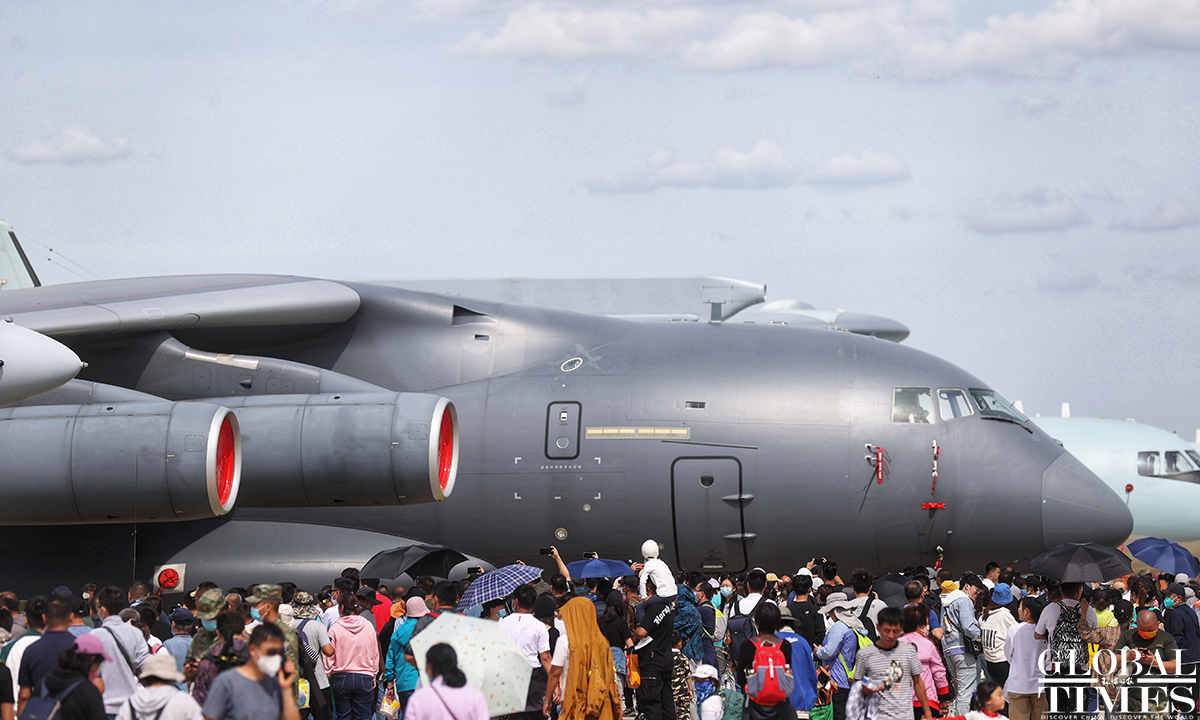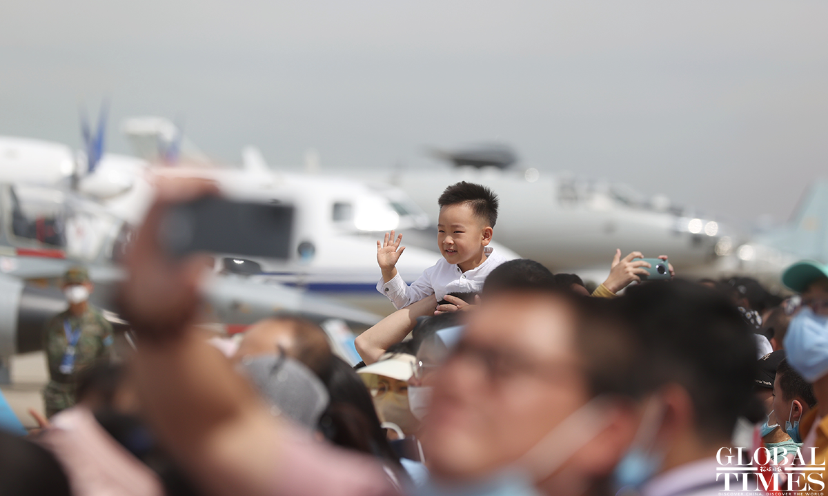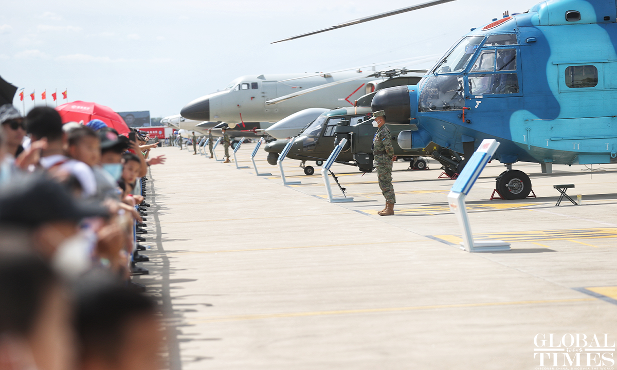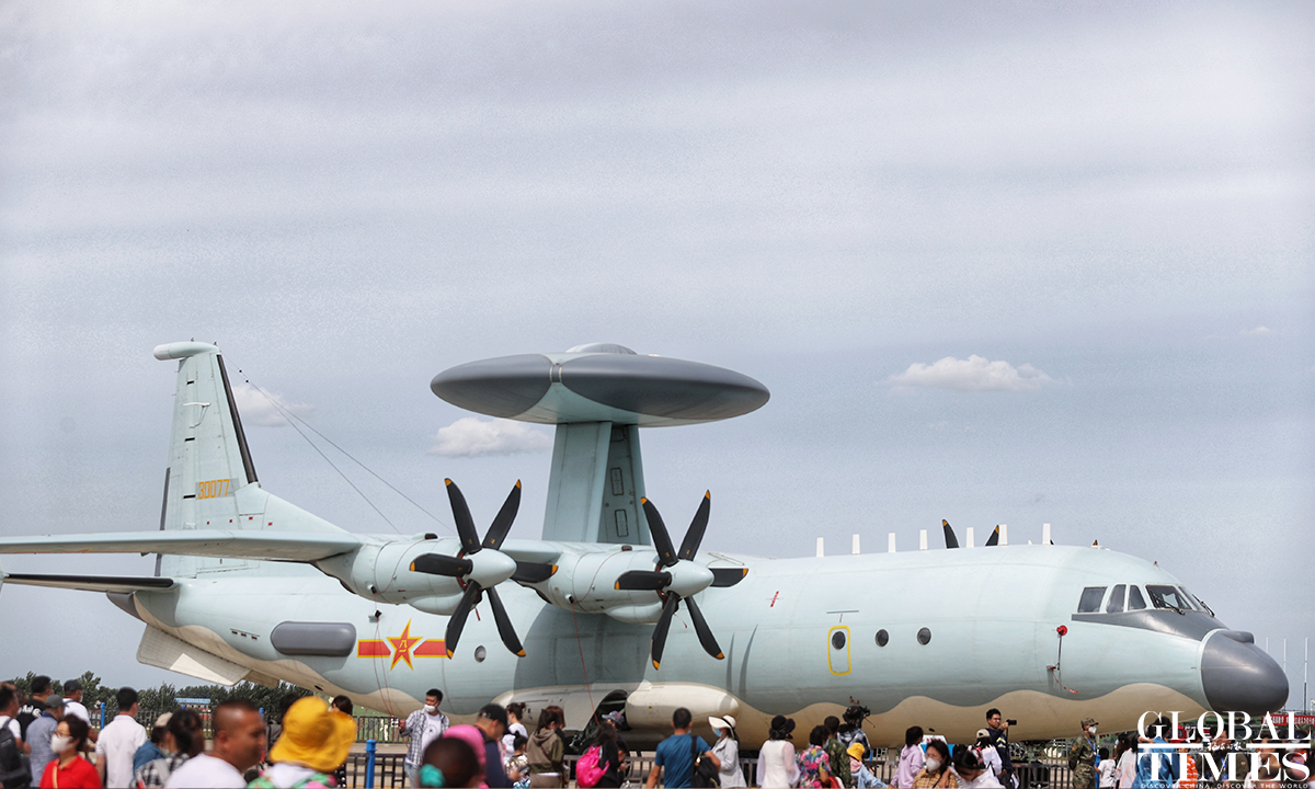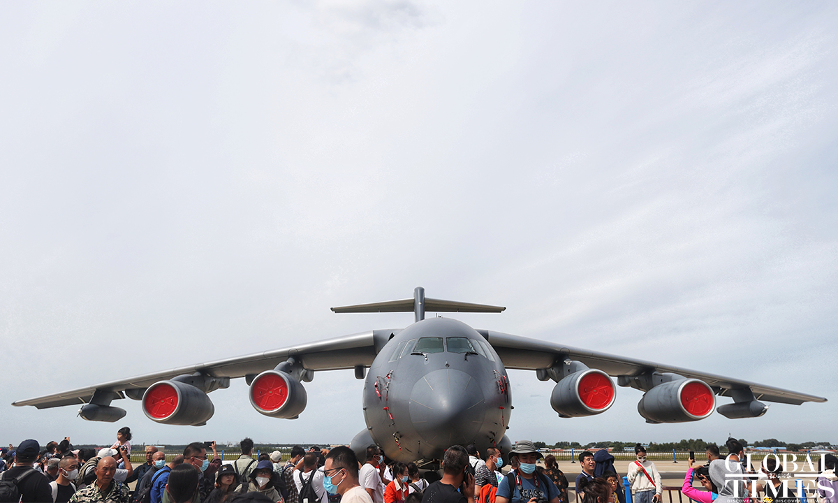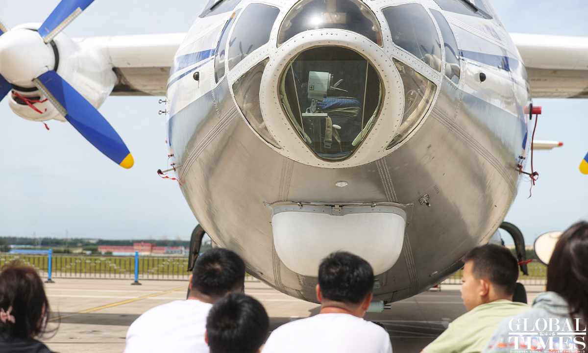 About 140,000 spectators gathered at Dafangshen Airport in Changchun for the PLA Air Force open day event on Sun. The audience was mesmerized by the flight performances of various types of aircraft and the display of star jets including YU-20, H-6, J-10C and KJ-500. Photo: Cui Meng figcaption >