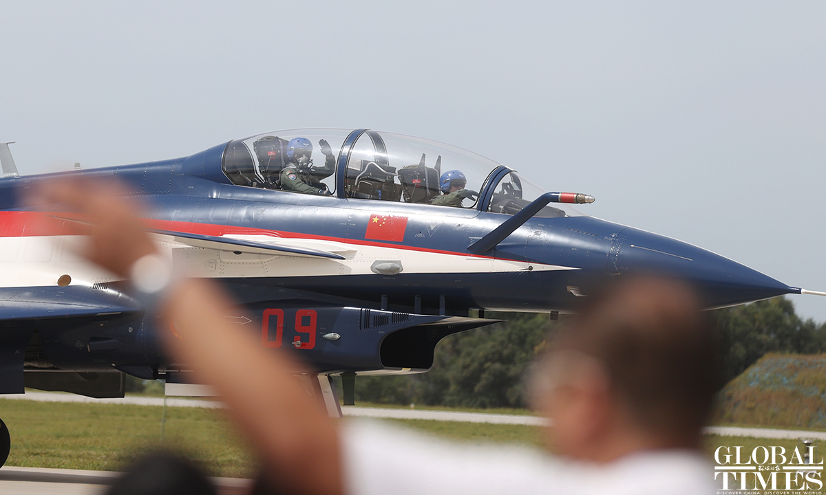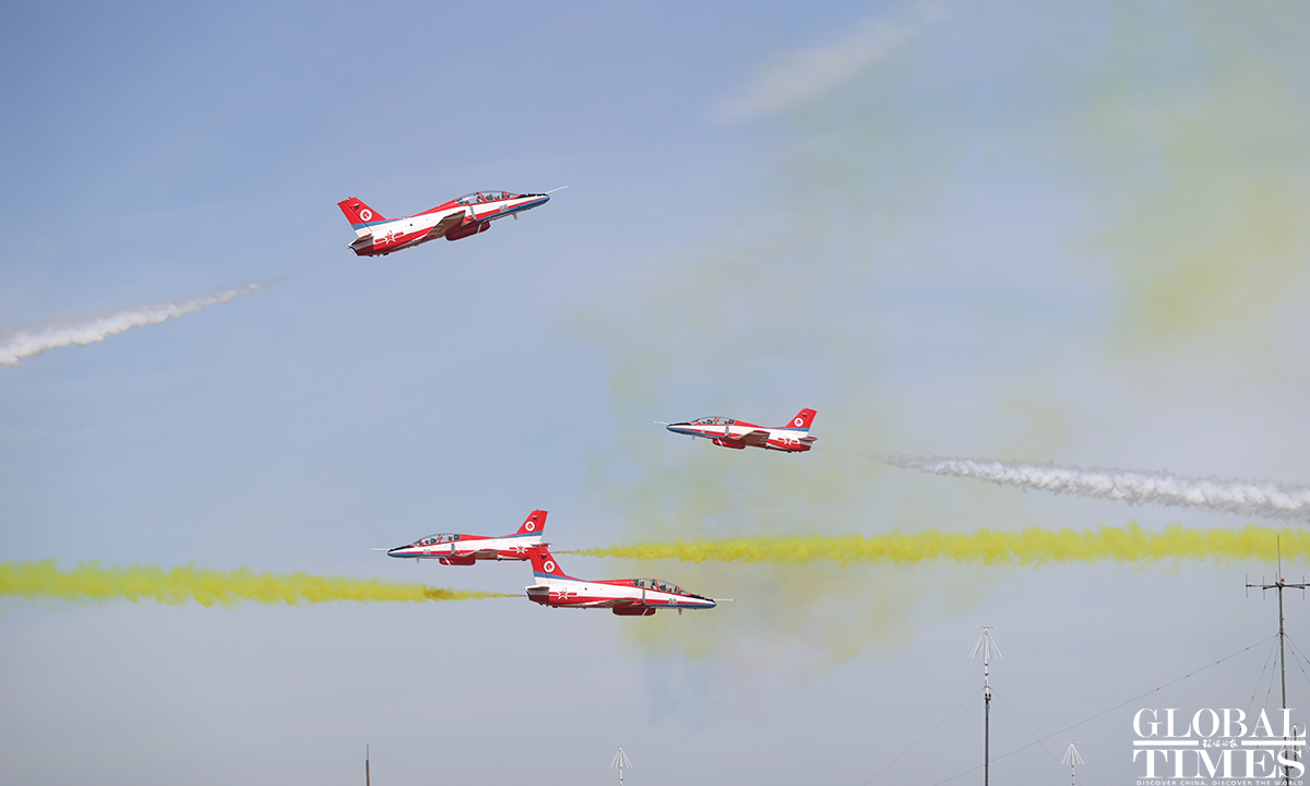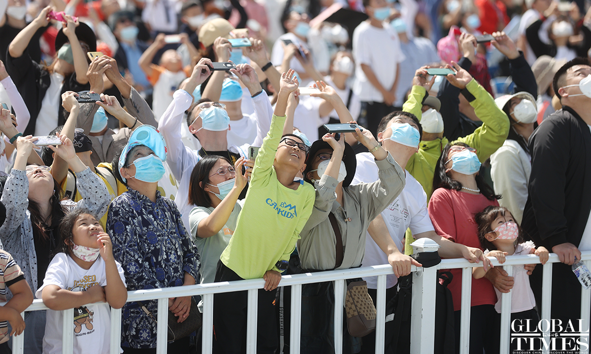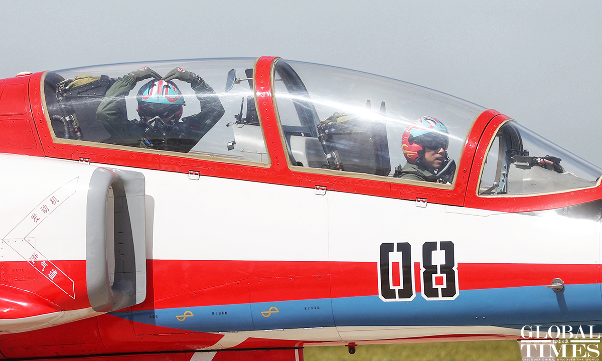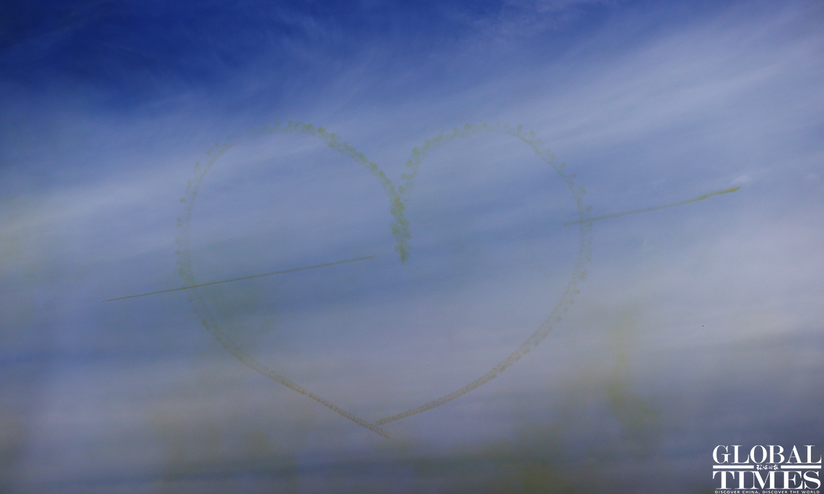 Pilots wow spectators with heart formation in the sky! About 140,000 spectators gathered at Dafangshen Airport in Changchun for the PLA Air Force open day event on Sun. The audience was mesmerized by the flight performances of various types of aircraft and the display of star jets including YU-20, H-6, J-10C and KJ-500. Photos: Cui Meng/GT