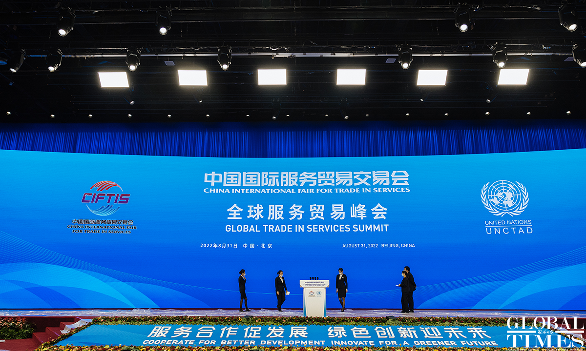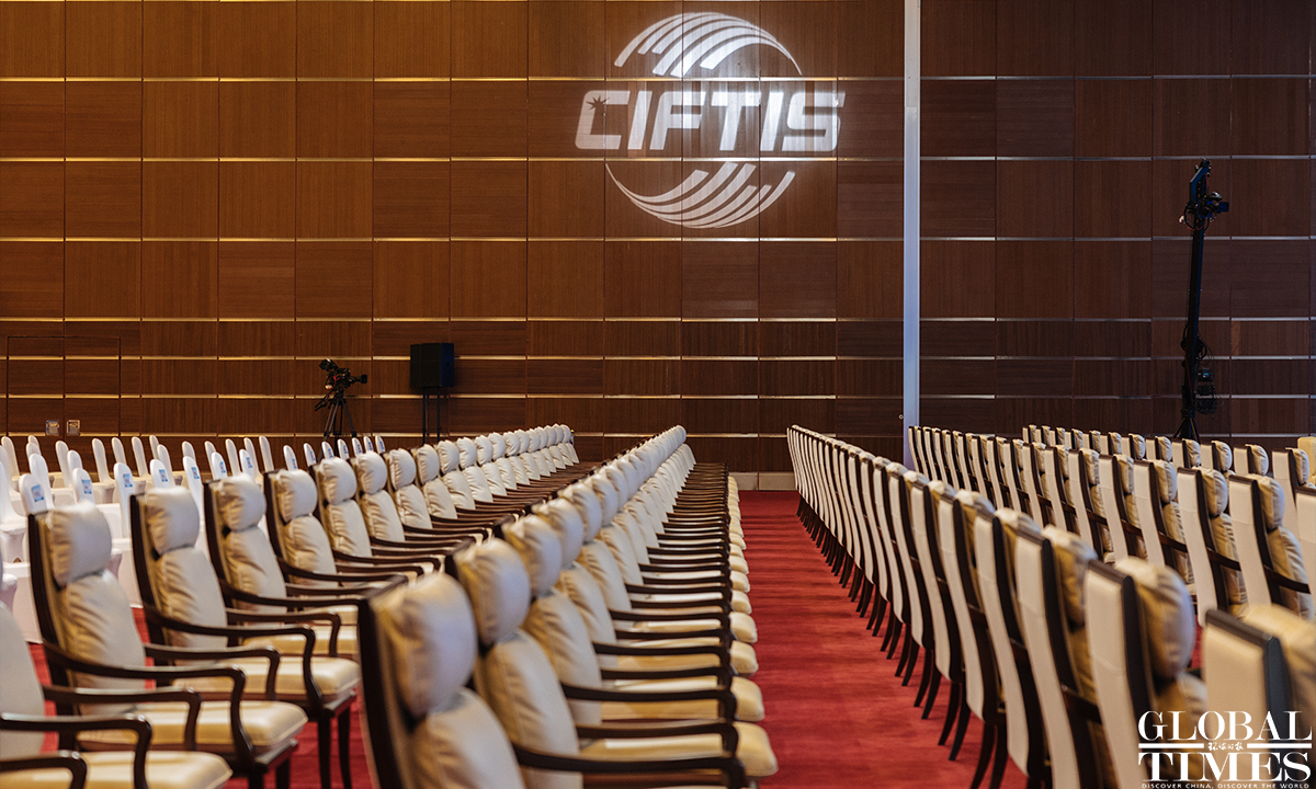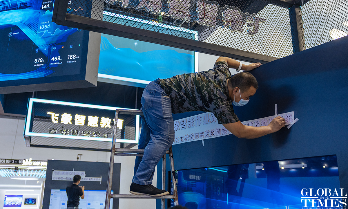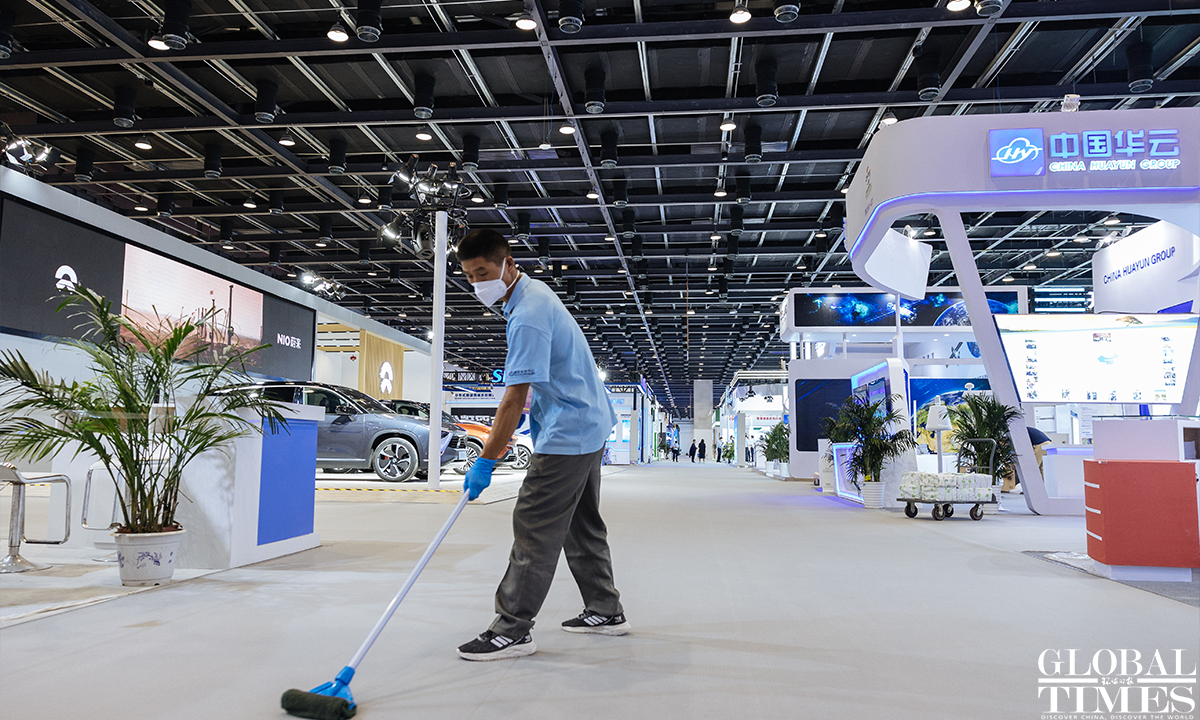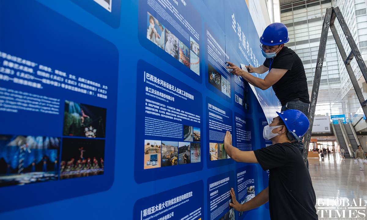 The 2022 China International Fair for Trade in Services (CIFTIS) is set to kick off on Aug 31 in Beijing. Staff members can be seen arranging the exhibits at the exhibition hall of the National Convention Center on Monday. Photos: Li Hao/GT