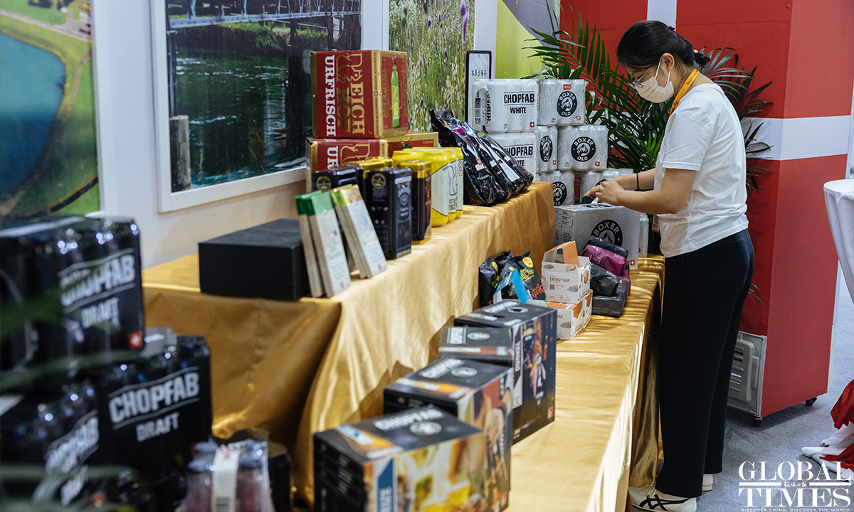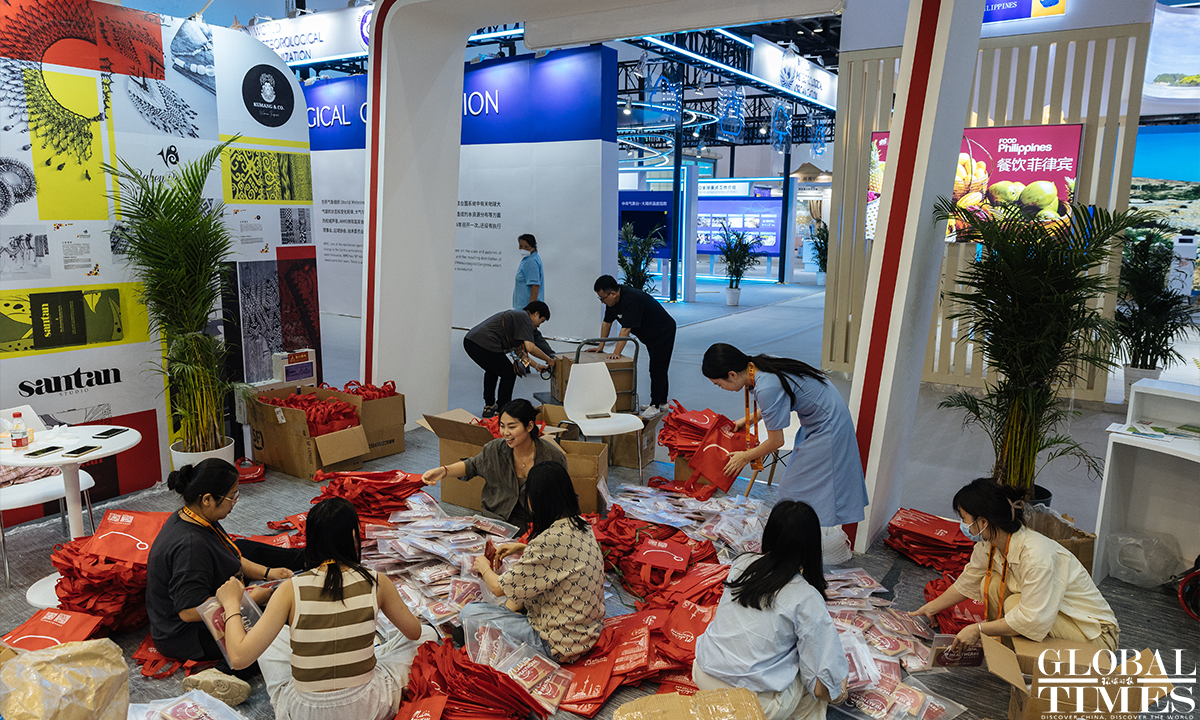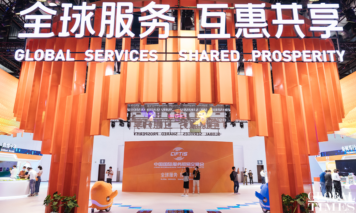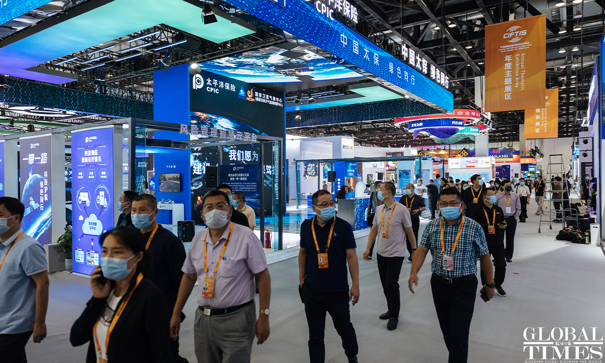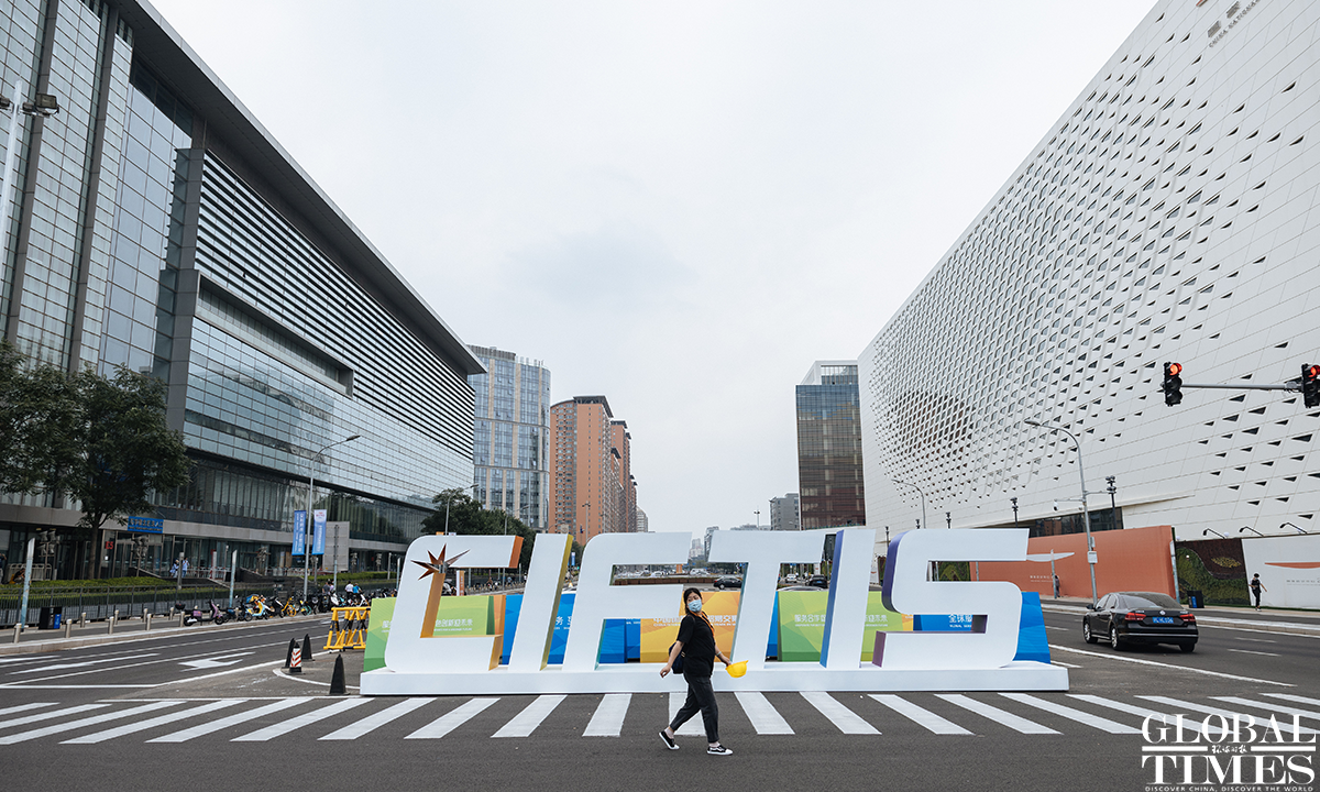 The 2022 China International Fair for Trade in Services (CIFTIS) is set to kick off on Aug 31 in Beijing. Staff members can be seen arranging the exhibits at the exhibition hall of the National Convention Center on Monday. Photos: Li Hao/GT