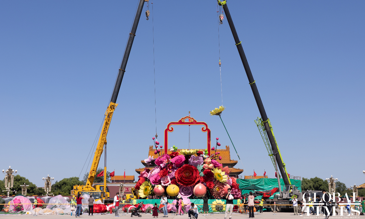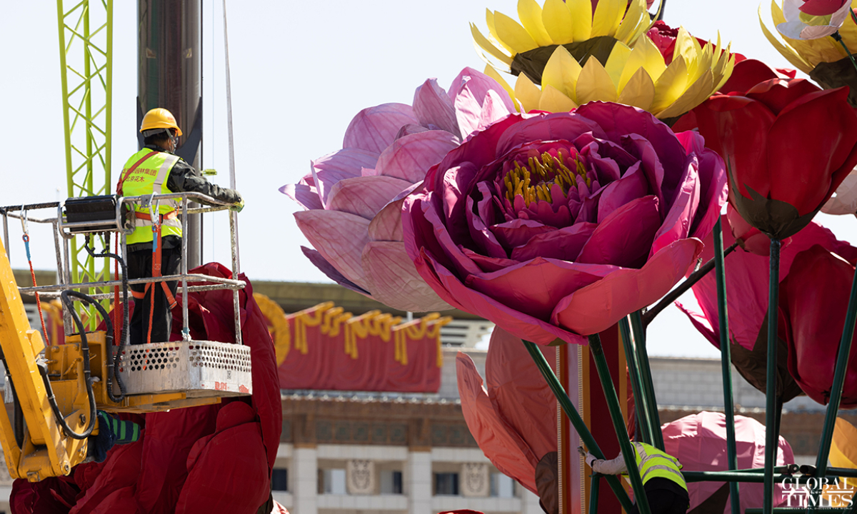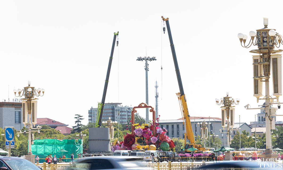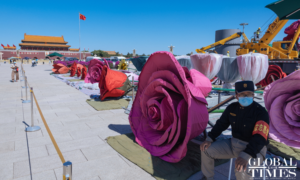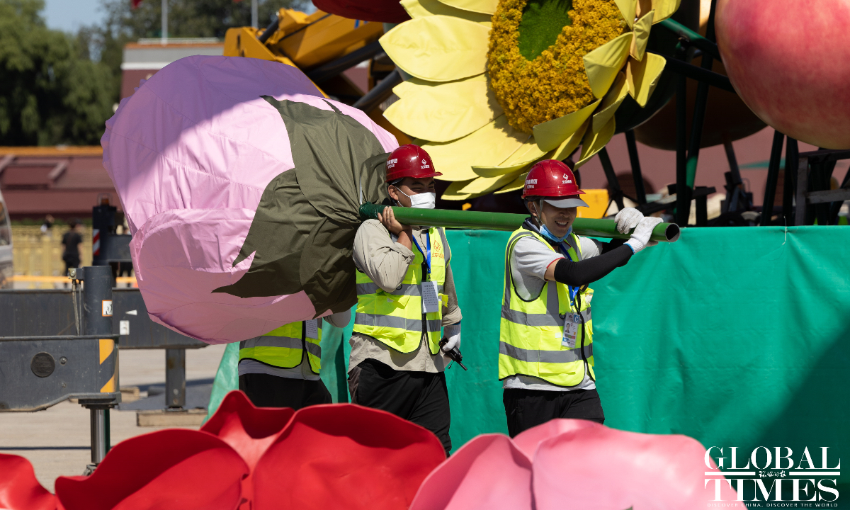 On Wednesday, workers are seen busily preparing decorative flowers in Tiananmen Square in Beijing in preparation for celebrations for the upcoming National Day on October 1. (Photos: Li Hao/GT)