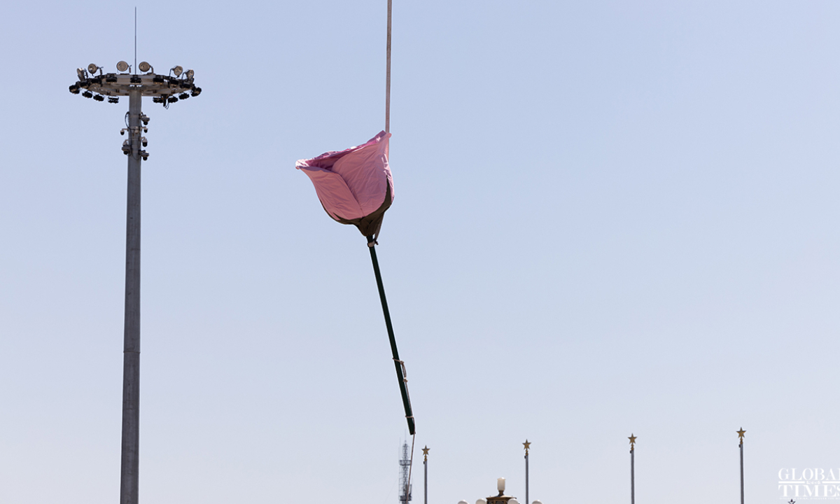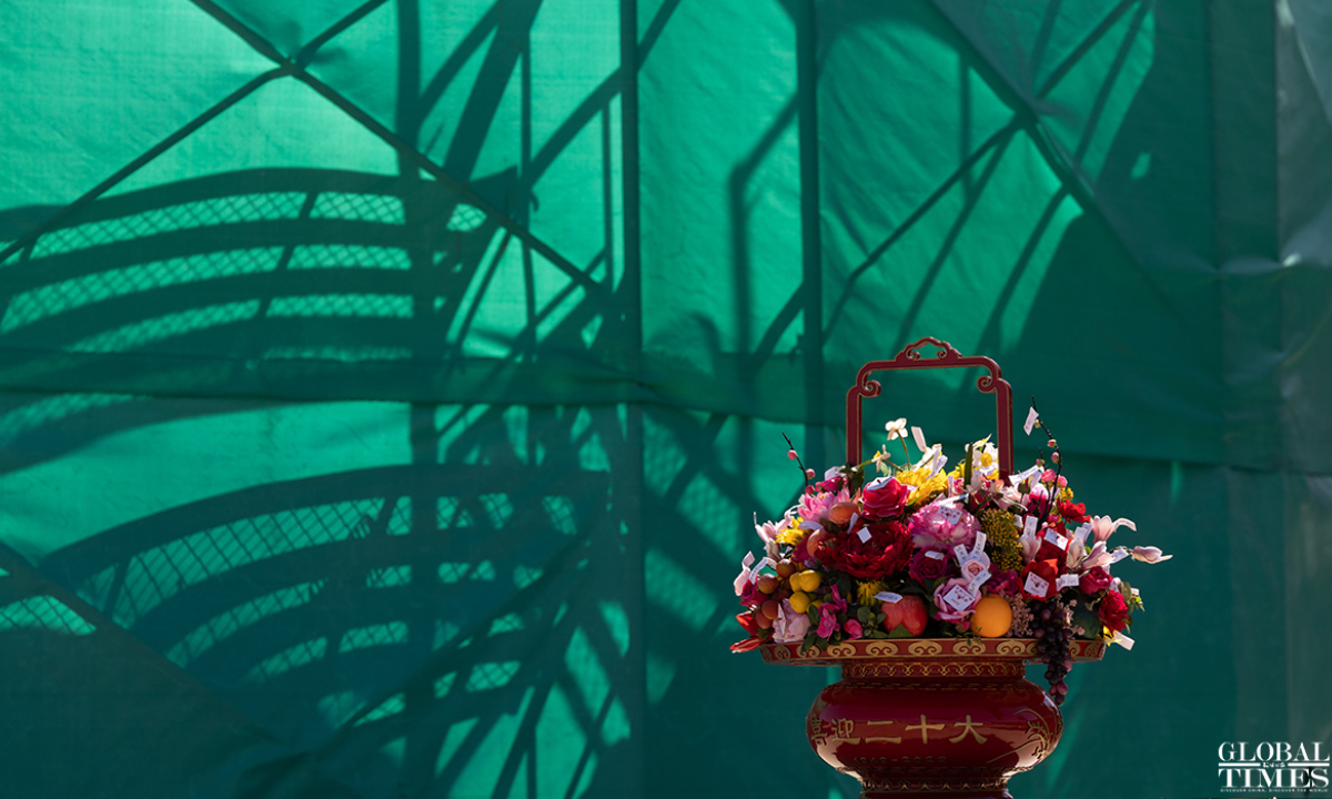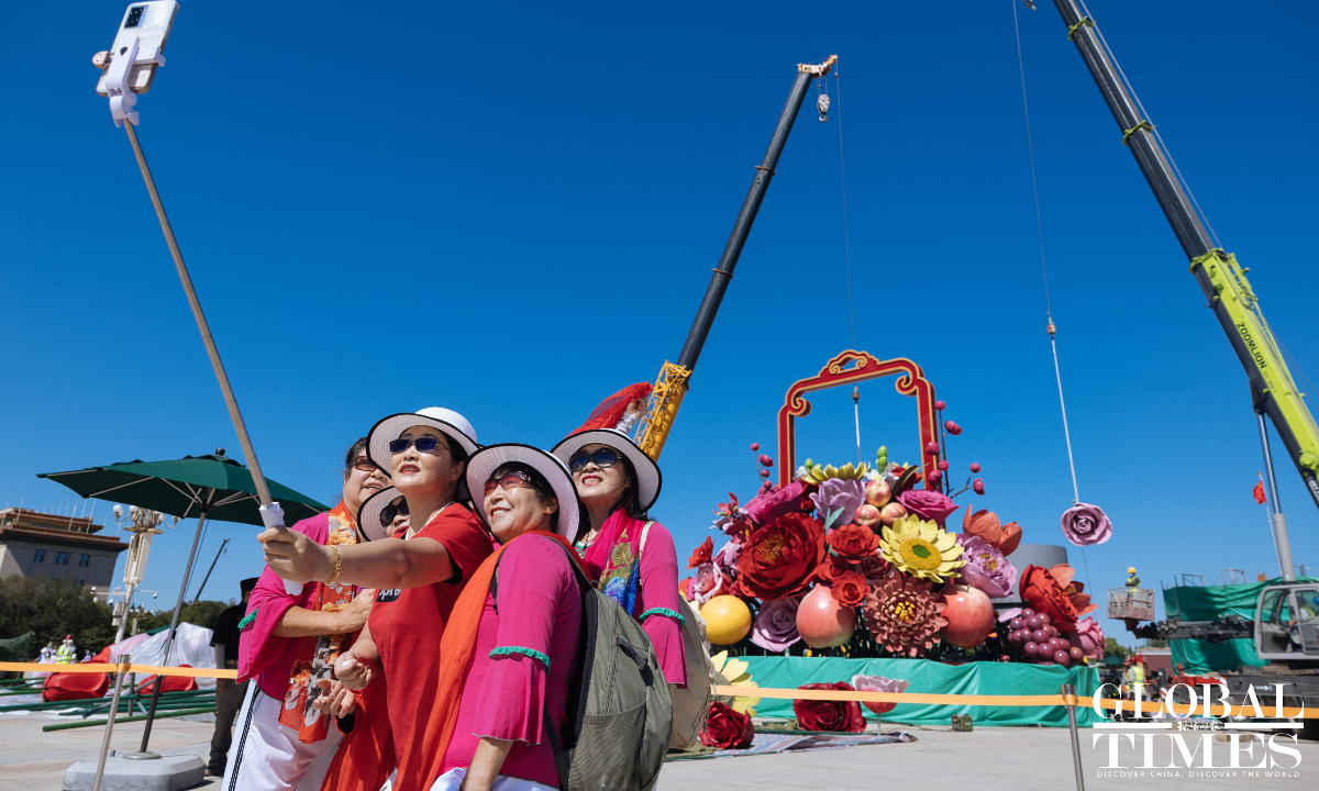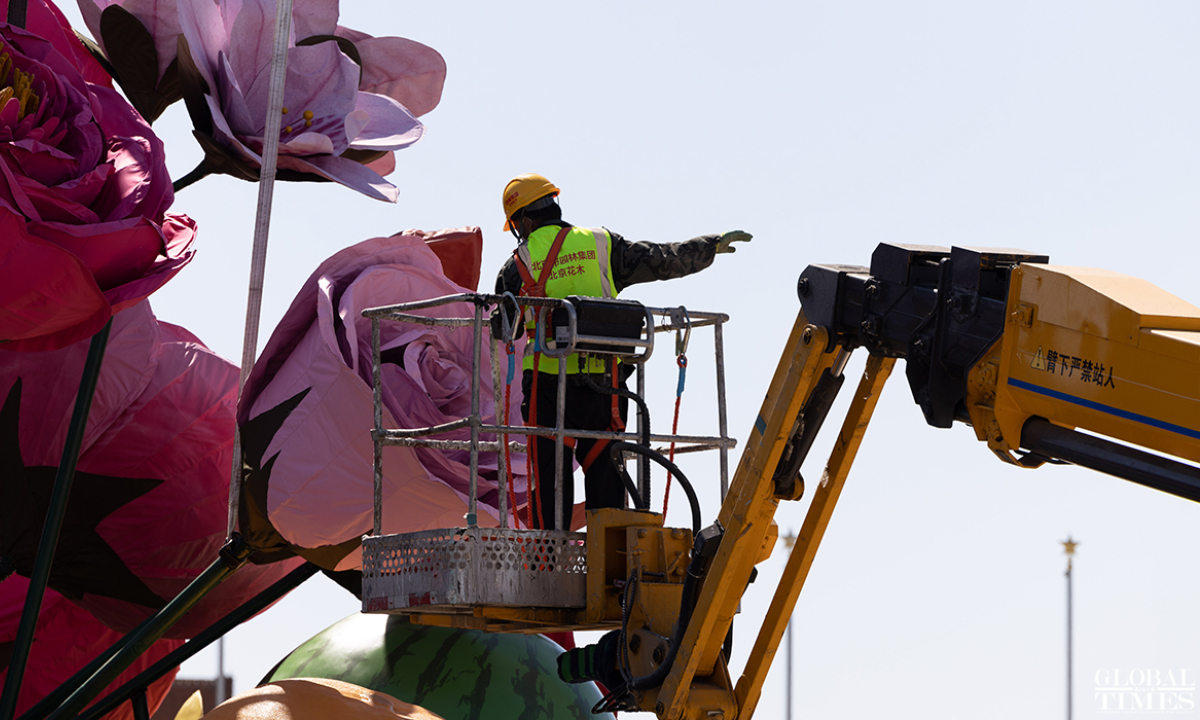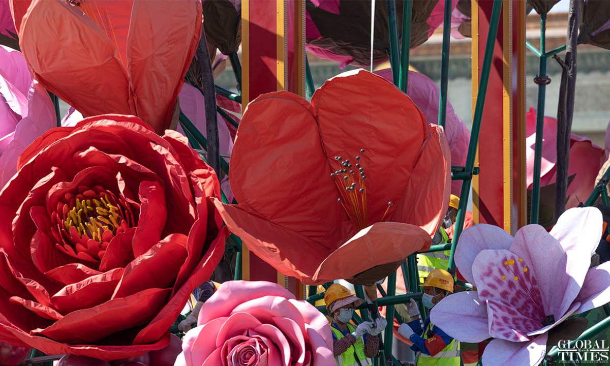 On Wednesday, workers are seen busily preparing decorative flowers in Tiananmen Square in Beijing in preparation for celebrations for the upcoming National Day on October 1. (Photos: Li Hao/GT)