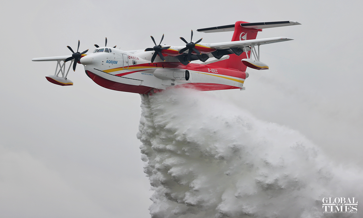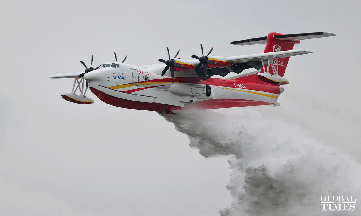 China's first homegrown large jetliner, the C919, and China's self-developed new-configuration amphibious firefighting aircraft, the AG600M, were showcased at the 14th Airshow China in Zhuhai, South China’s Guangdong Province, on November 8, 2022. Photos: Cui Meng/GT