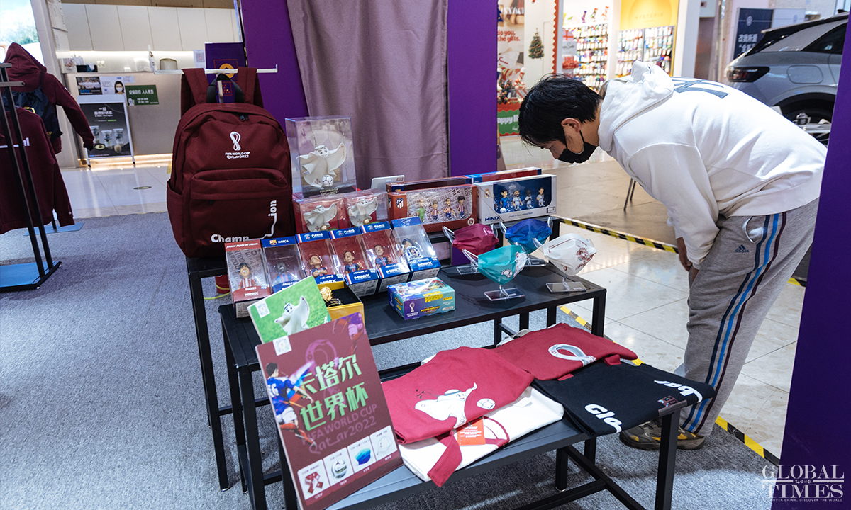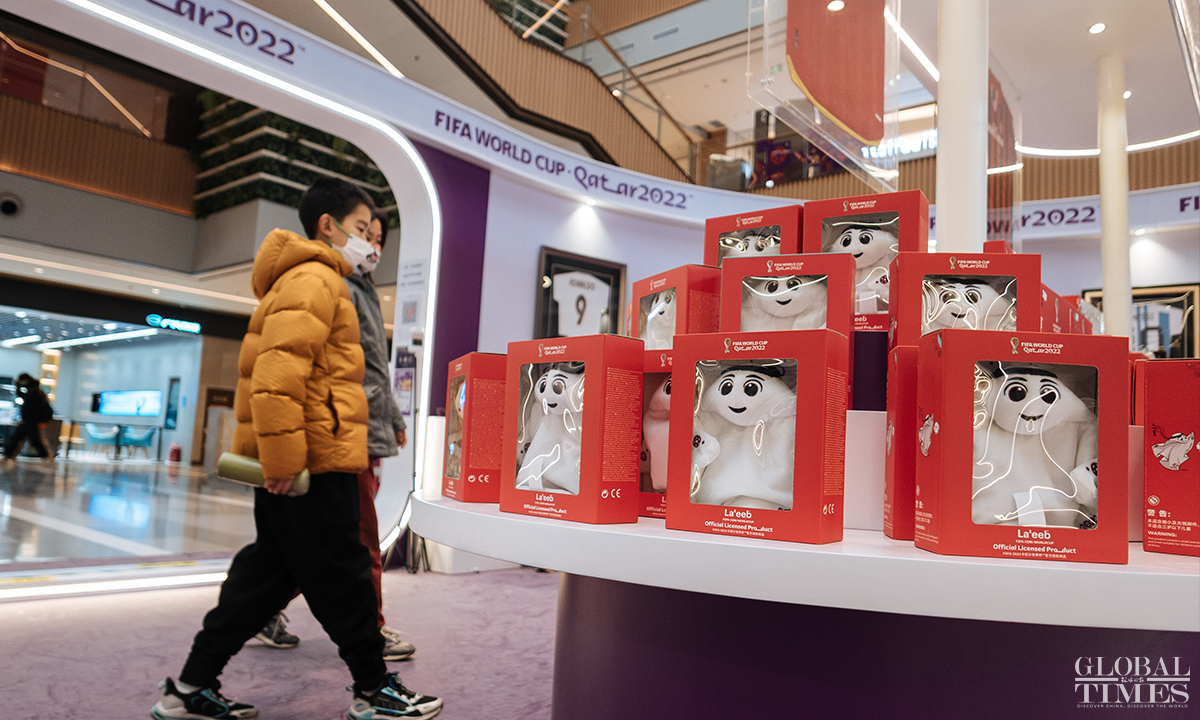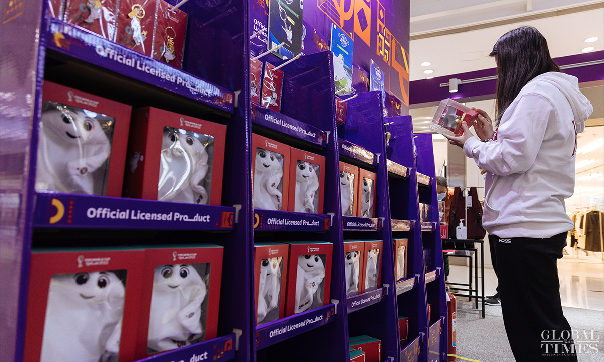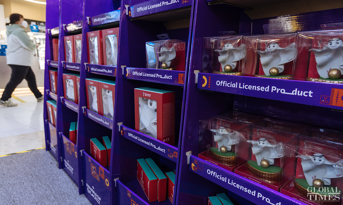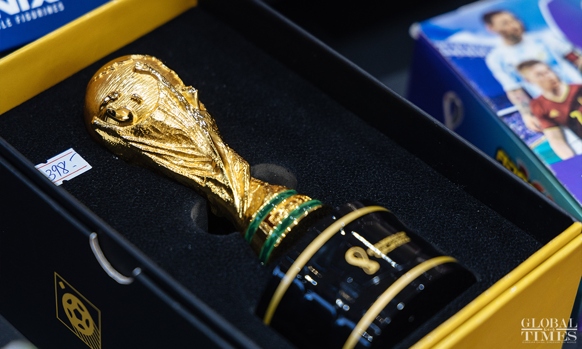 As the Qatar World Cup is in full swing, authorized merchandise is now available in Beijing shopping malls. Sixty percent of the products are made in China, which include Mascot La’eeb, trophies and flags. Jerseys signed by the top 10 golden ball players are also on display. (Photos: Li Hao/GT)