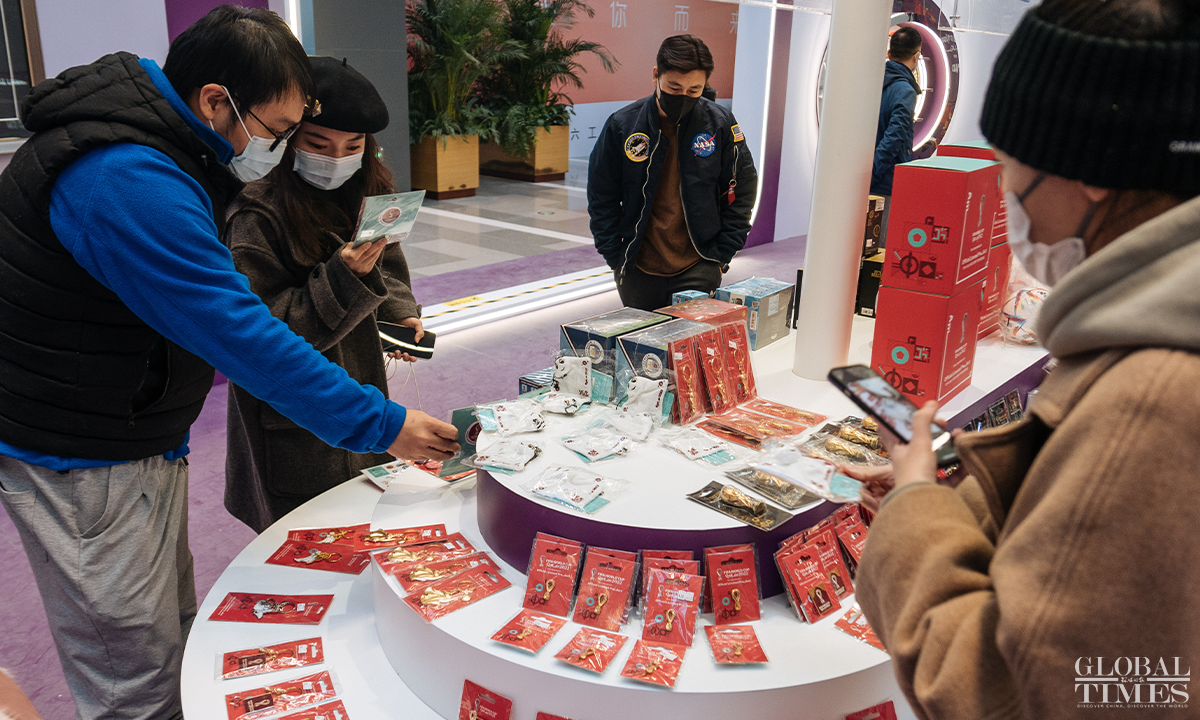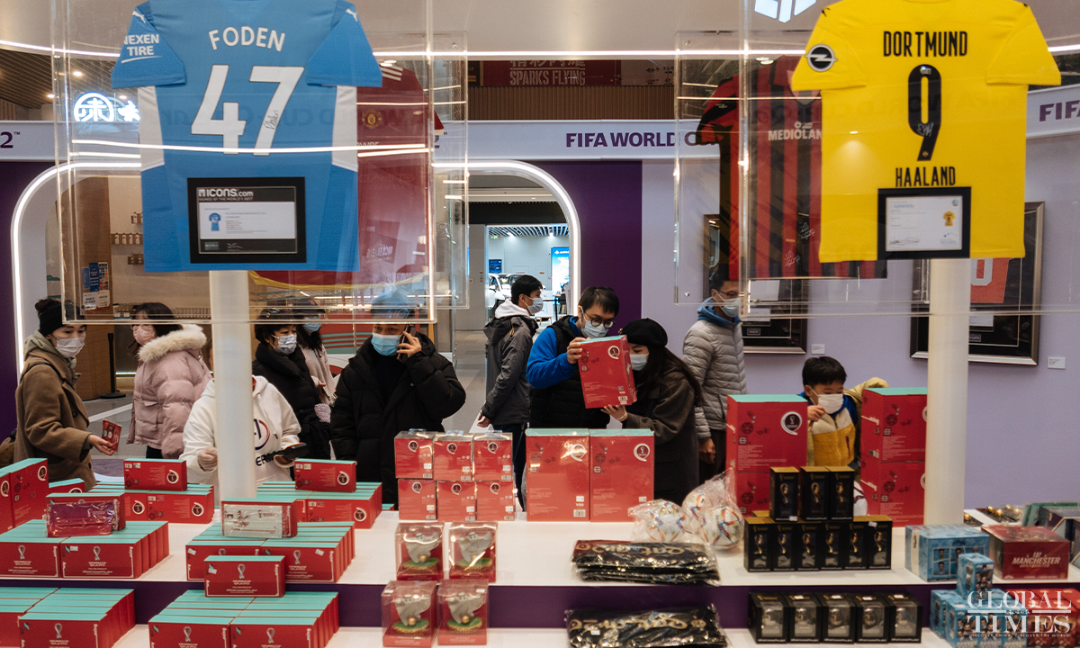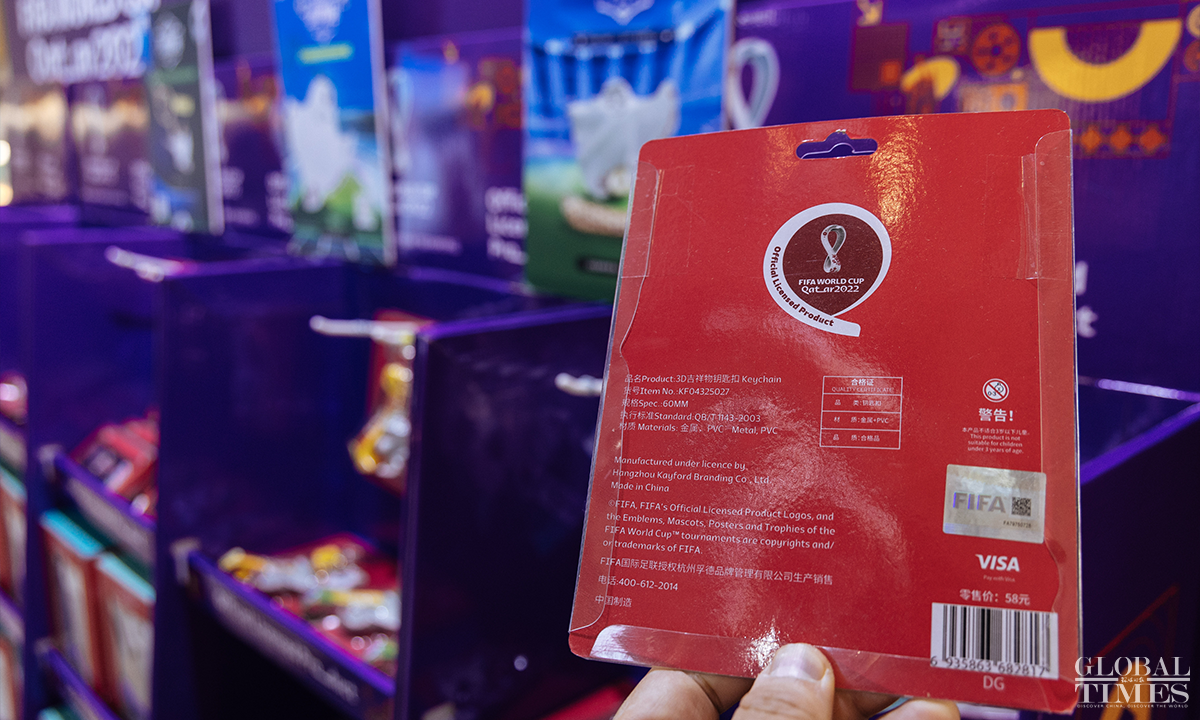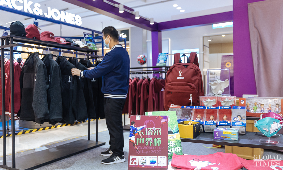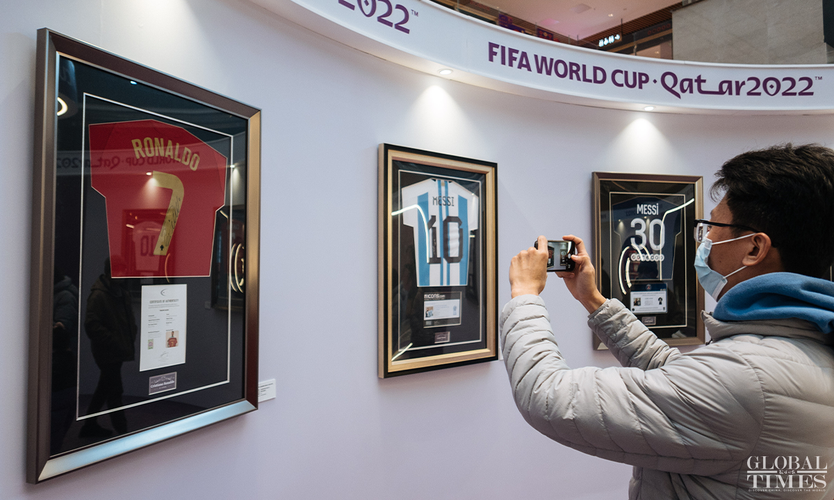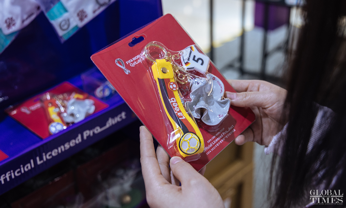 As the Qatar World Cup is in full swing, authorized merchandise is now available in Beijing shopping malls. Sixty percent of the products are made in China, which include Mascot La’eeb, trophies and flags. Jerseys signed by the top 10 golden ball players are also on display. (Photos: Li Hao/GT)