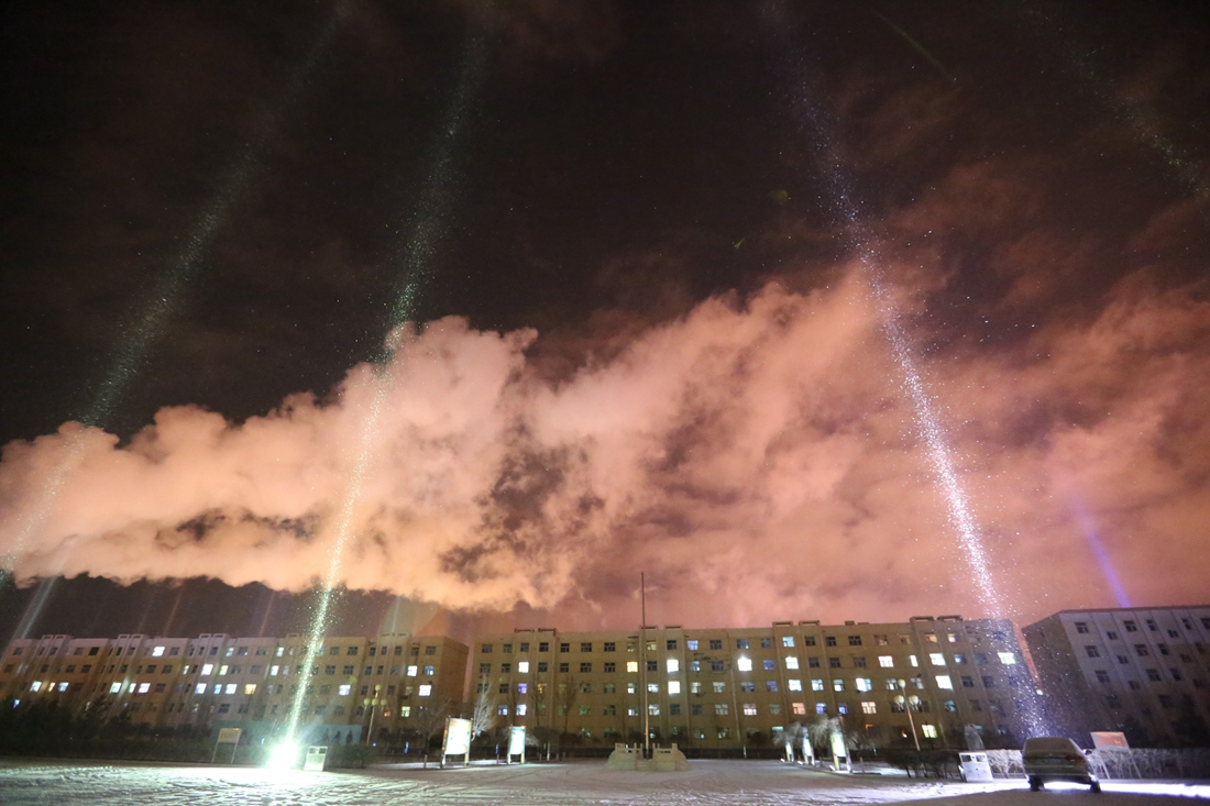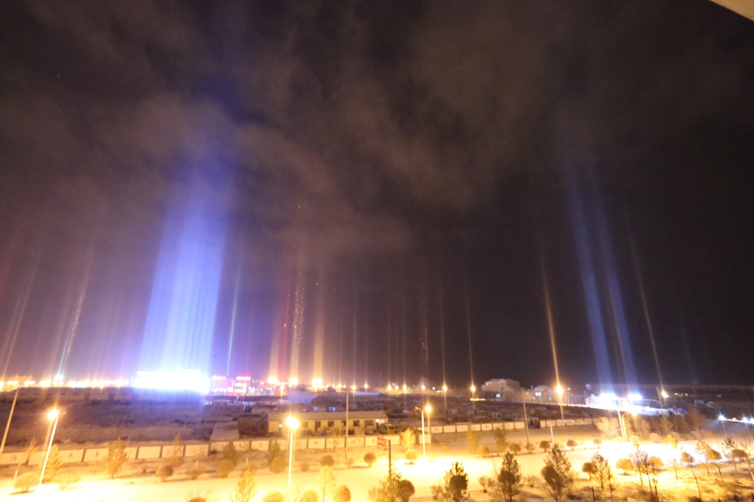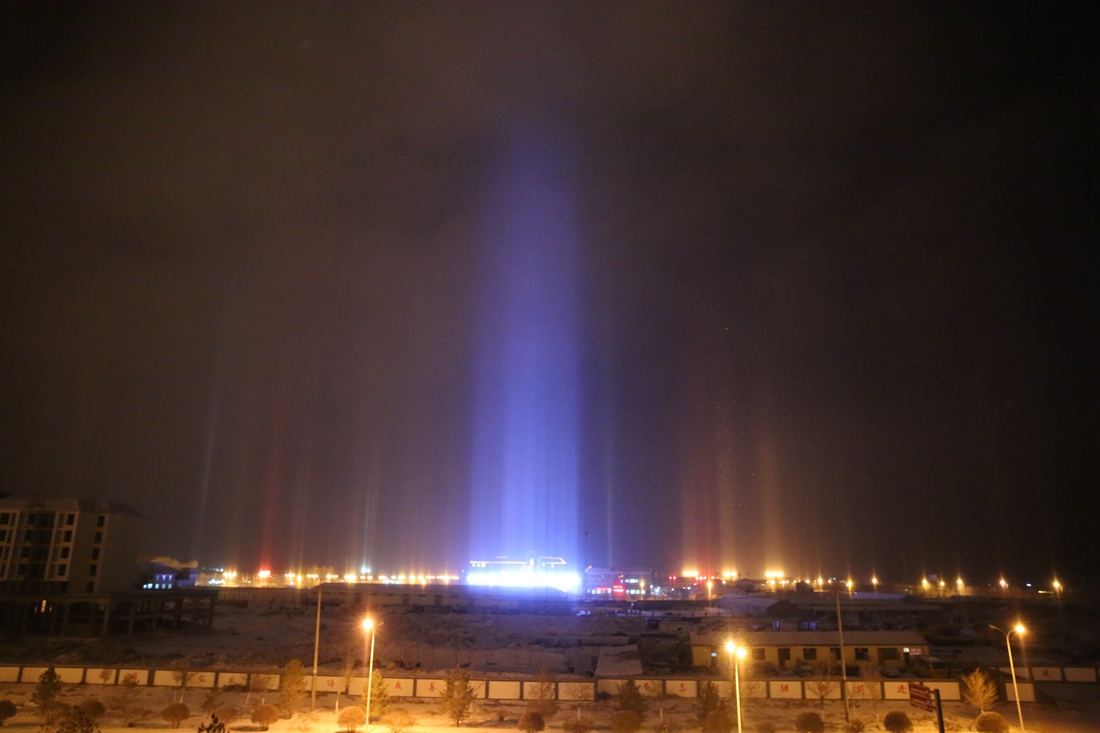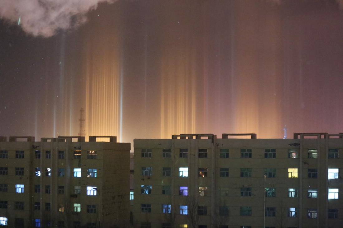 Sun pillars, or light pillars, dominated the night sky in Xilin Gol League in North China’s Inner Mongolia Autonomous Region on December 26, 2016. This optical phenomenon is created by light reflecting off ice crystals falling through the atmosphere.