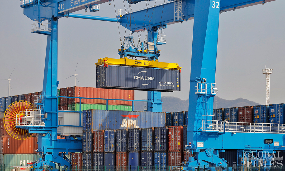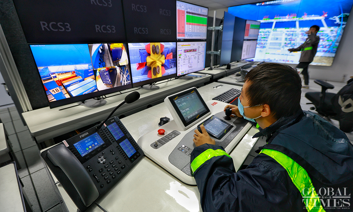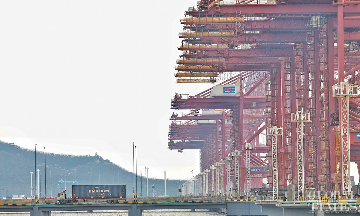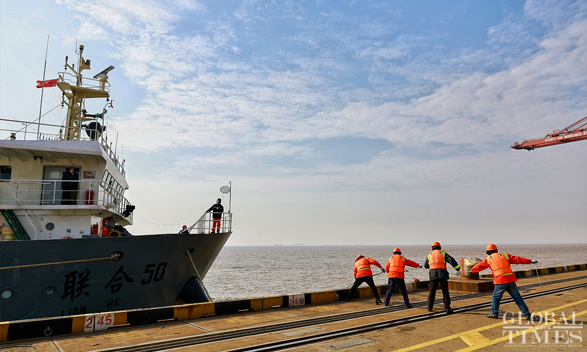 In 2022, Yongzhou container terminal at Jintang port area, East China’s Zhejiang Province completed a container throughput of 2 million TEUs, an increase of 47.31 percent compared to 2021. The expected container production target in 2023 is 2.3 million TEUs, an increase of 15 percent year-on-year. As a landmark port under the Belt and Road Initiative (BRI), the Jintang port area carries the important trade task of countries along the Belt and Road, connecting 46 major ports in 29 countries and regions along the route, including Africa, the Mediterranean, and Russia. Photos: Li Hao/GT