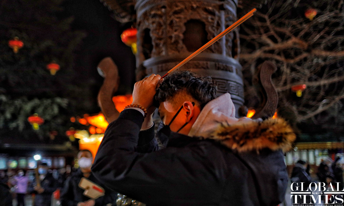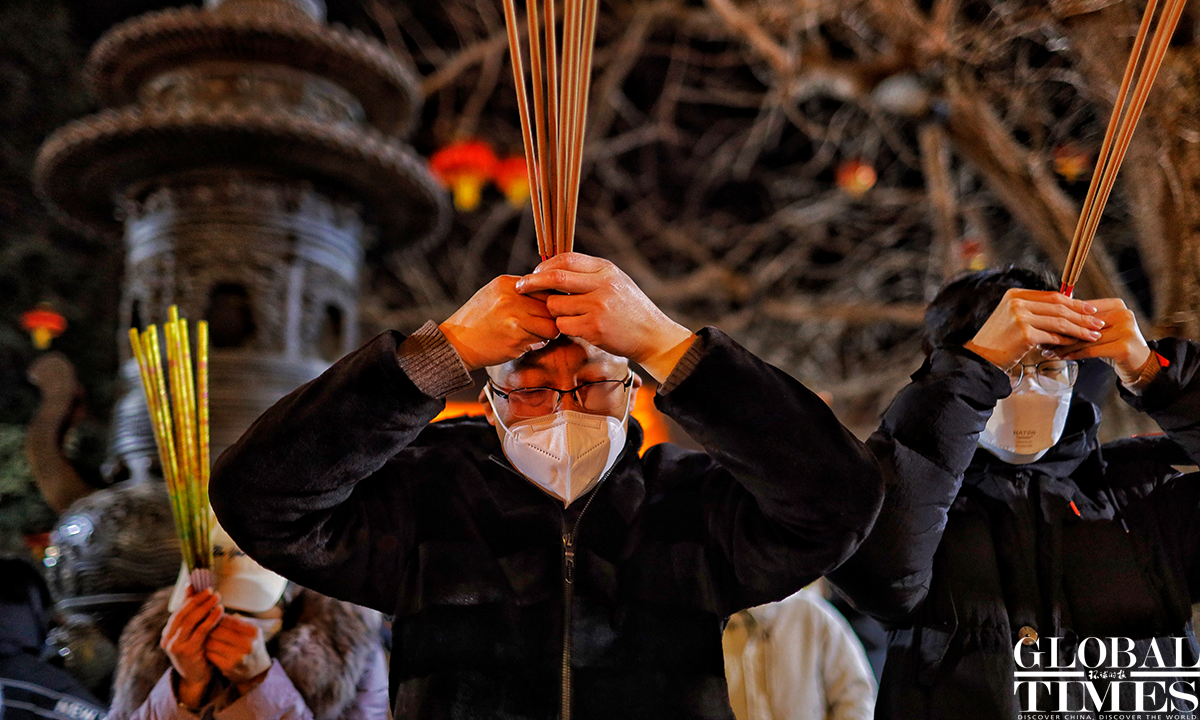 People burn incense and pray for good luck in the Chinese New Year – the Year of Rabbit – early morning on Sunday at the Lingguang Temple in Badachu Park in Beijing. This is the first time in three years that the Lingguang Temple resumed the praying for good luck activity during the Spring Festival as China has recently downgraded COVID-19 management. A huge influx of visitors were seen go to the temple at midnight, hoping to be the first to make an offering in the new year.