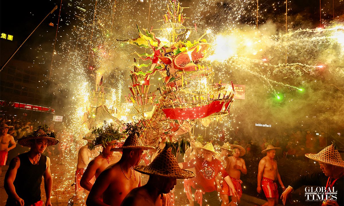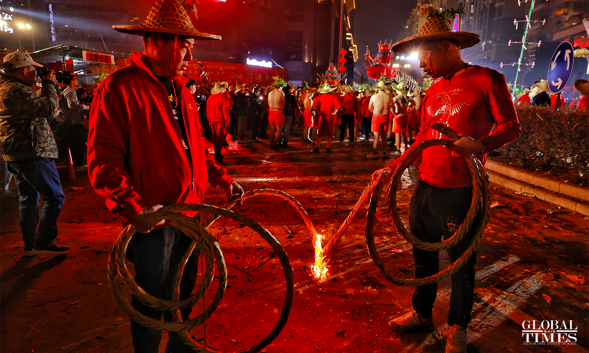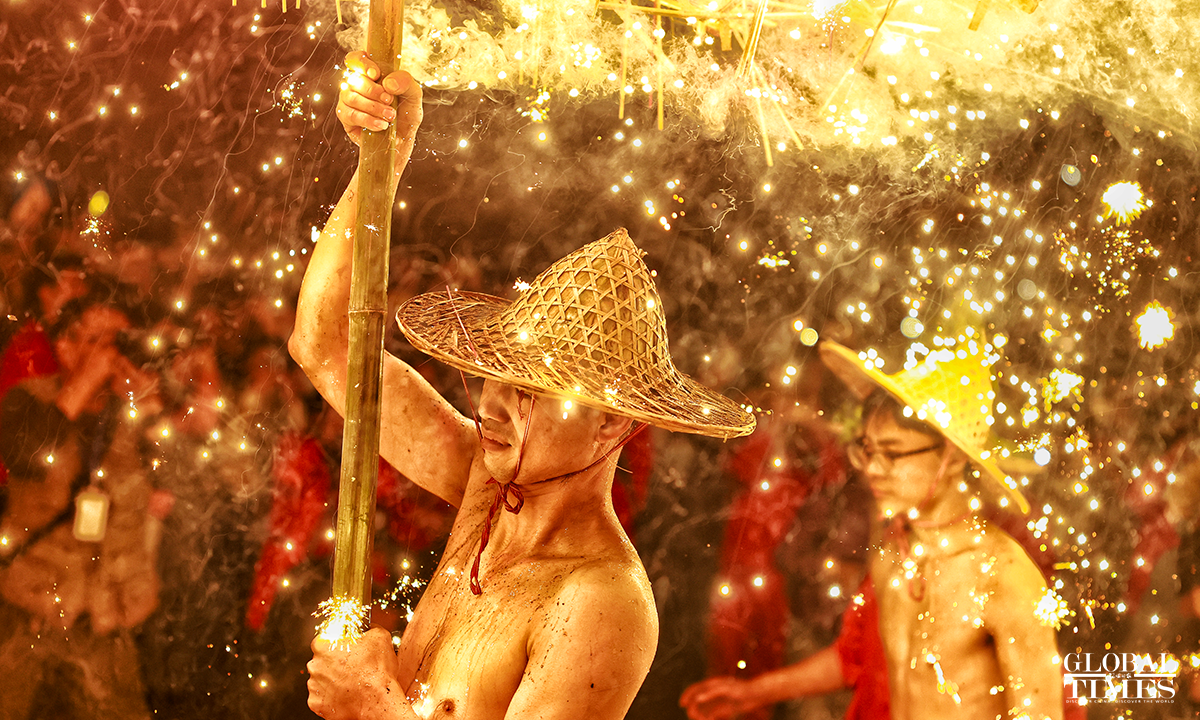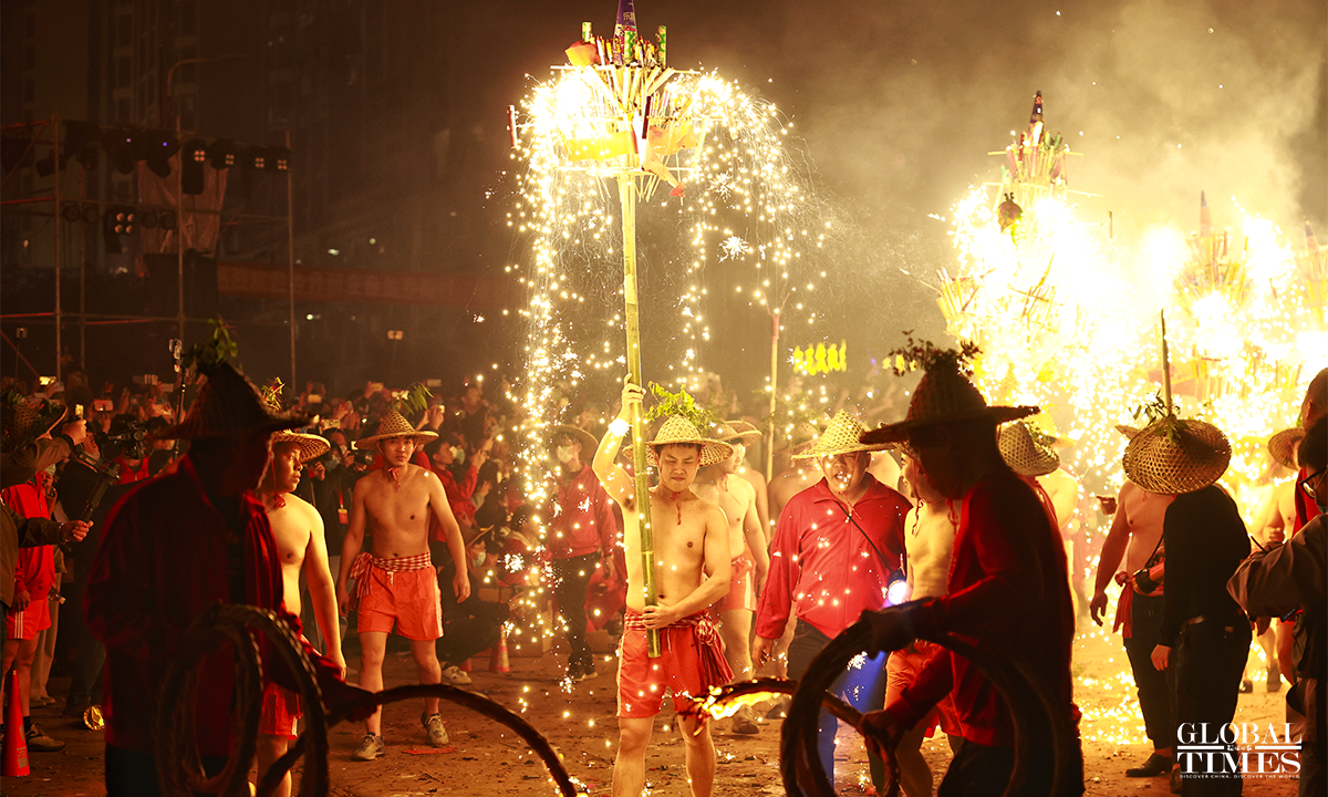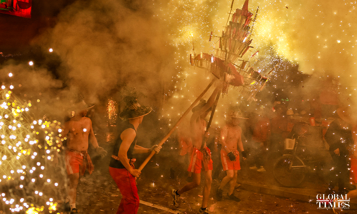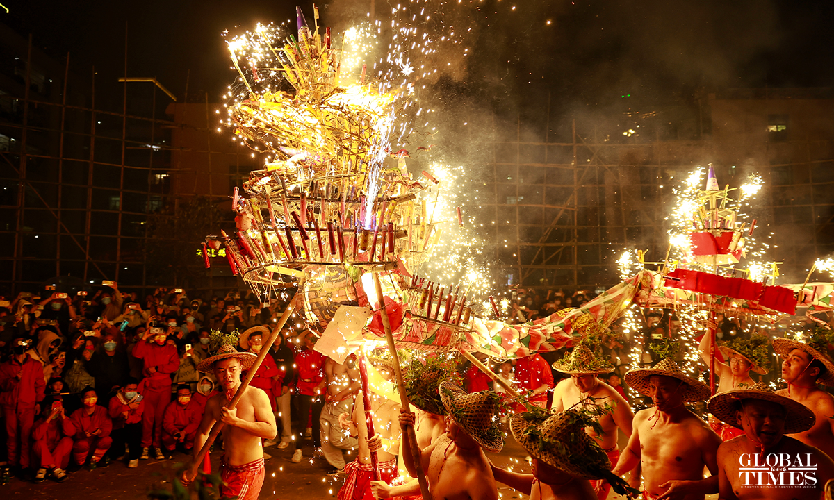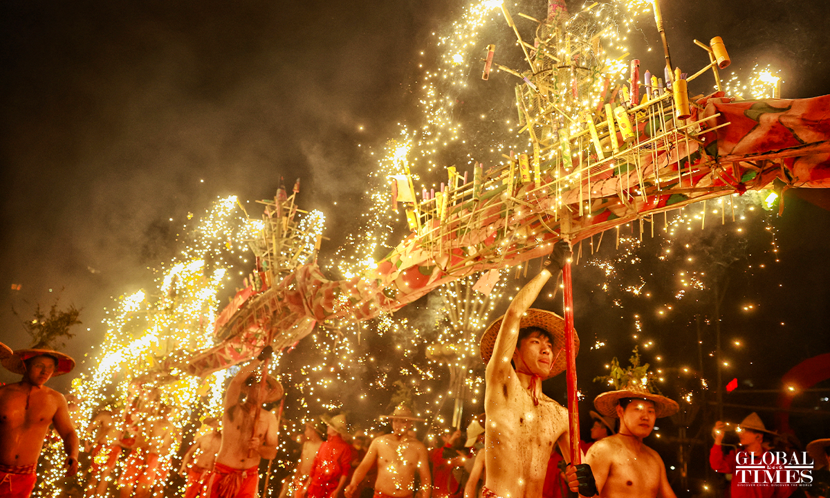 On January 31, 2023, the 10th day of the first lunar month, as part of the national intangible cultural heritage with a history of more than 600 years, a fire dragon show was performed with fireworks in Jieyang, South China’s Guangdong Province, showing the charm of cultural heritage and folk customs. Photos: Li Hao/GT