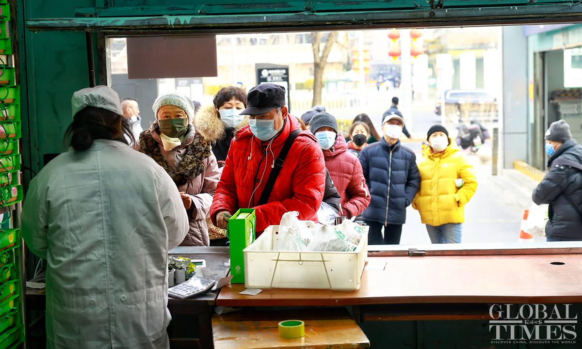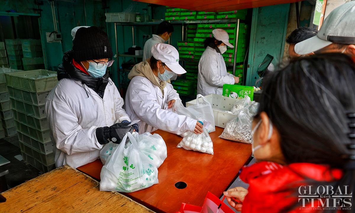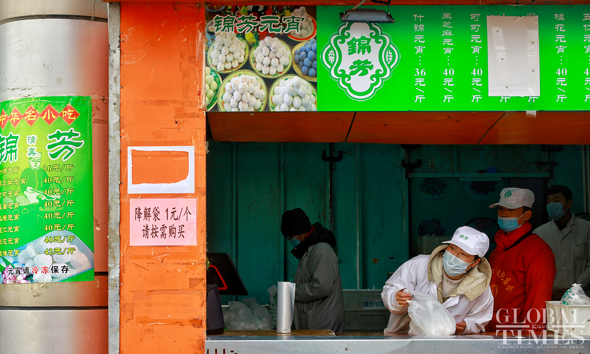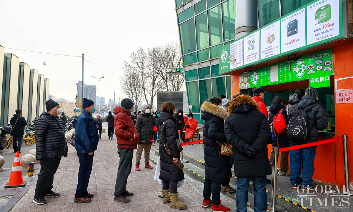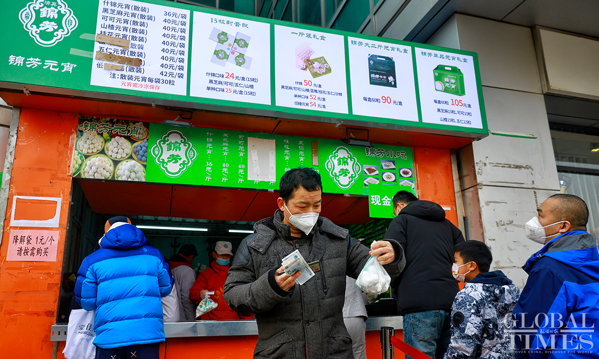 Numerous Beijing residents formed a long line in front of the Jinfang Snack shop in Ciqikou to buy Yuanxiao, glutinous rice flour dumplings with sweetened stuffing eaten on the Lantern Festival on February 5, 2023. To many longtime Beijing residents, Yuanxiao at Jinfang Snack is one of the indispensable traditional foods on the 15th day of the first lunar month every year. Photos: Li Hao/GT