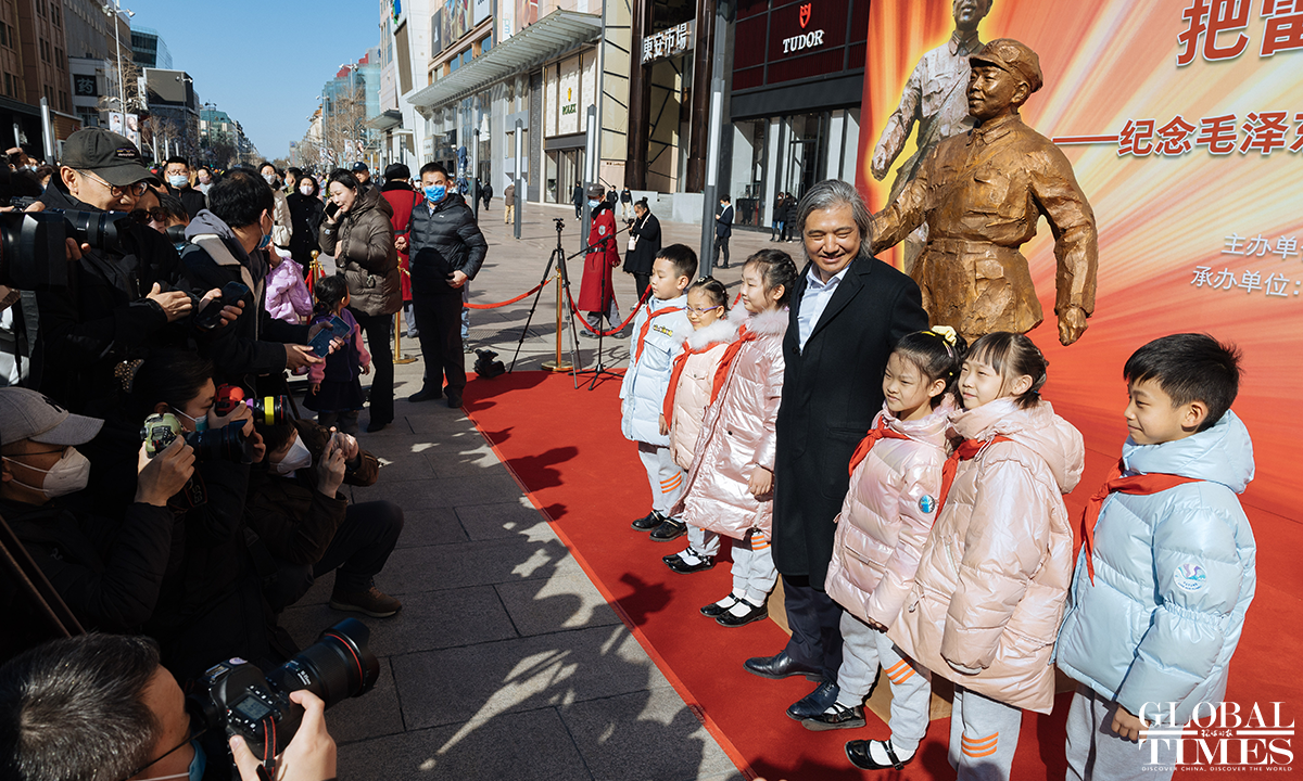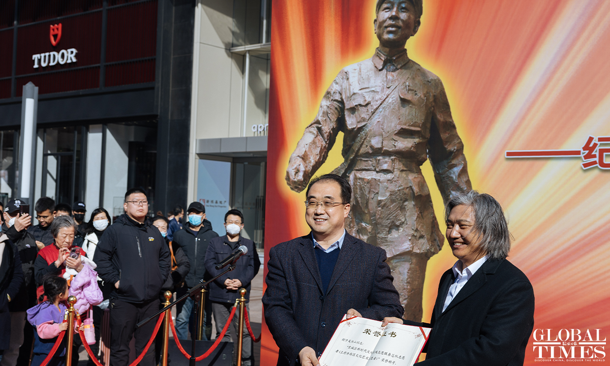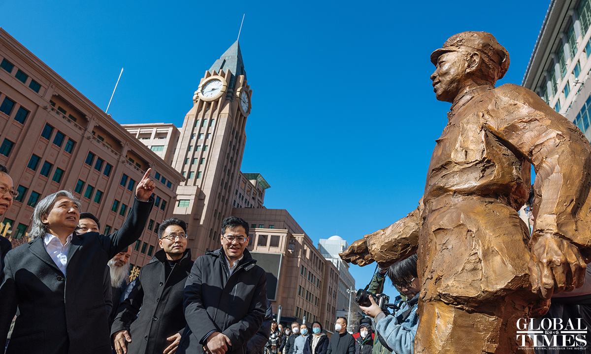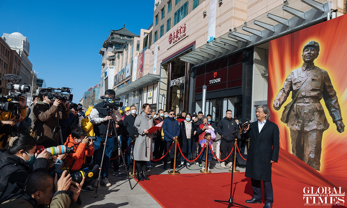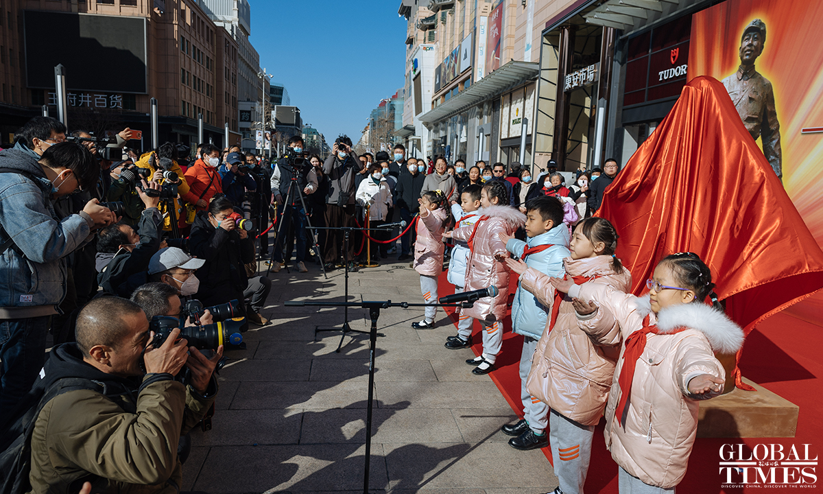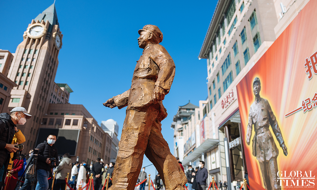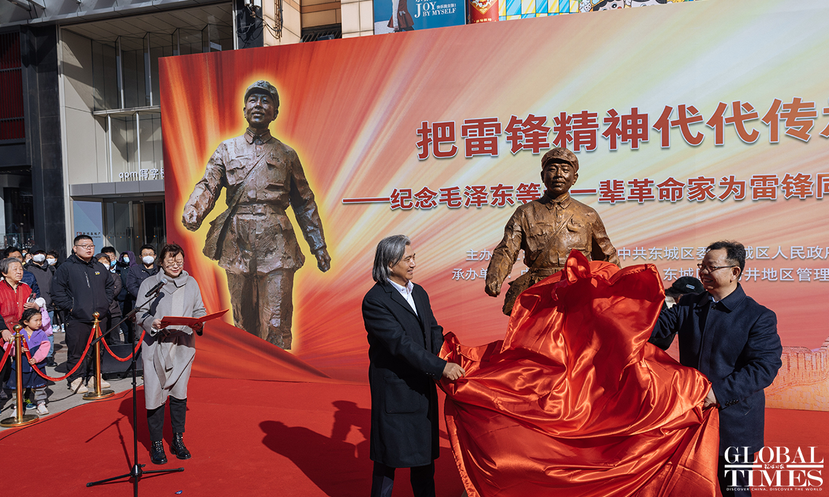 The statue of Chinese model soldier Lei Feng was unveiled on Wednesday at Beijing’s downtown Wangfujing Street to mark the 60th anniversary of the call to learn from Lei Feng by Mao Zedong and other older generation revolutionaries.
