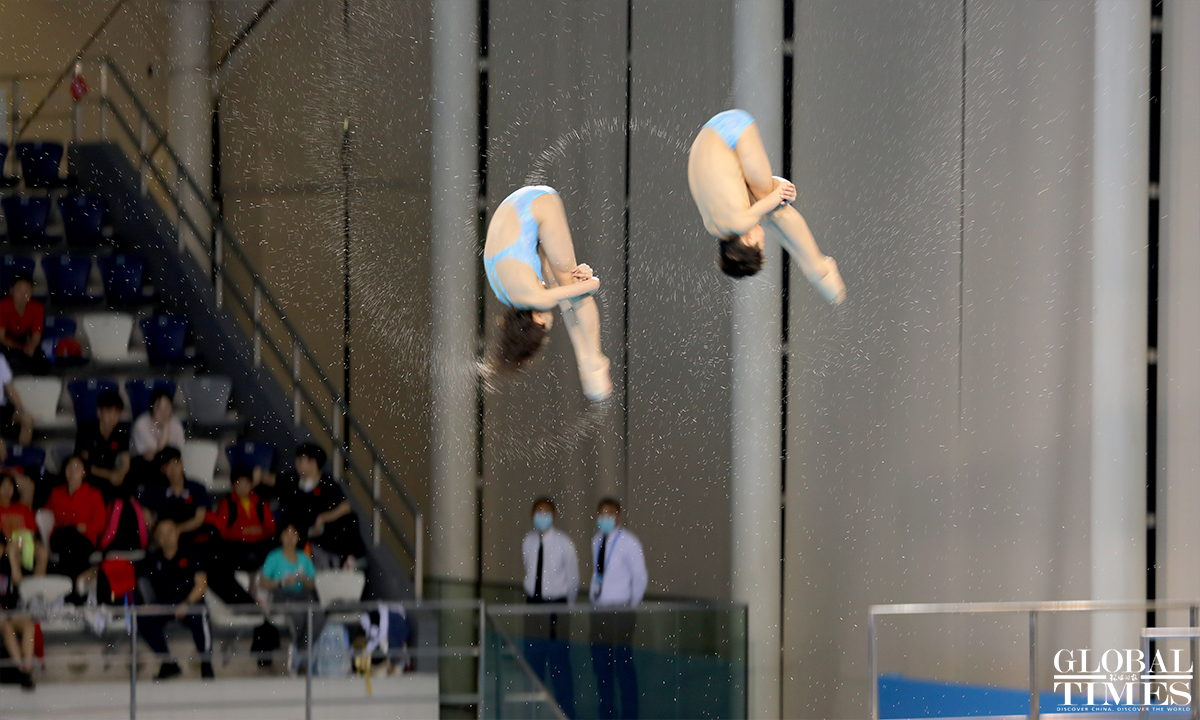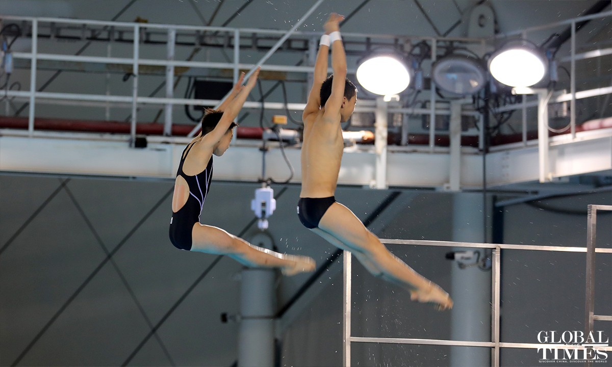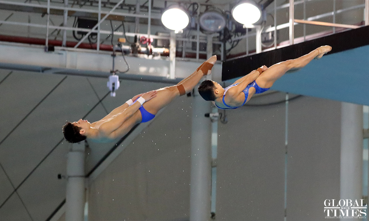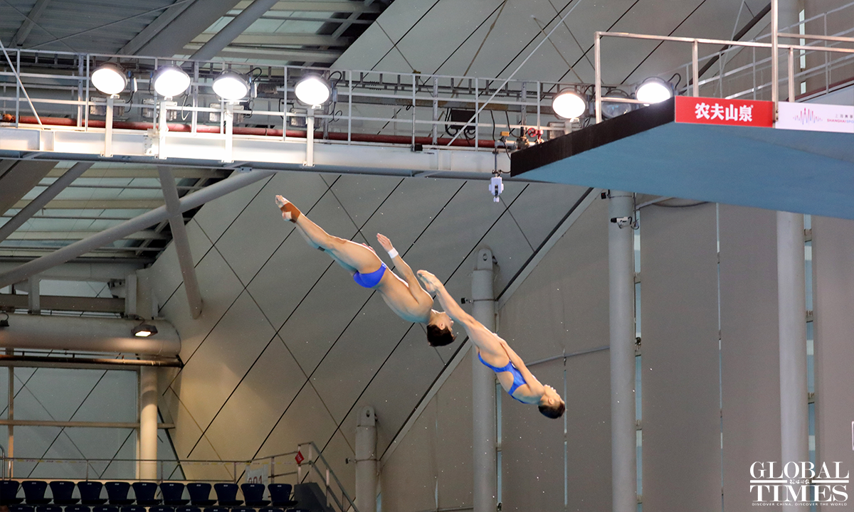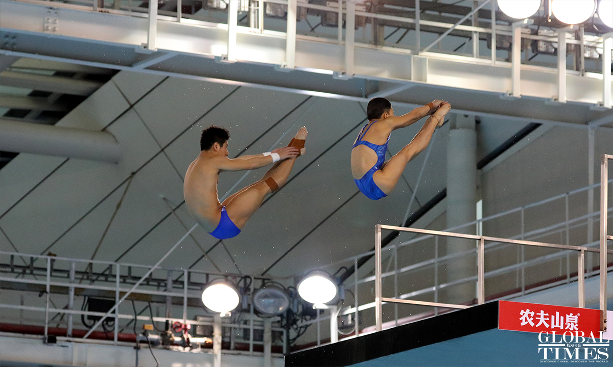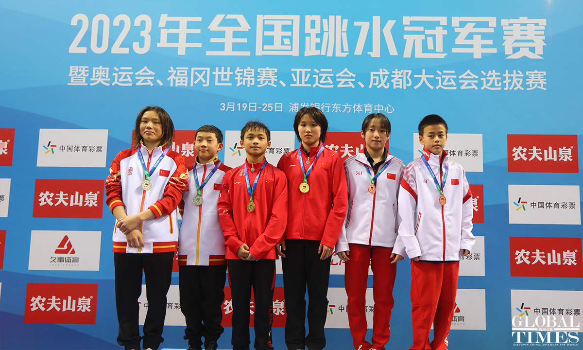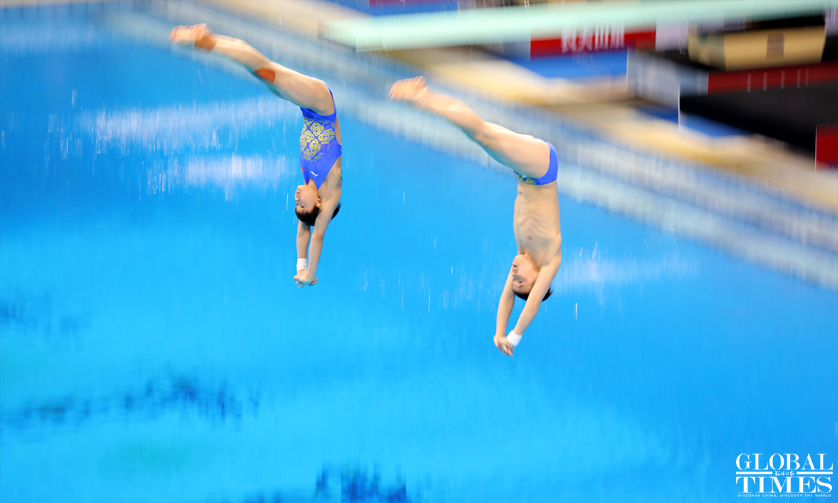 Athletes Su Zhiwen and Xu Nan won gold in the mixed synchronized 10-m platform event on March 20 in Shanghai. The event was part of the China Diving National Championships 2023 and Qualification for the Paris Olympic Games 2024, Fukuoka World Aquatics Championships 2023, Hangzhou Asian Games and Chengdu World University Games. The championships gathered top Chinese divers, including six Olympic champions and 13 world champions. Photos: Chen Xia/GT