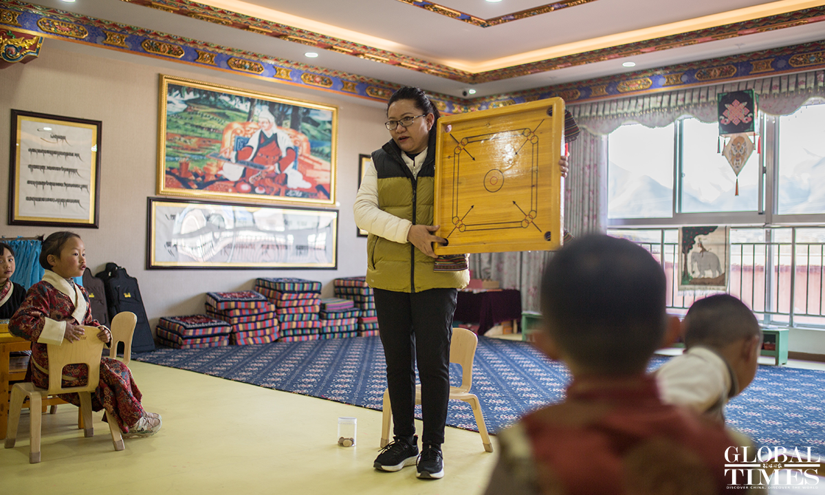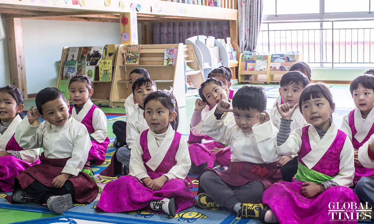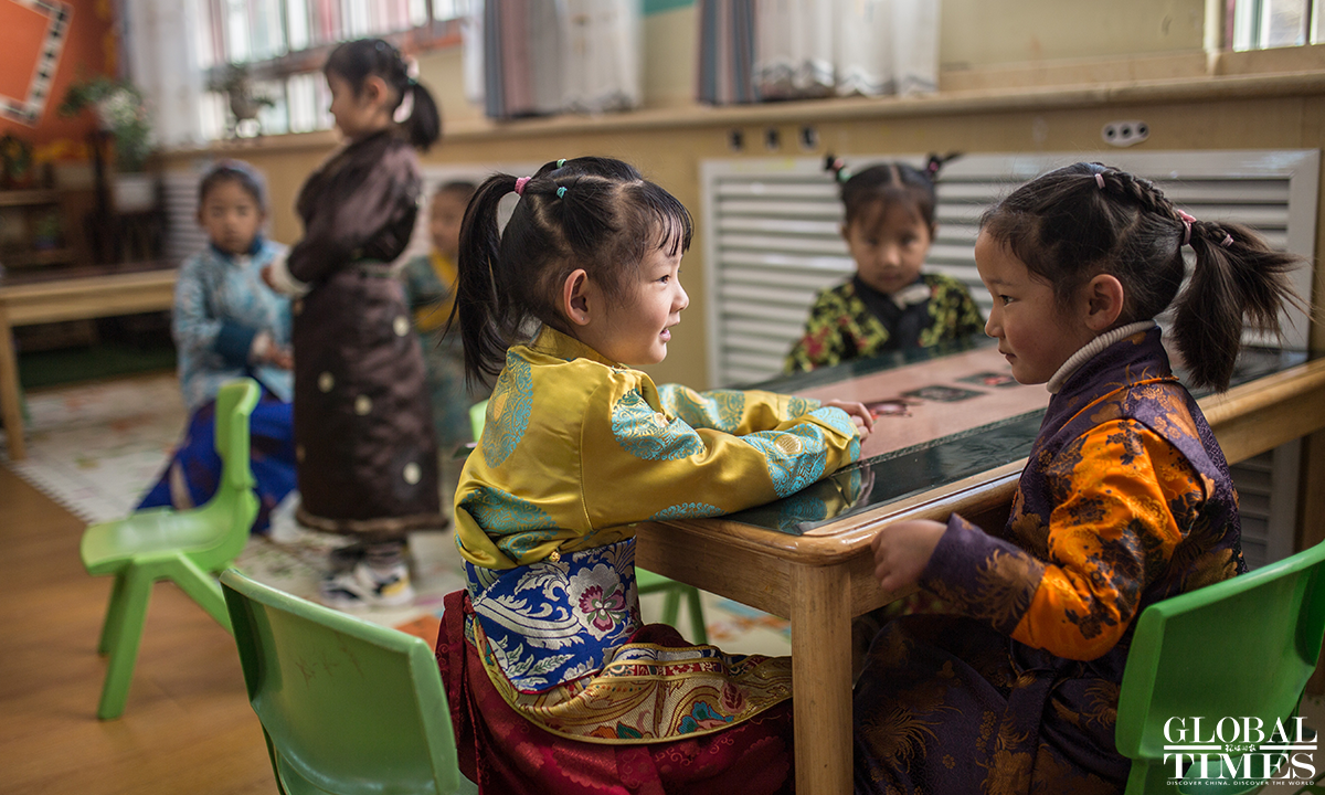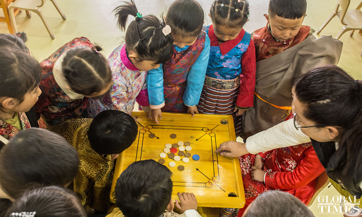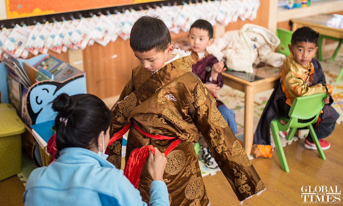 At the Lhasa Experimental Kindergarten in Southwest China’s Xizang Autonomous Region, children are fully immersing themselves in traditional local culture by telling stories in Tibetan language, playing traditional board games, learning Tibetan dances, and wearing Tibetan costumes. During a visit to the kindergarten on March 22, 2023, the Global Times reporters observed that all the children were able to express themselves fluently in both Putonghua and Tibetan language. Photos: Shan Jie/GT