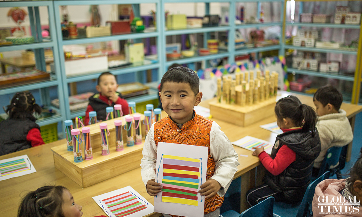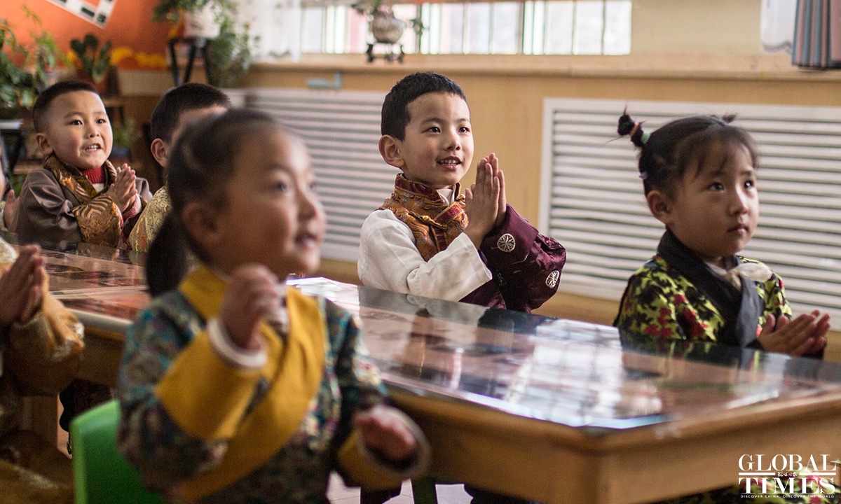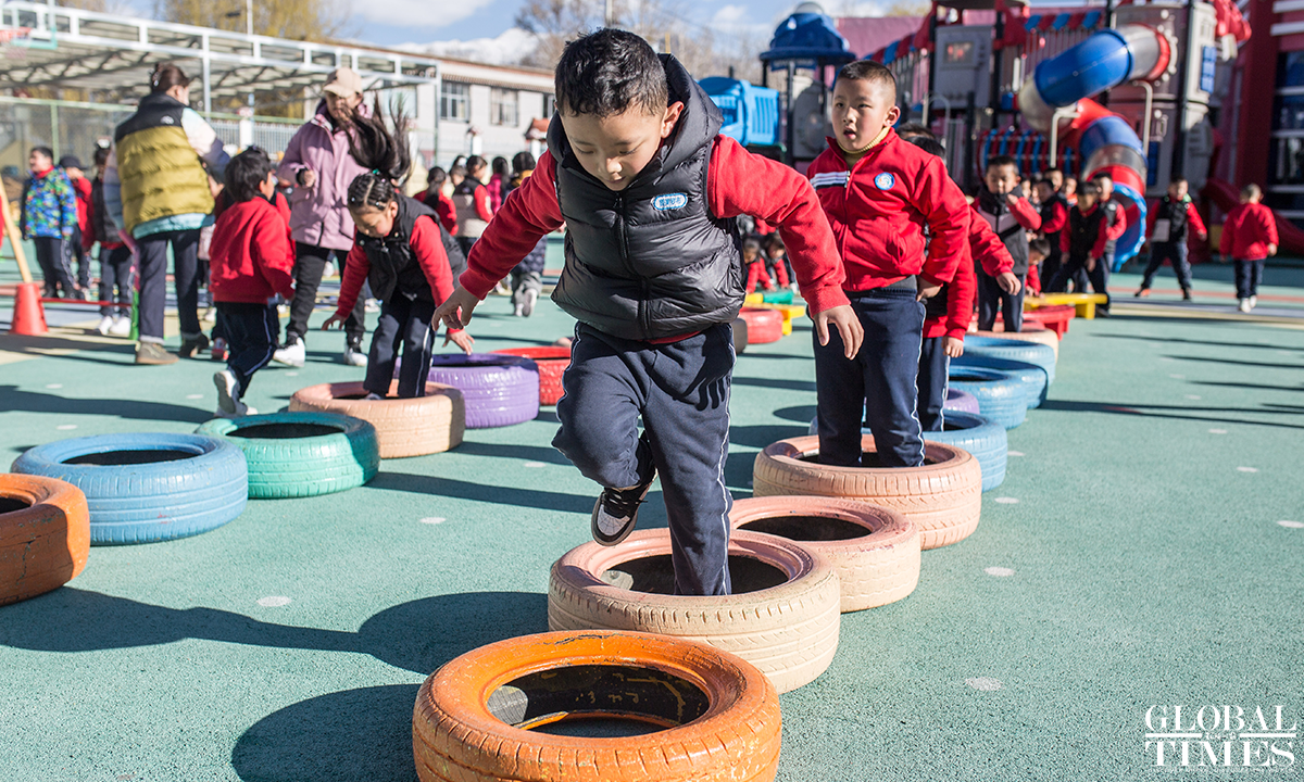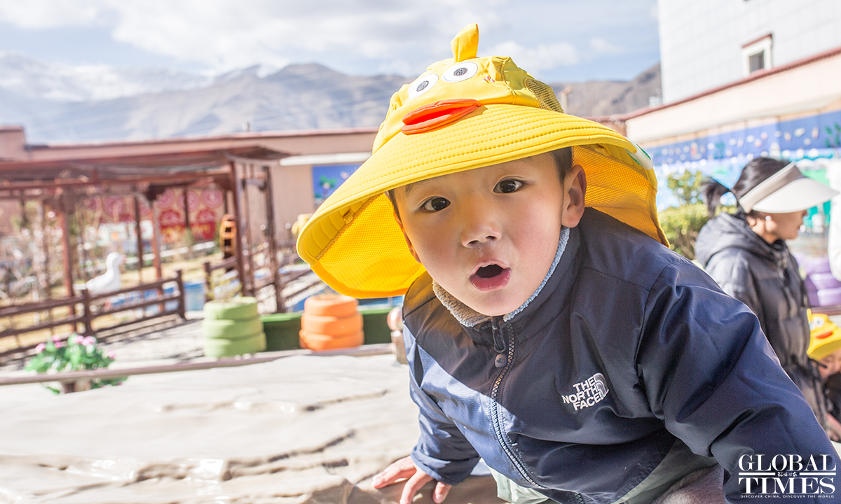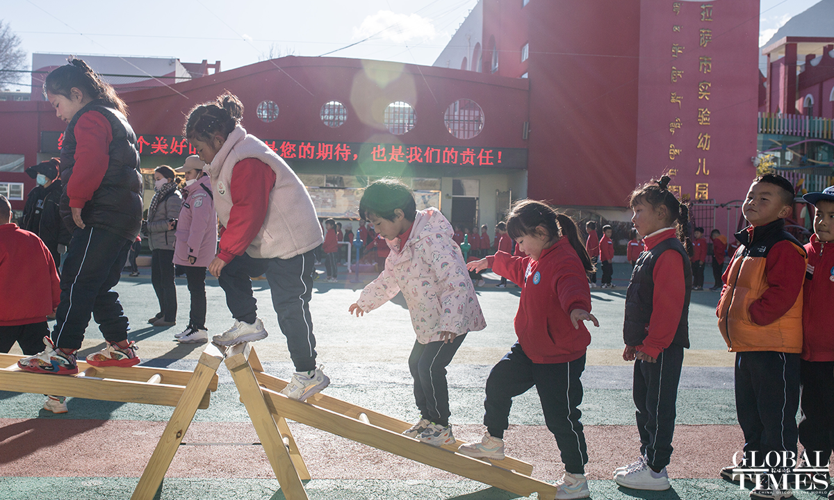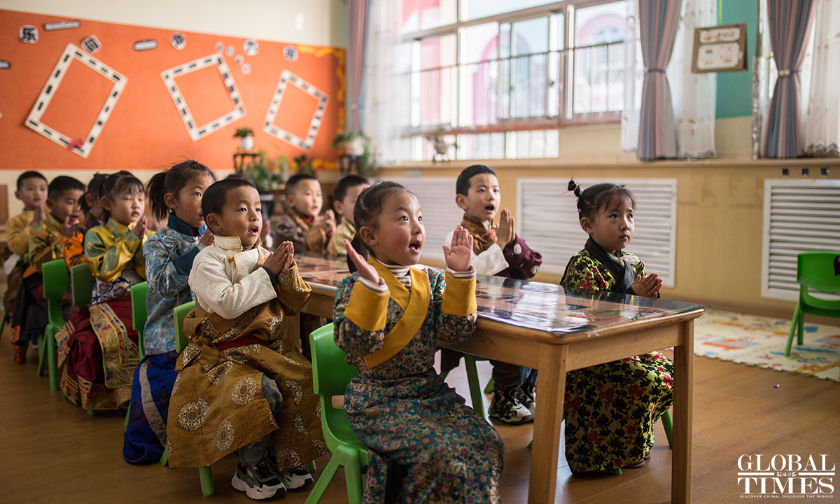 At the Lhasa Experimental Kindergarten in Southwest China’s Xizang Autonomous Region, children are fully immersing themselves in traditional local culture by telling stories in Tibetan language, playing traditional board games, learning Tibetan dances, and wearing Tibetan costumes. During a visit to the kindergarten on March 22, 2023, the Global Times reporters observed that all the children were able to express themselves fluently in both Putonghua and Tibetan language. Photos: Shan Jie/GT