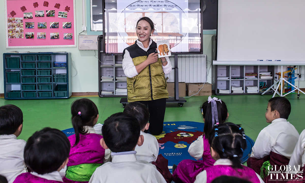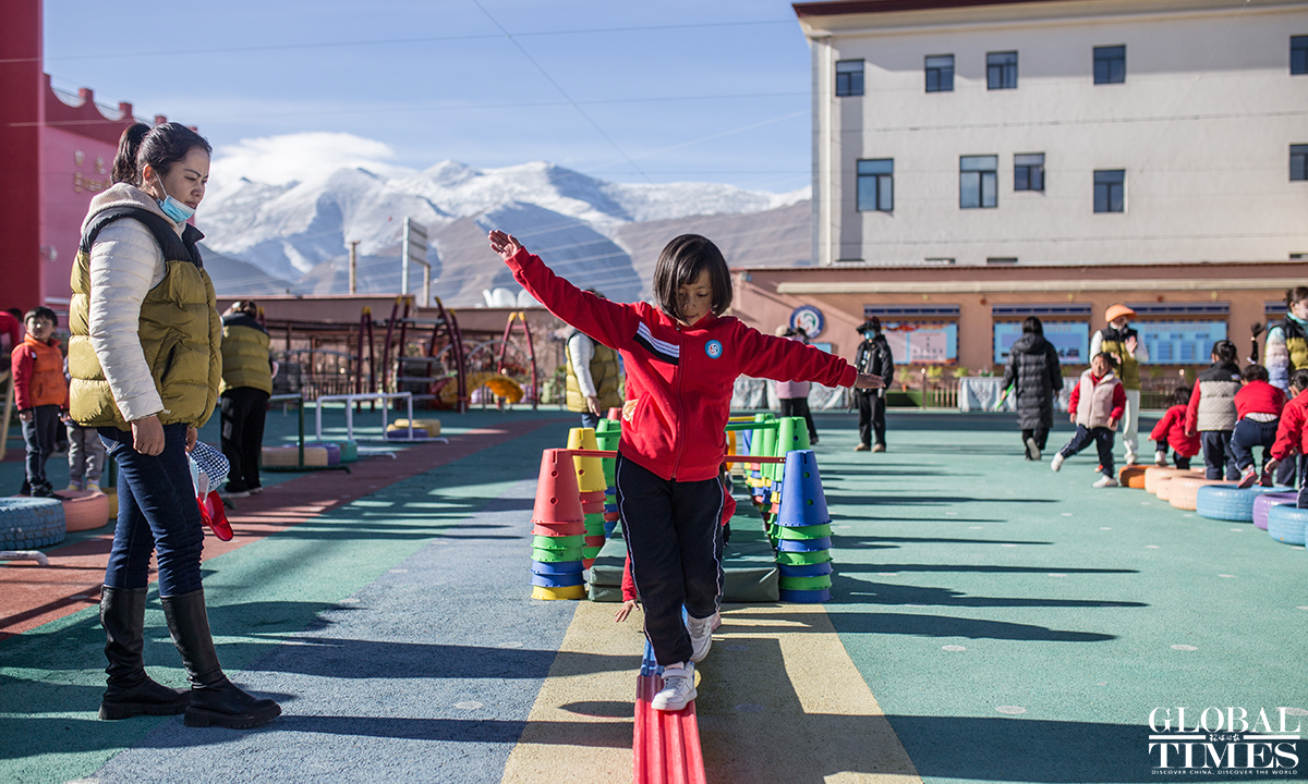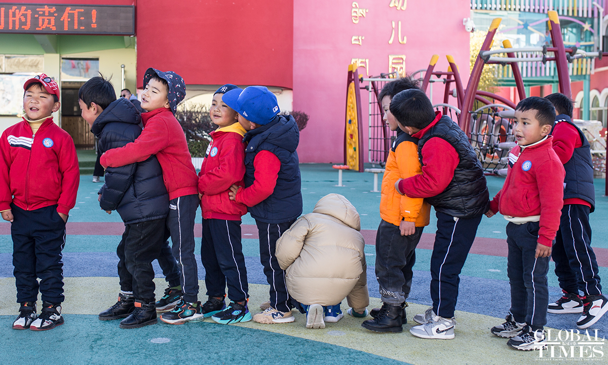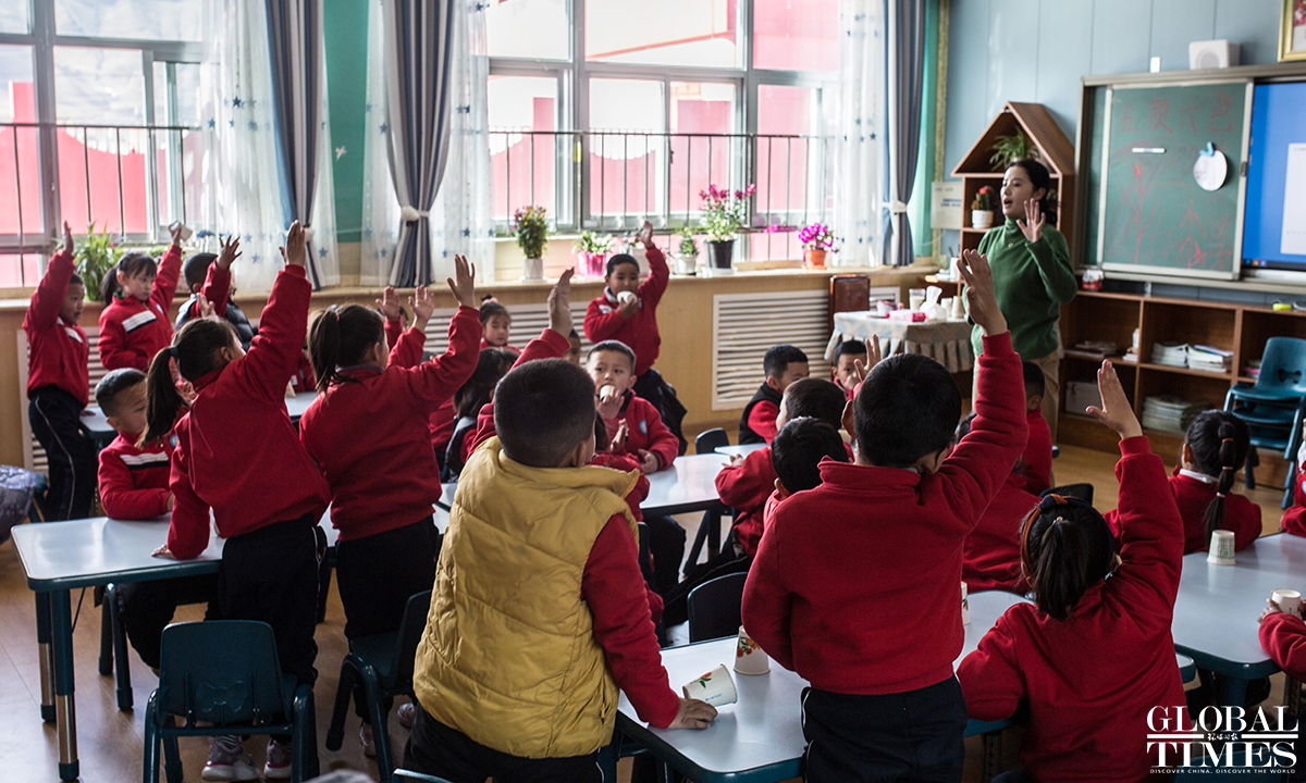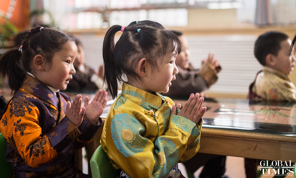 At the Lhasa Experimental Kindergarten in Southwest China’s Xizang Autonomous Region, children are fully immersing themselves in traditional local culture by telling stories in Tibetan language, playing traditional board games, learning Tibetan dances, and wearing Tibetan costumes. During a visit to the kindergarten on March 22, 2023, the Global Times reporters observed that all the children were able to express themselves fluently in both Putonghua and Tibetan language. Photos: Shan Jie/GT