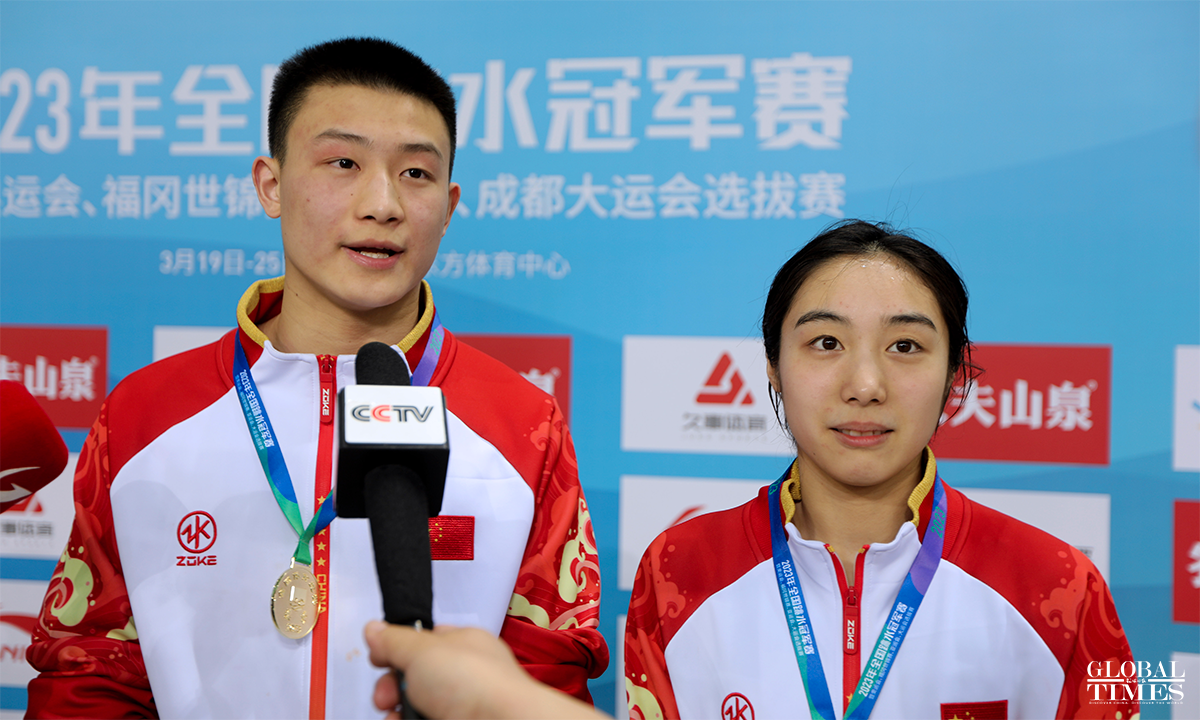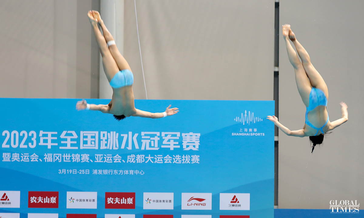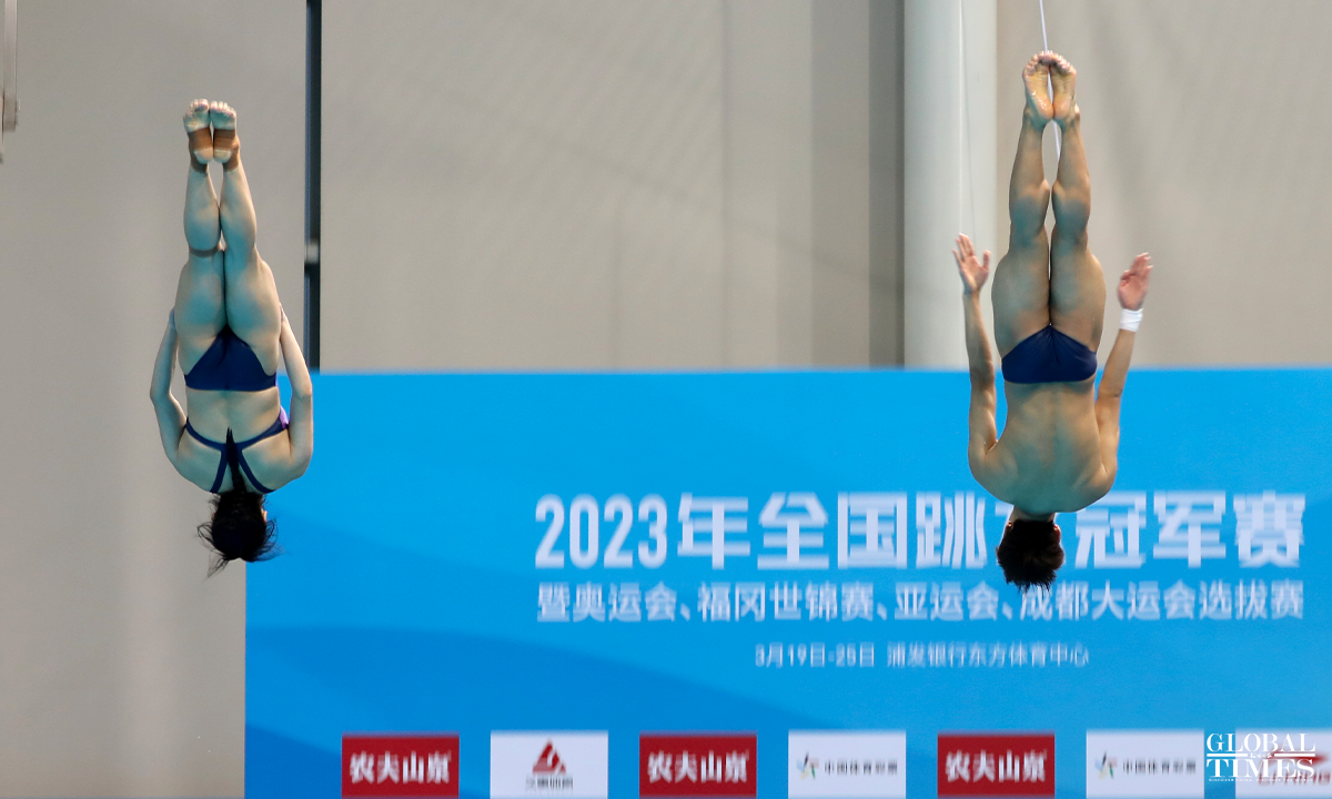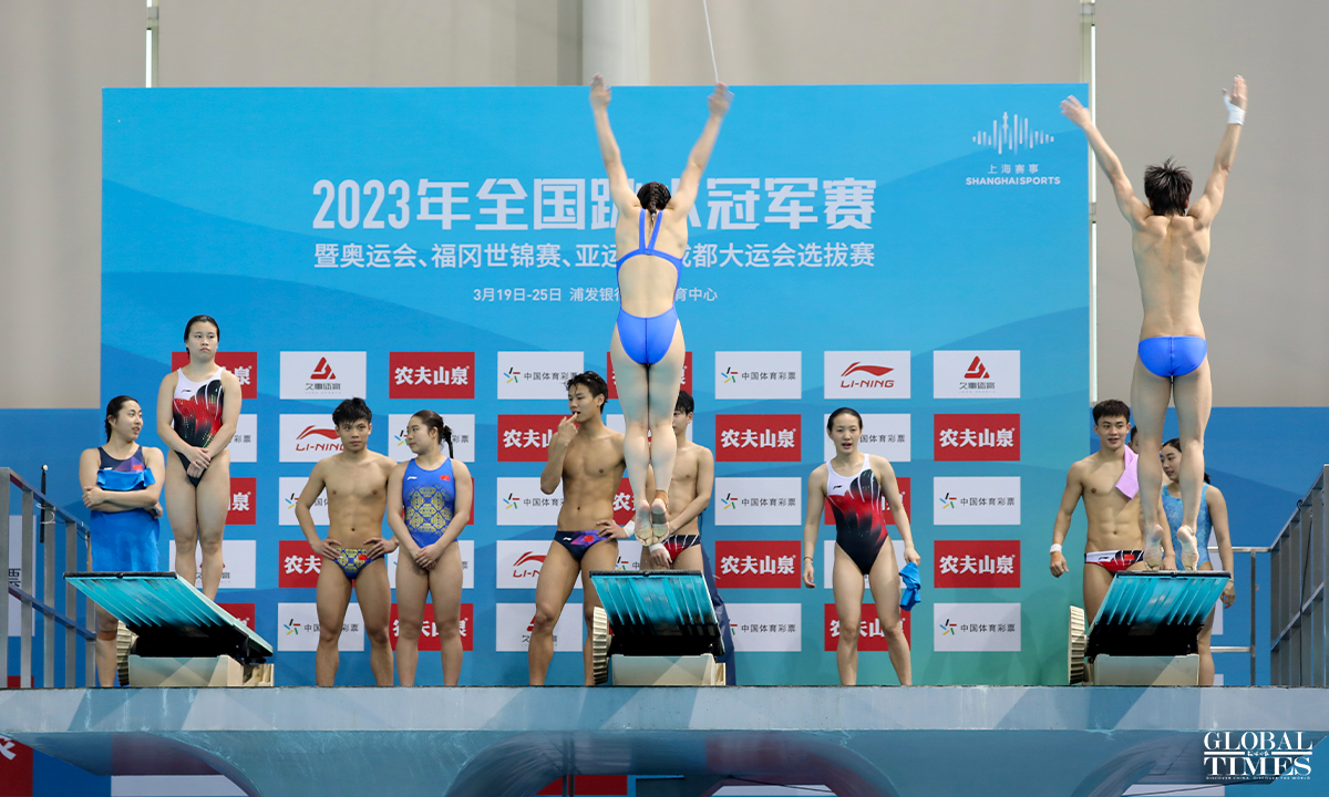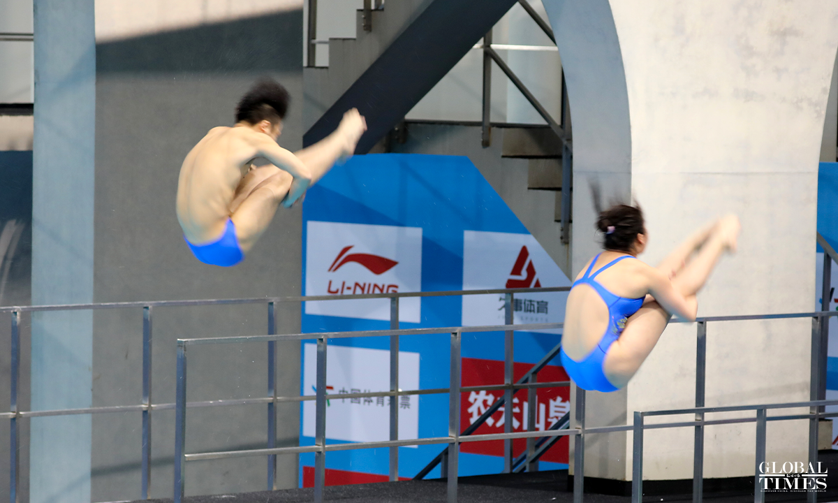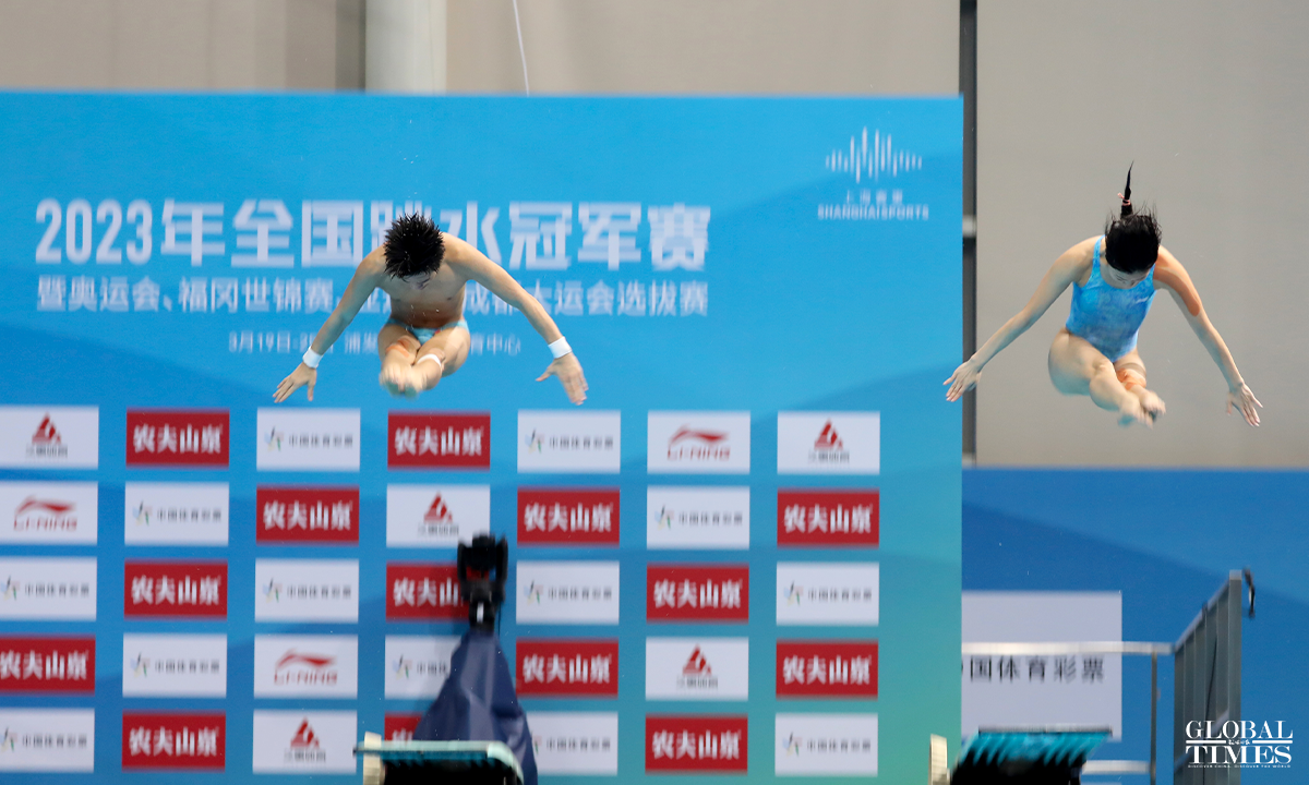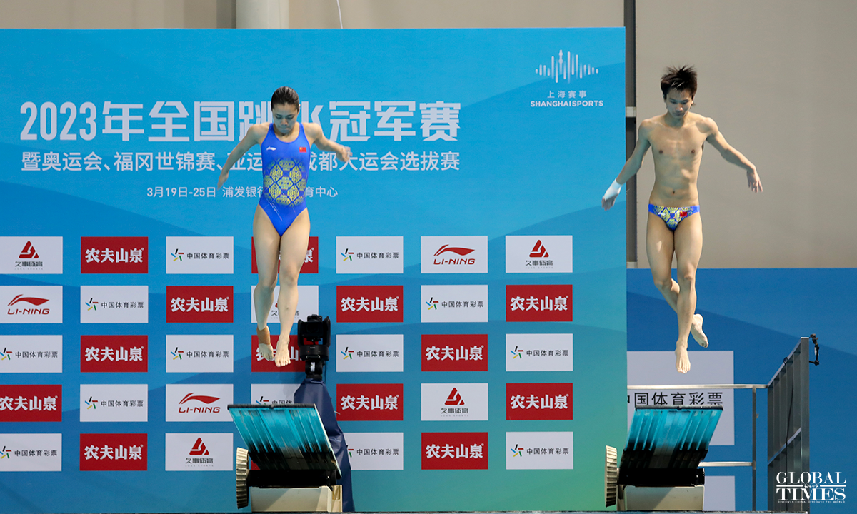 Zeng Junjie and Yang Ruilin won gold in the mixed synchronized 3-m springboard diving event on March 22. It was part of the China Diving National Championships 2023 & Qualification for the Paris Olympic Games 2024, Fukuoka World Aquatics Championships 2023, Hangzhou Asian Games and Chengdu World University Games. The championships gathered top Chinese divers, including six Olympic champions and 13 world champions. Photos: Chen Xia/GT