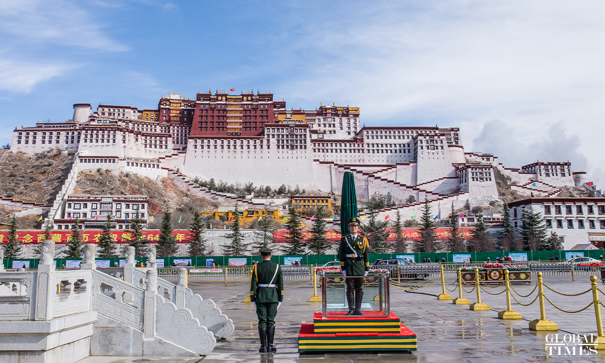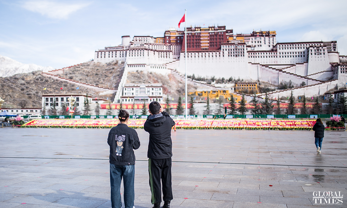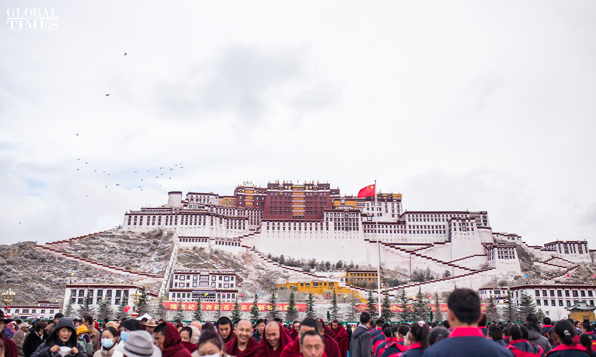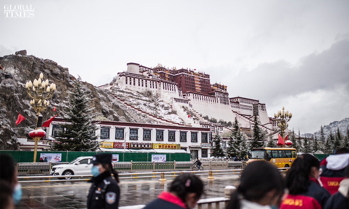 In a spring snow flurry, a flag-raising ceremony is held to celebrate Serfs' Emancipation Day at the square in front of the Potala Palace in Lhasa, capital city of Southwest China's Xizang Autonomous Region, on March 28, 2023. Photos: Shan Jie and Fan Wei/GT