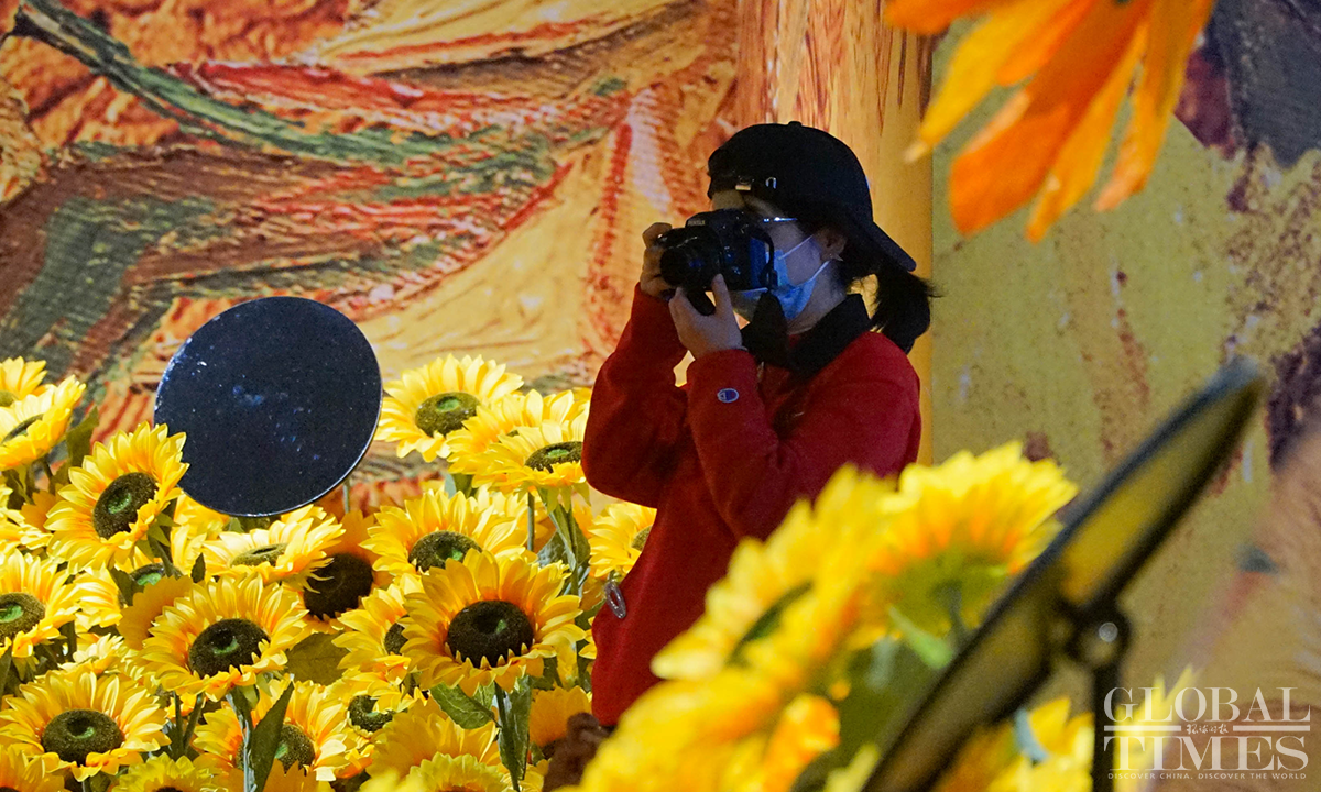 High-tech immersive light and shadow exhibition "Meet Van Gogh", featuring 149 paintings including Sunflowers and Starry Night from the Dutch painter Vincent Van Gogh, kicked off at the Meet You Museum in Shanghai on Sunday. The exhibition lets the audience immerse in the color, music, light and shadows of the paintings, creating a visual and auditory interaction within the aesthetic experience. Many visitors came to enjoy the exhibition on Sunday.