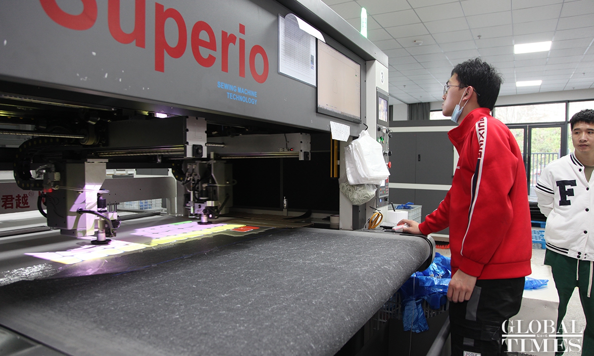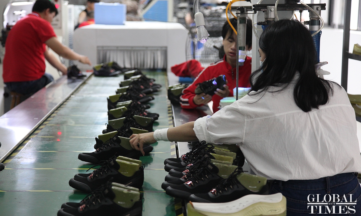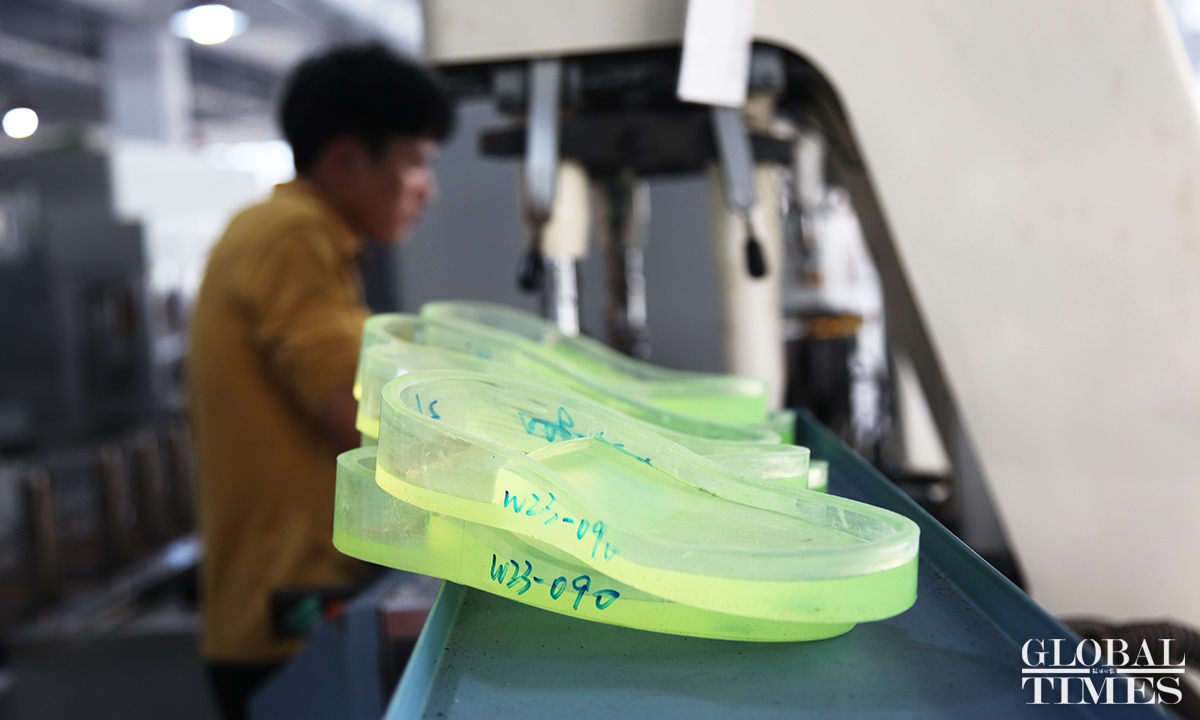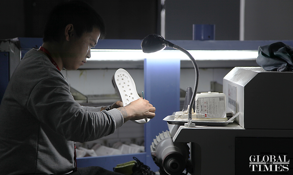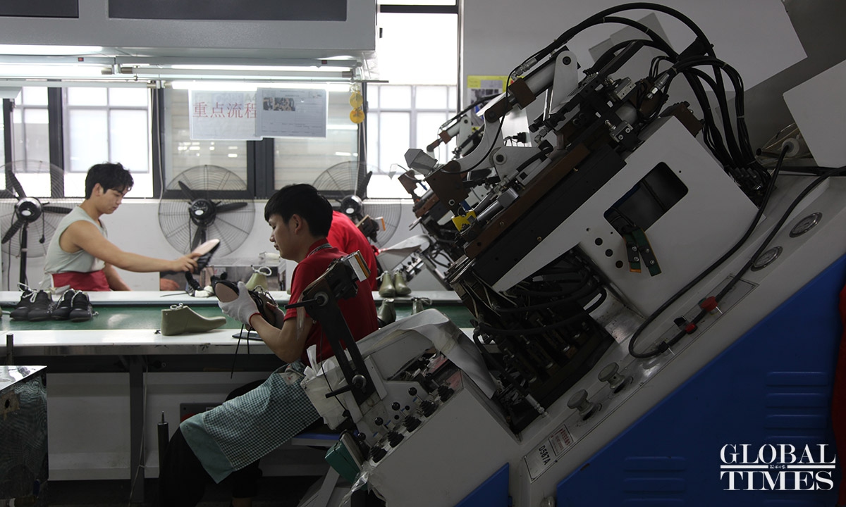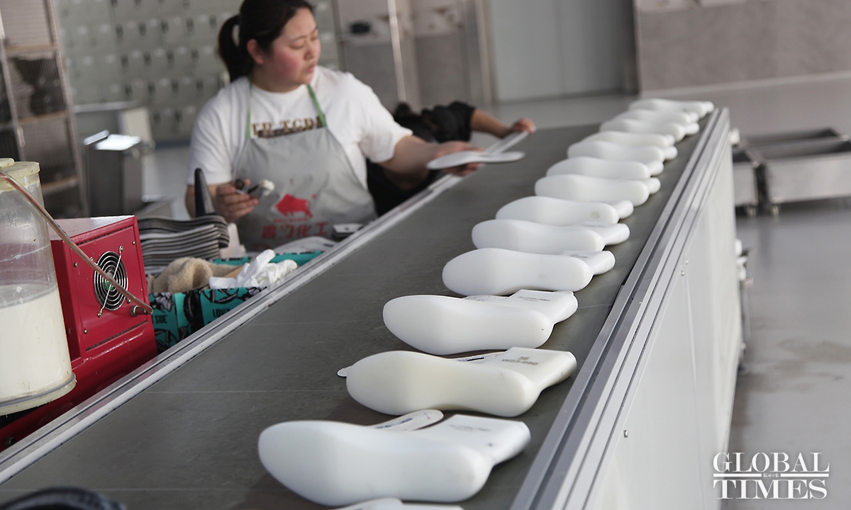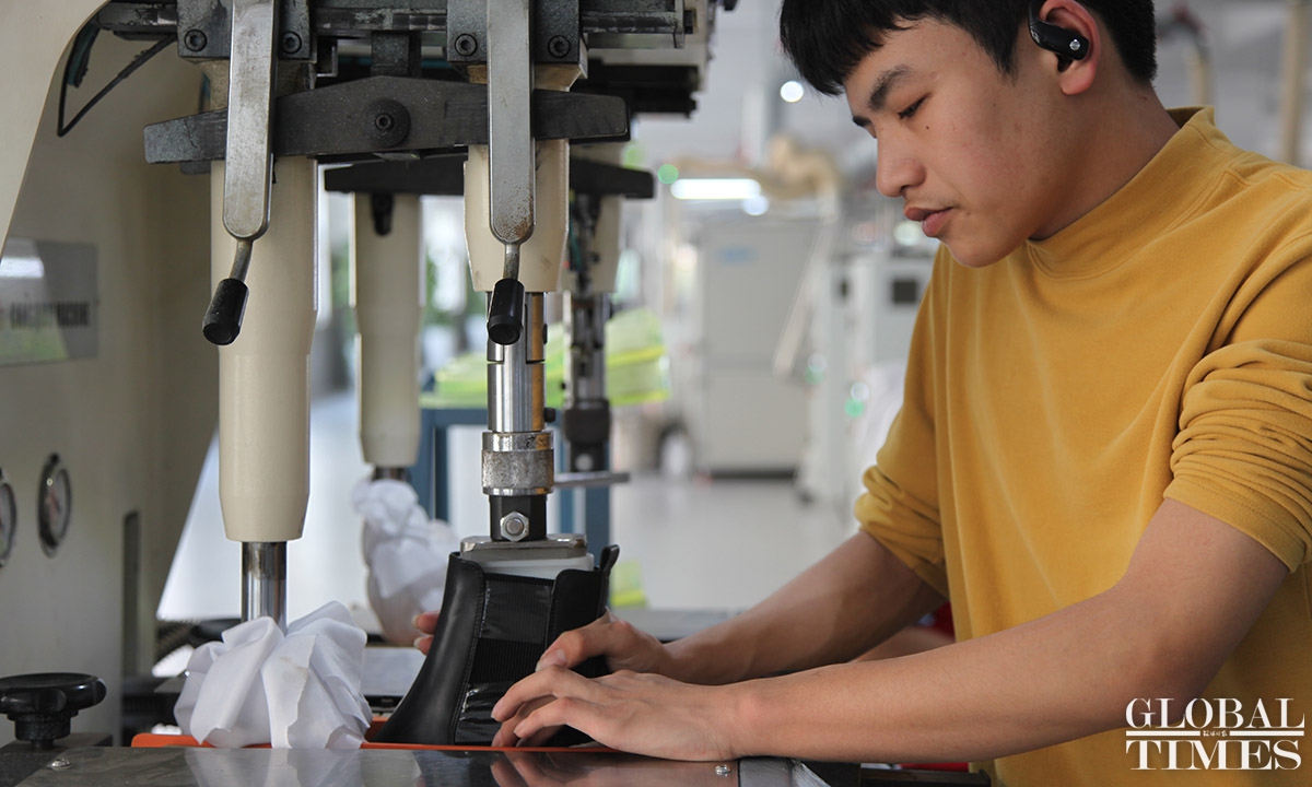 The “fashion shoes town,” a planned 3.7-square-kilometer area located on Fengmen Street in Wenzhou, East China’s Zhejiang Province, is a manufacturing hub for many leading global shoe brands. Some factories in the town are busily catching up on orders for overseas clients. The Global Times reporter visited factories belonging to Juyi Group and Wenzhou Ruixing Shoes Co, two leading shoe makers in the region, witnessing how they have applied intelligent machinery and advanced technology across their production lines. Photos: Xie Jun/GT
