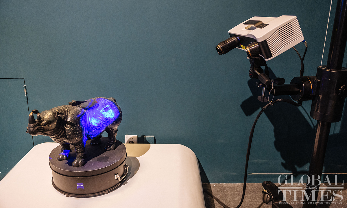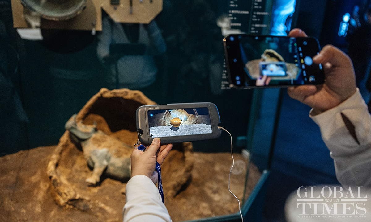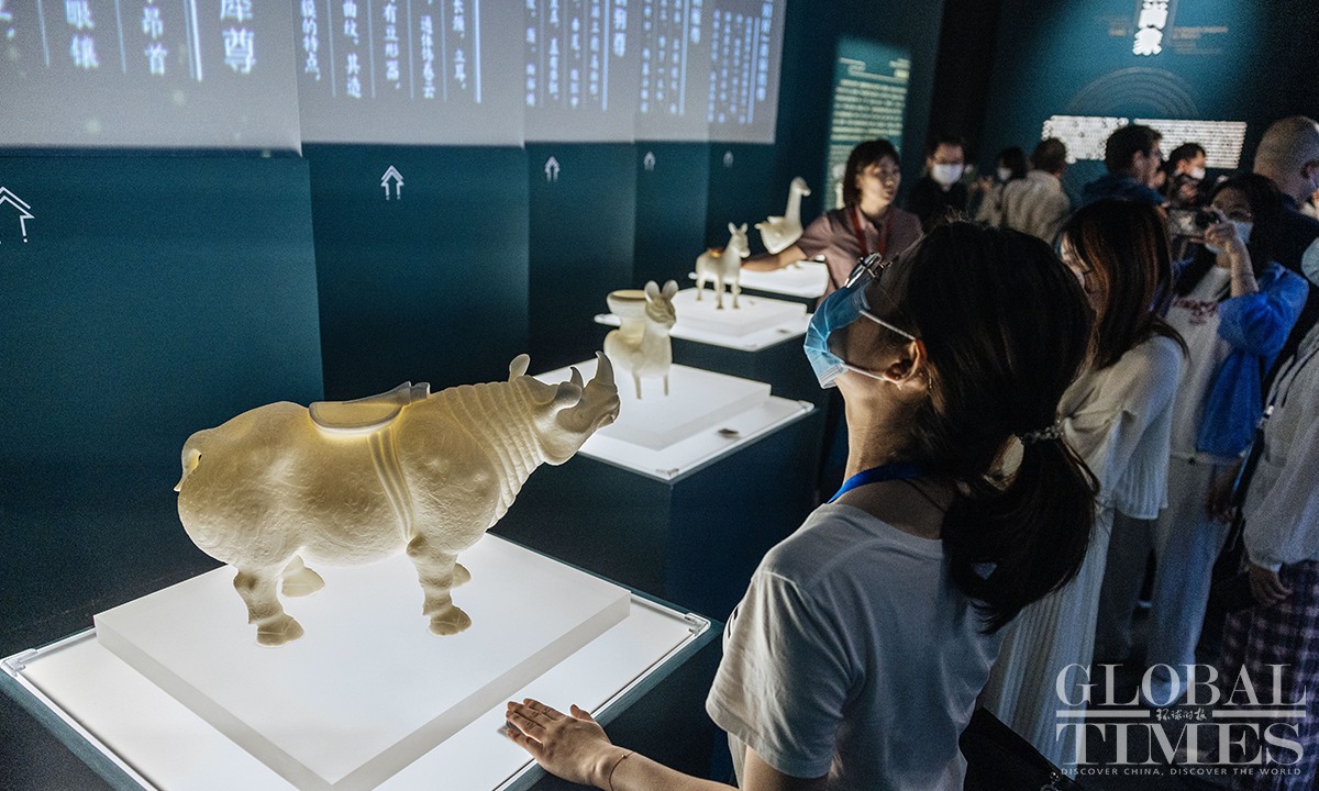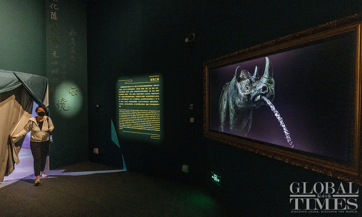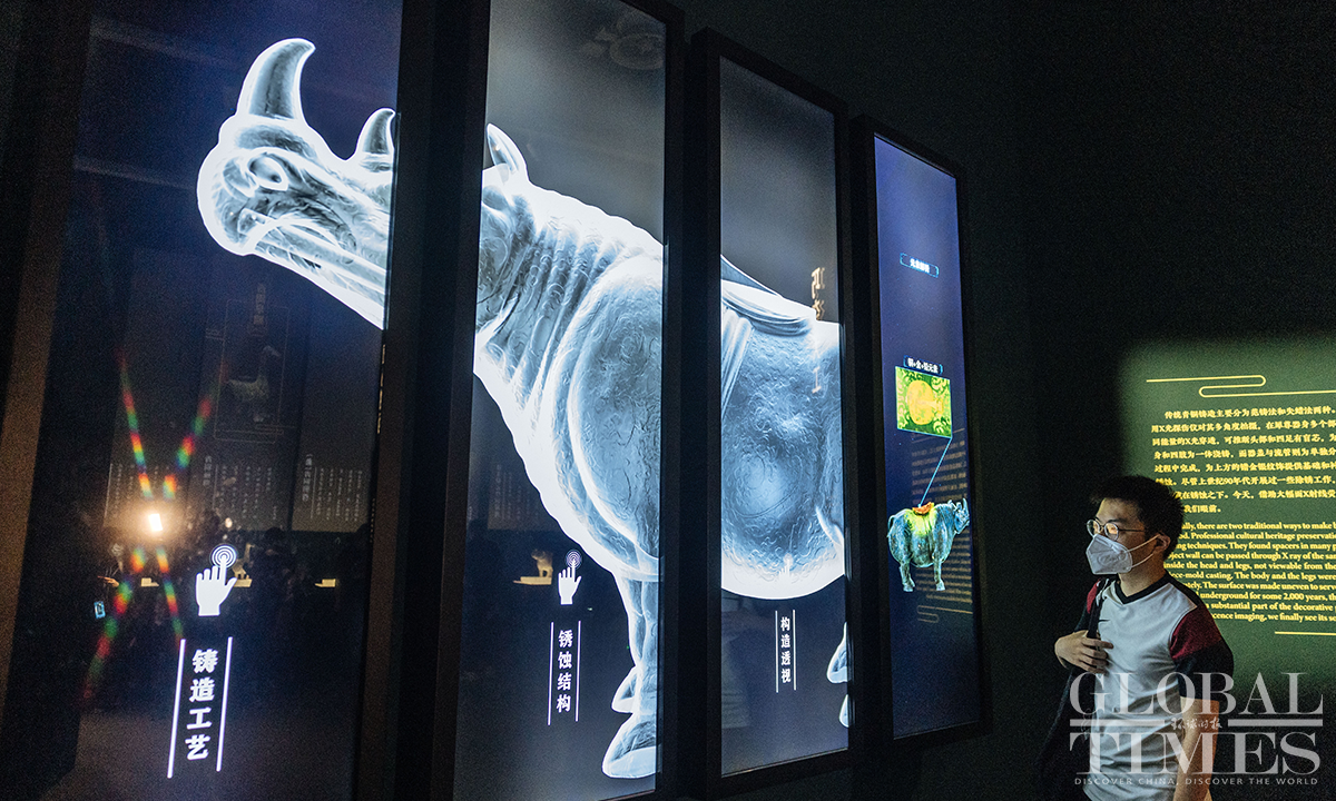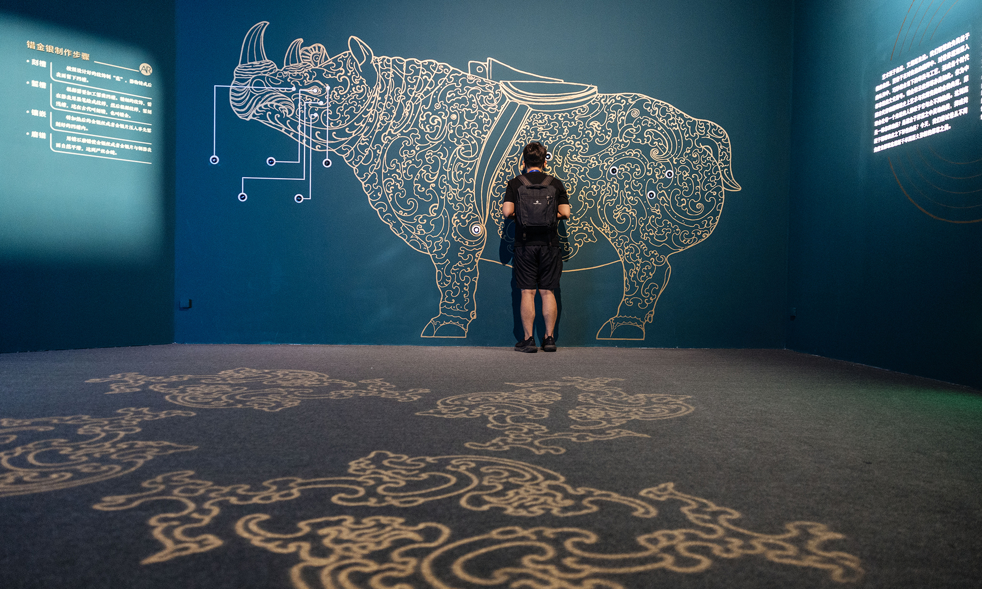 After nearly a year of preparation, an exhibition featuring a rhino-shaped bronze wine vessel through digital means is opened to the public at the National Museum of China. The Western Han Dynasty rhino-shaped bronze wine vessel, made of gold and silver with cloud patterns, is a representative cultural relic in the museum's collection. It has high historical, cultural and aesthetic values. The exhibition hall presents this national treasure in a one-object-one-exhibition format, providing a comprehensive interpretation of the relic's excavation history, functional characteristics, casting and decoration techniques, and aesthetic beauty. Through digital means, the exhibition showcases high-definition details of the relic and scientific research results, allowing visitors to become explorers and participants, experiencing the value of the rhino-shaped vessel through multiple dimensions of sight, sound, touch, and interactive thinking. Photos: Li Hao/GT