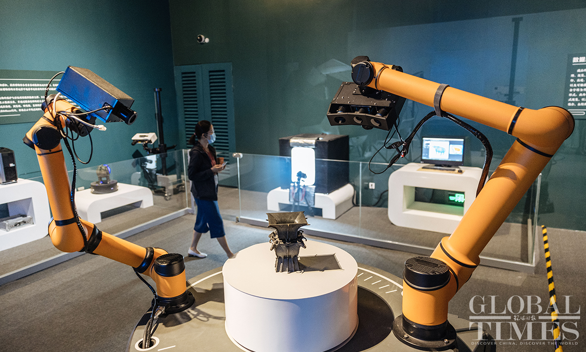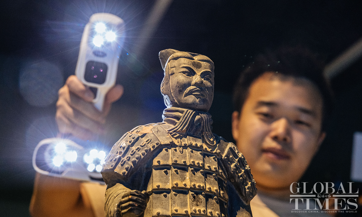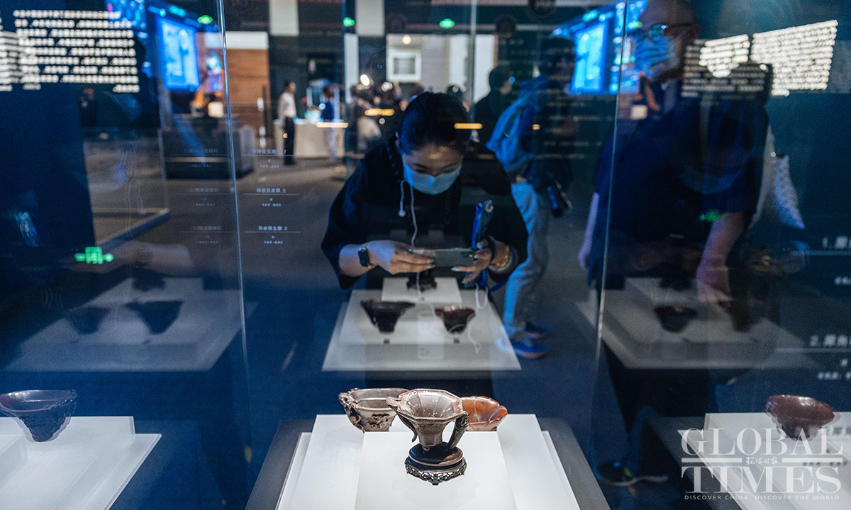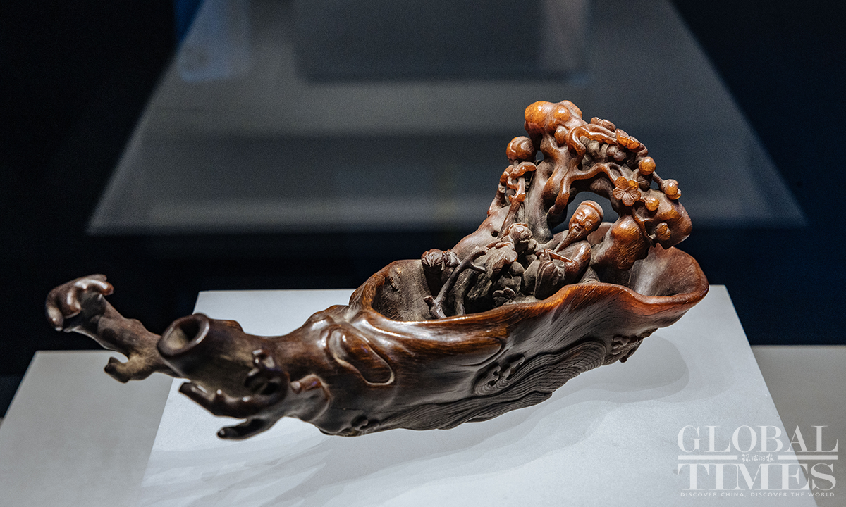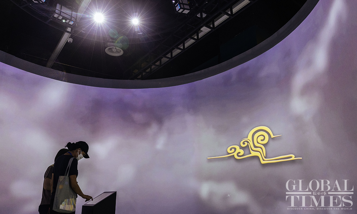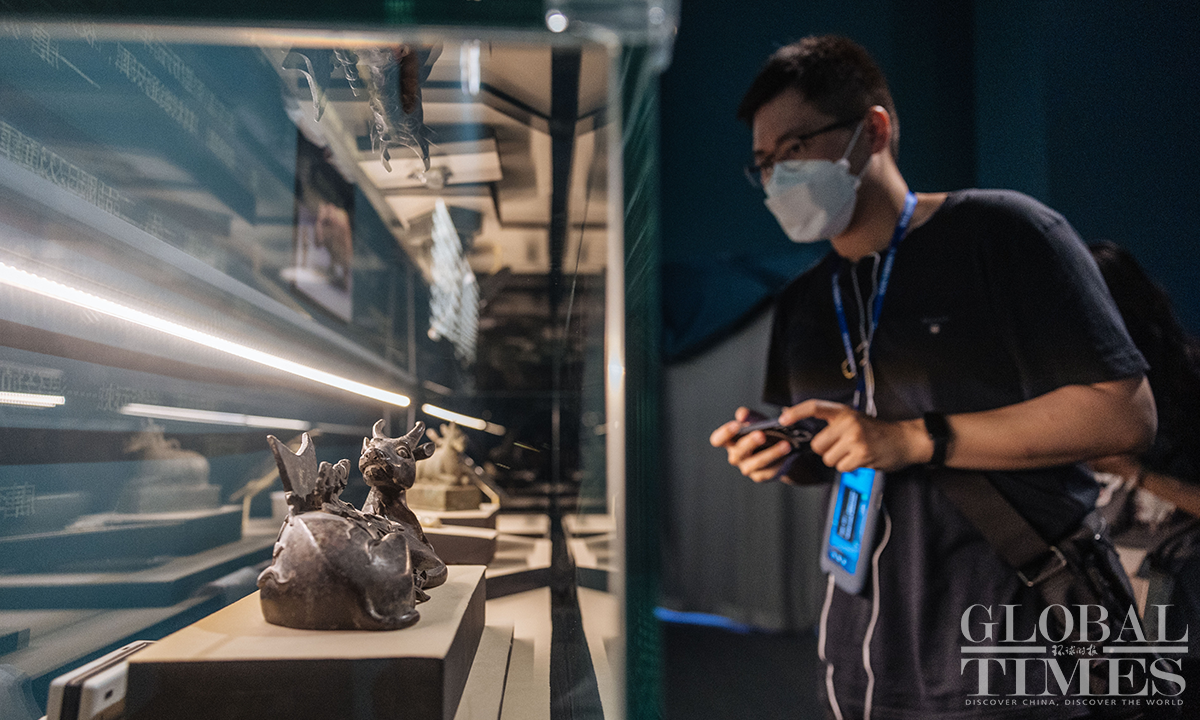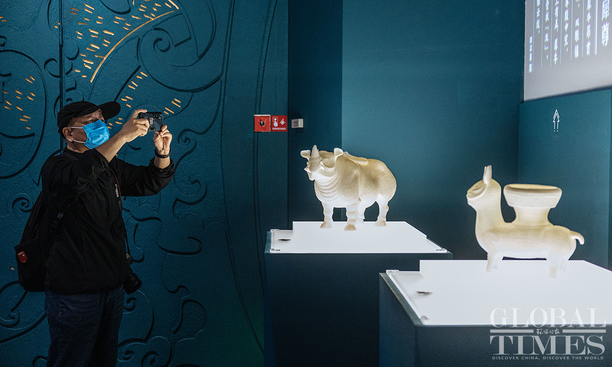 After nearly a year of preparation, an exhibition featuring a rhino-shaped bronze wine vessel through digital means is opened to the public at the National Museum of China. The Western Han Dynasty rhino-shaped bronze wine vessel, made of gold and silver with cloud patterns, is a representative cultural relic in the museum's collection. It has high historical, cultural and aesthetic values. The exhibition hall presents this national treasure in a one-object-one-exhibition format, providing a comprehensive interpretation of the relic's excavation history, functional characteristics, casting and decoration techniques, and aesthetic beauty. Through digital means, the exhibition showcases high-definition details of the relic and scientific research results, allowing visitors to become explorers and participants, experiencing the value of the rhino-shaped vessel through multiple dimensions of sight, sound, touch, and interactive thinking. Photos: Li Hao/GT