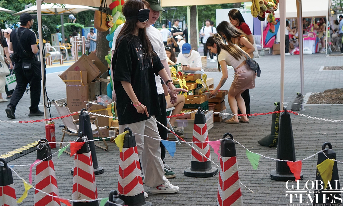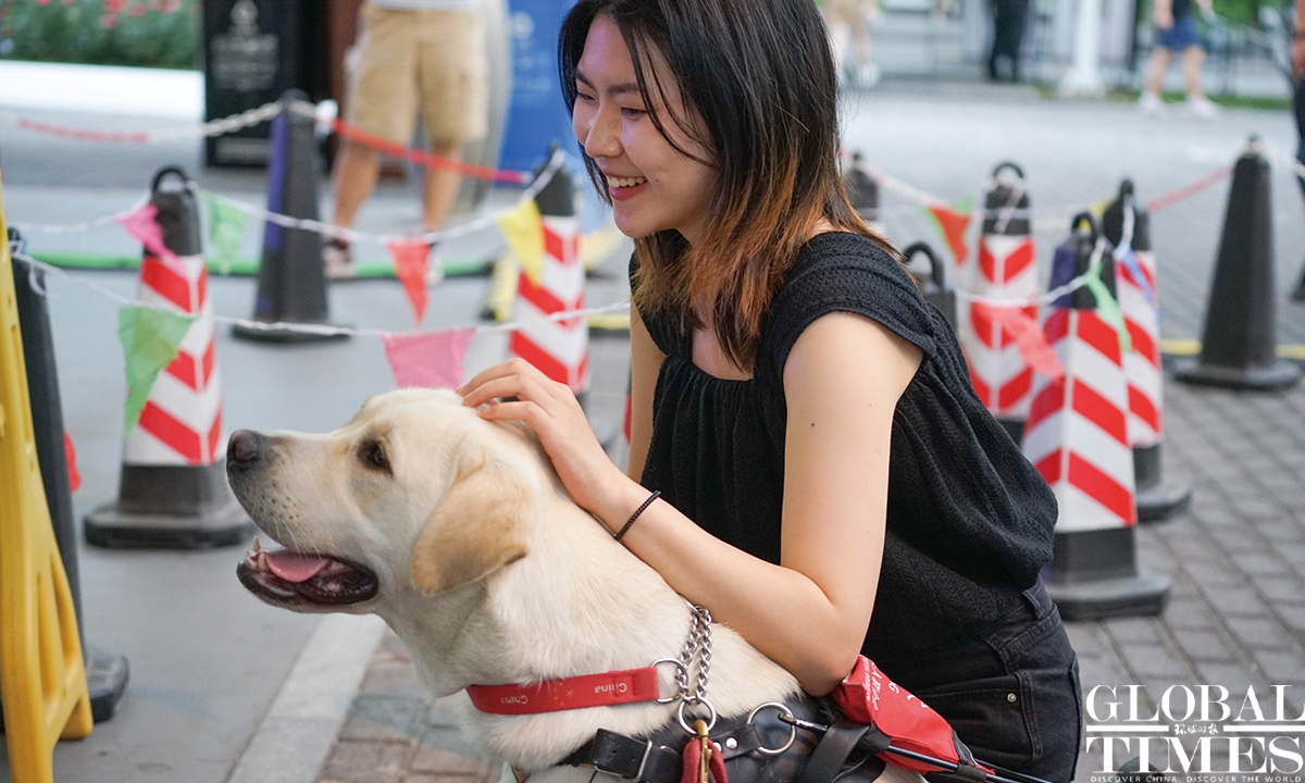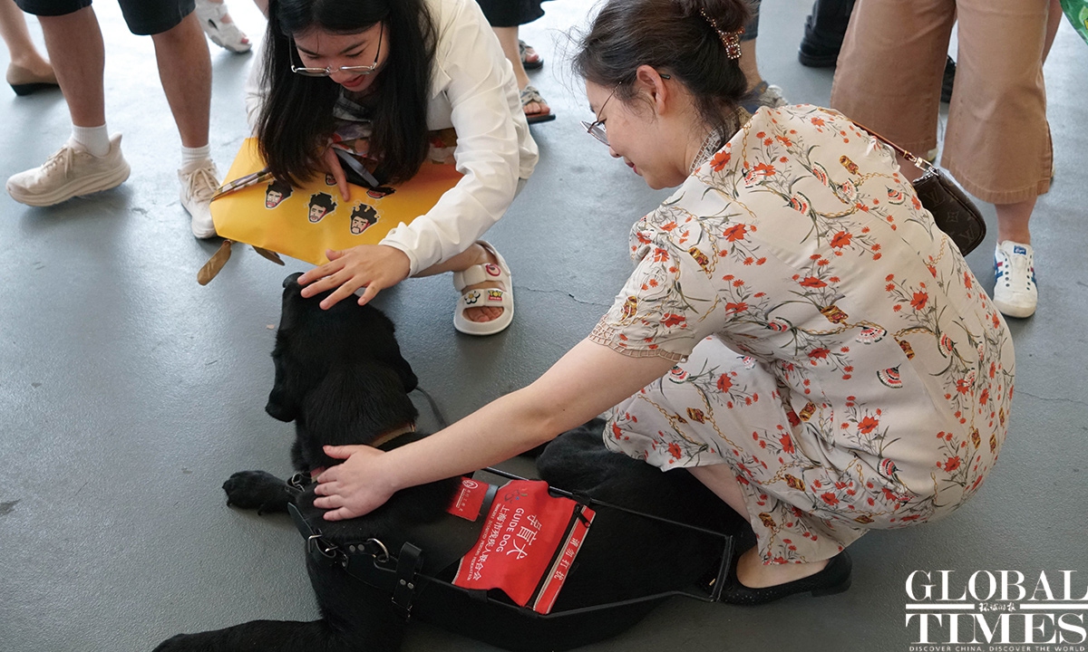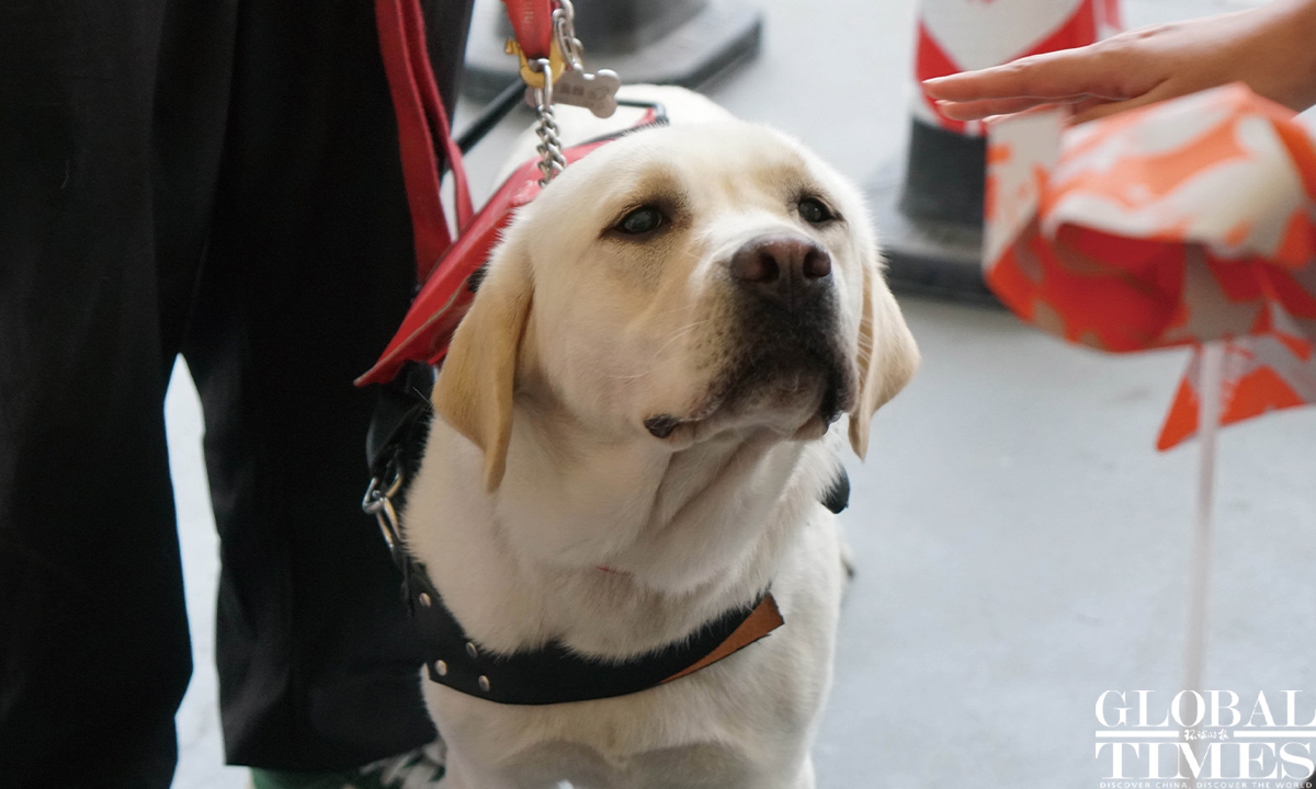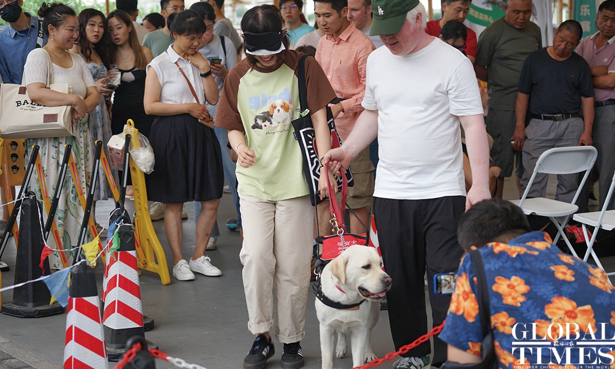 A campaign called "Experiencing light and darkness" was held in Shanghai to help people better understand the life of the visually impaired and their guide dogs. With the help of a cane and a guide dog, participants walk in the dark with their eyes covered. Many found after the experience that the guide dog offers more help and surety than the cane. Photos: Lu Ting/GT