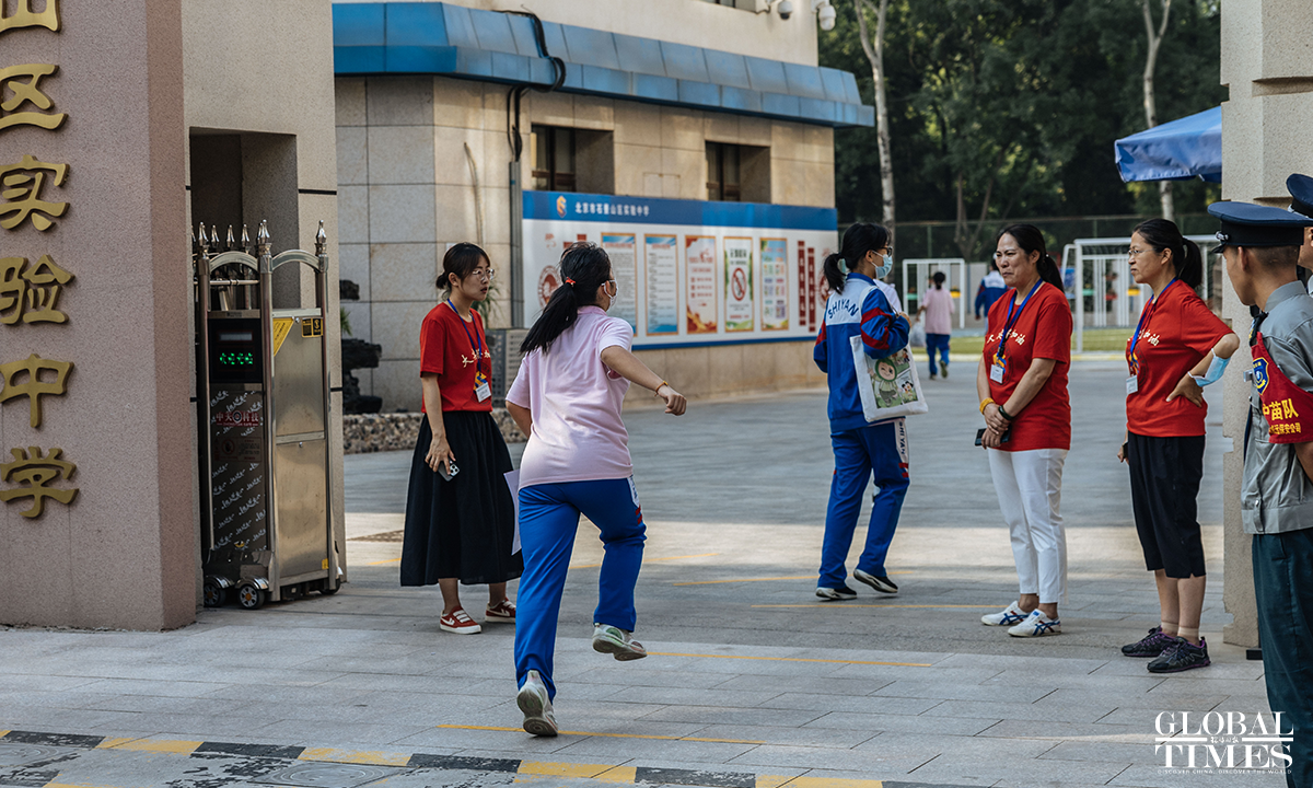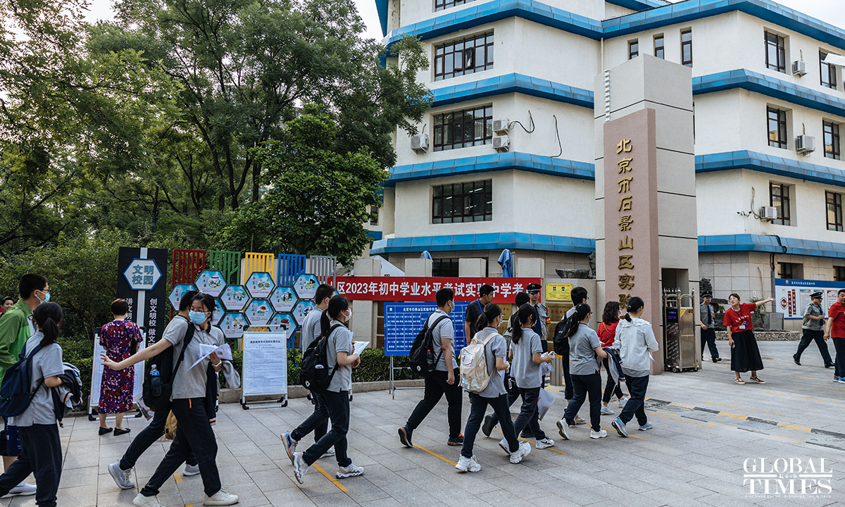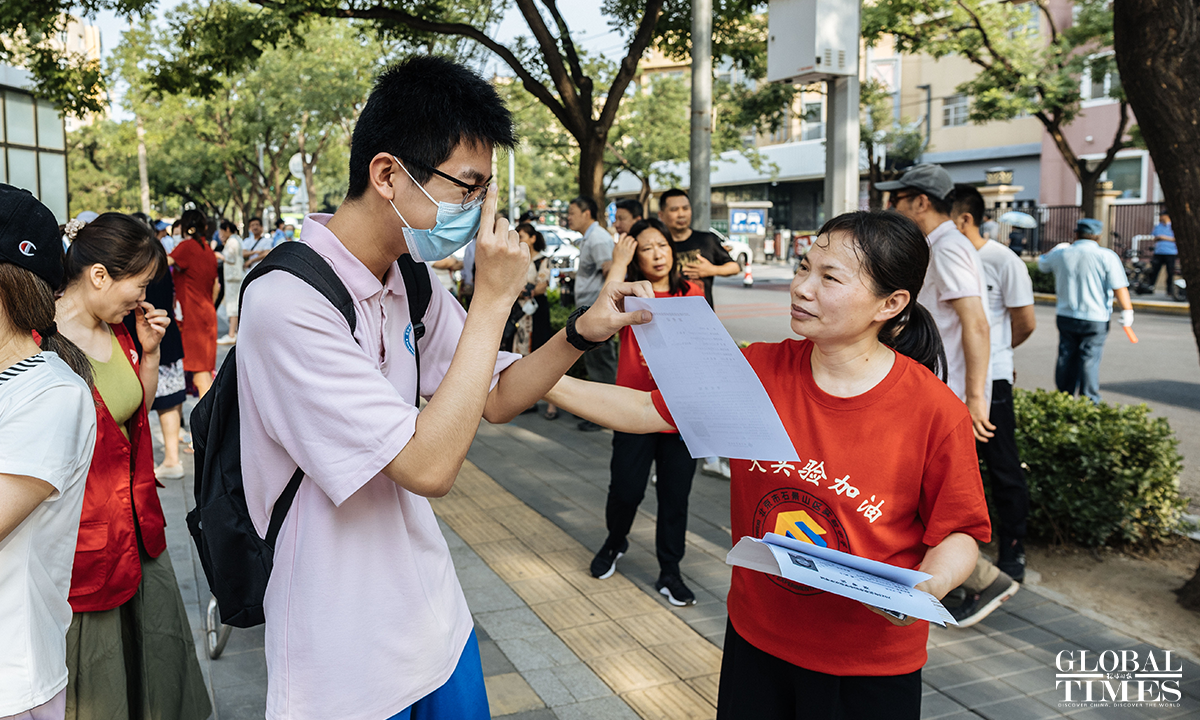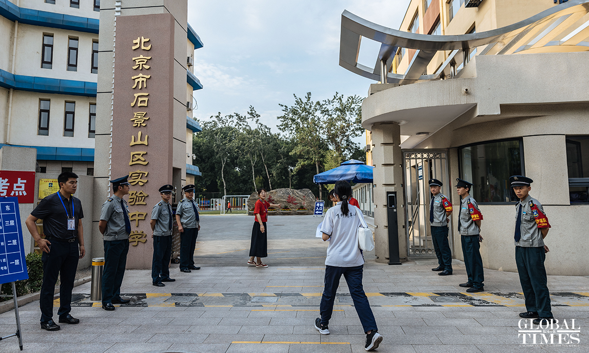 With 224,000 students sitting in the exam, the senior high school entrance examinations kicked off in Beijing on Saturday amid scorching temperatures of up to 40 C. A Global Times reporter saw that at one of the exam centers, the Shijingshan Experimental Middle School, students entered in an orderly manner. This year, the manual security checks have been added, with students required to pass through a metal detector before entering the exam center, and electronic devices such as mobile phones are strictly prohibited. Photos: Li Hao/GT