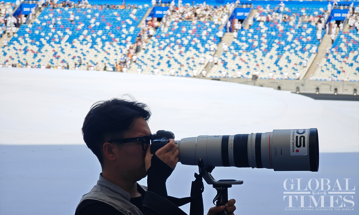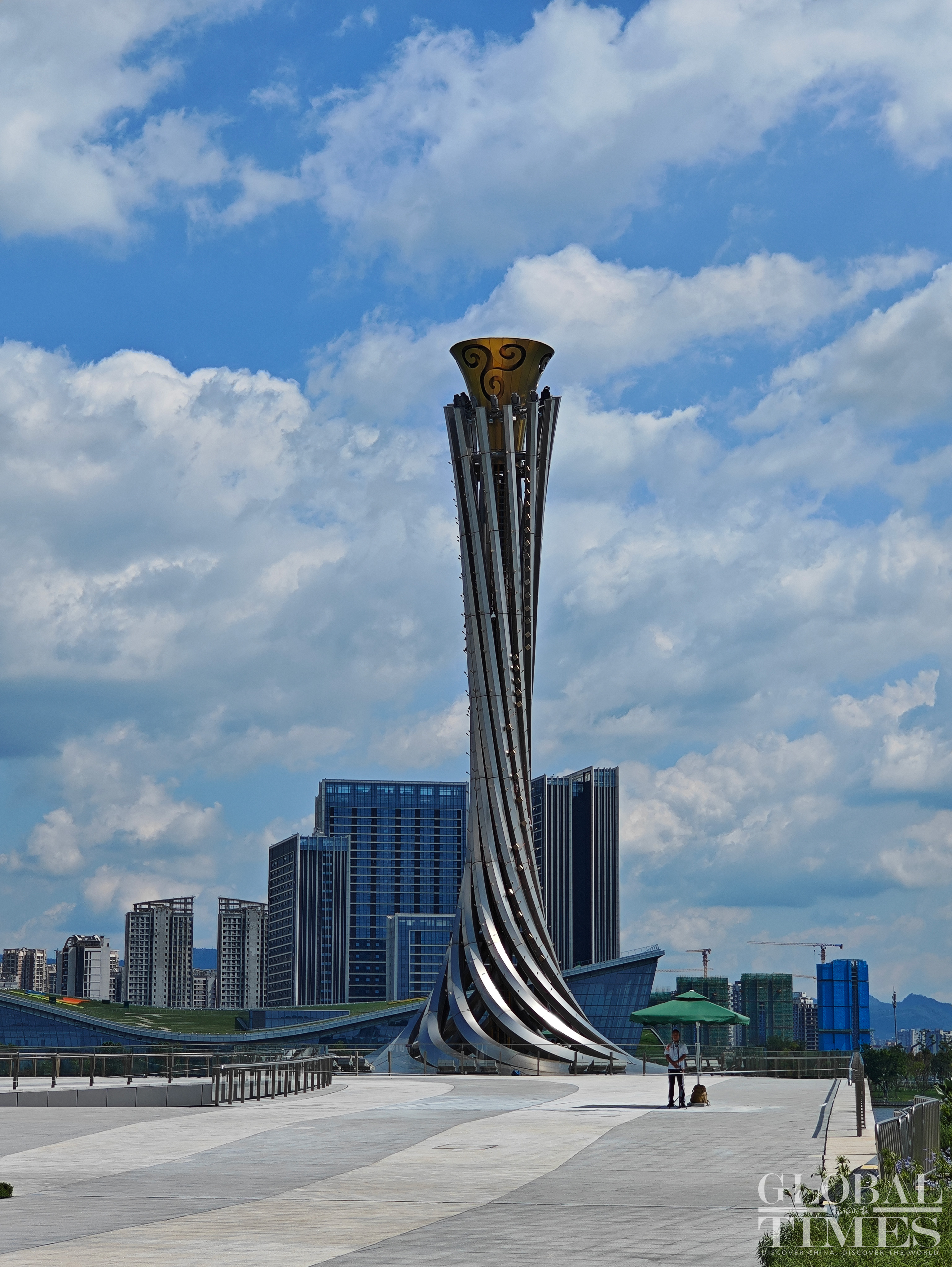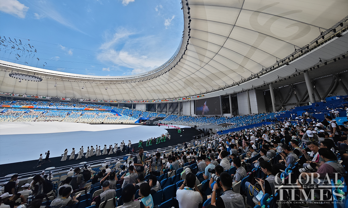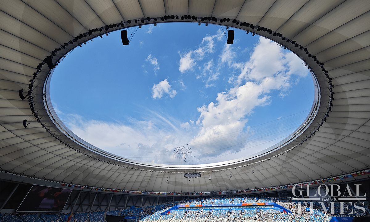 The Dong'an Lake Sports Park Stadium is designed with the theme of "bird of sun god," symbolizing the ancient Shu civilization and the Tianfu culture. The entire venue is in the shape of a circular flying saucer, blending traditional and modern elements, reflecting a sense of harmony, space, and the future. It has been recognized as one of the 40 new landmarks in China. Photos: Chen Tao/GT