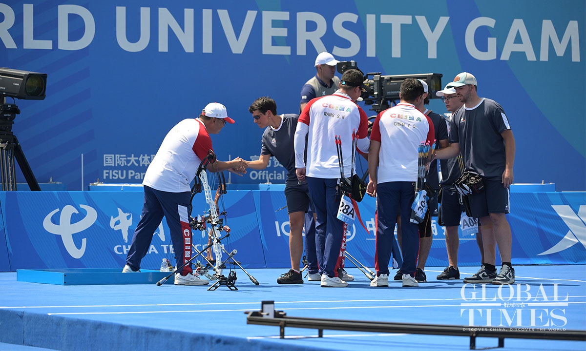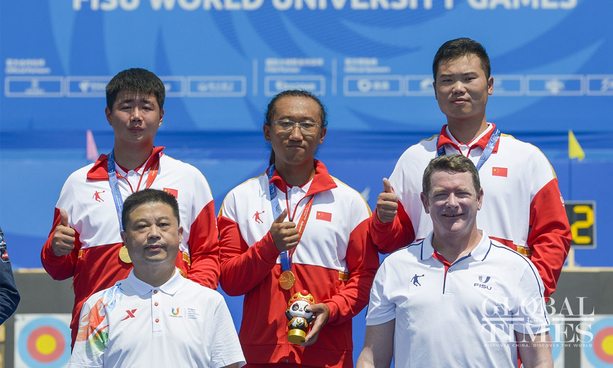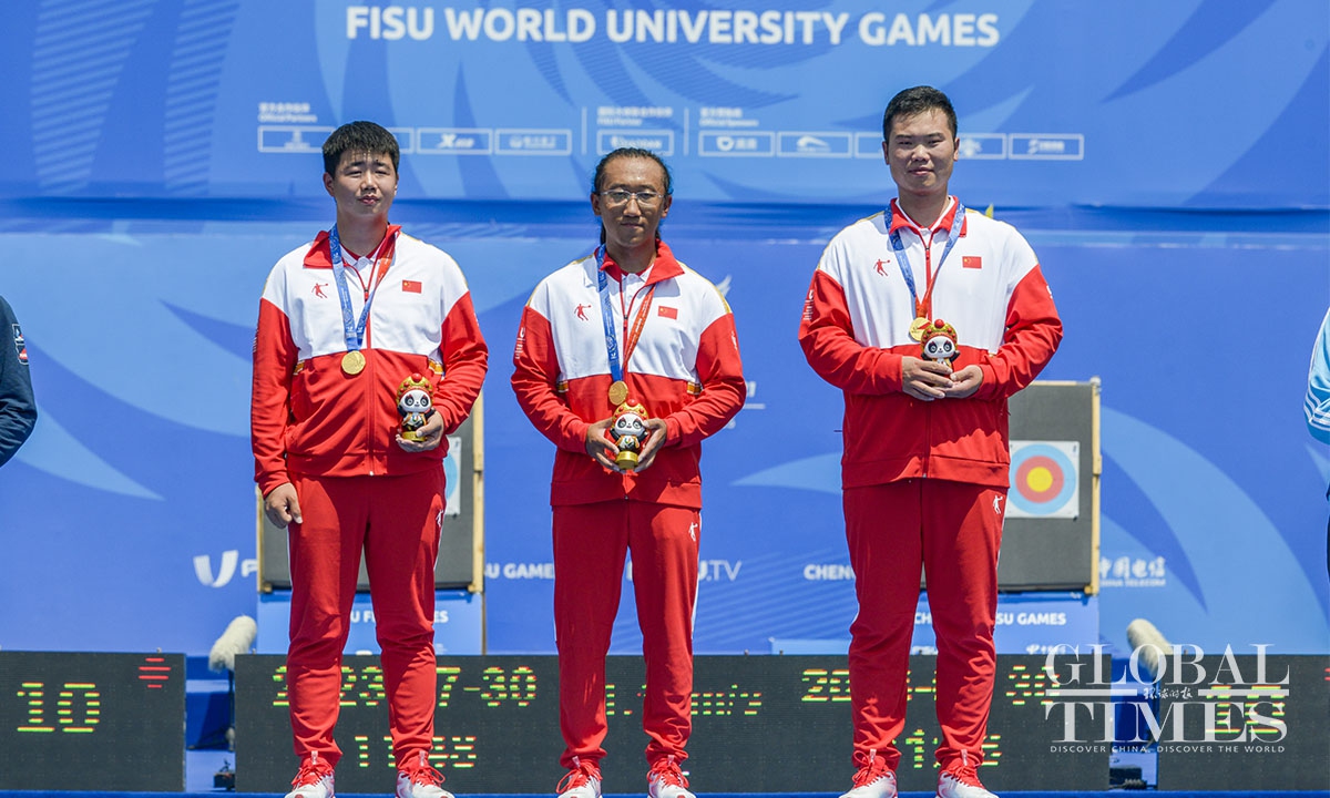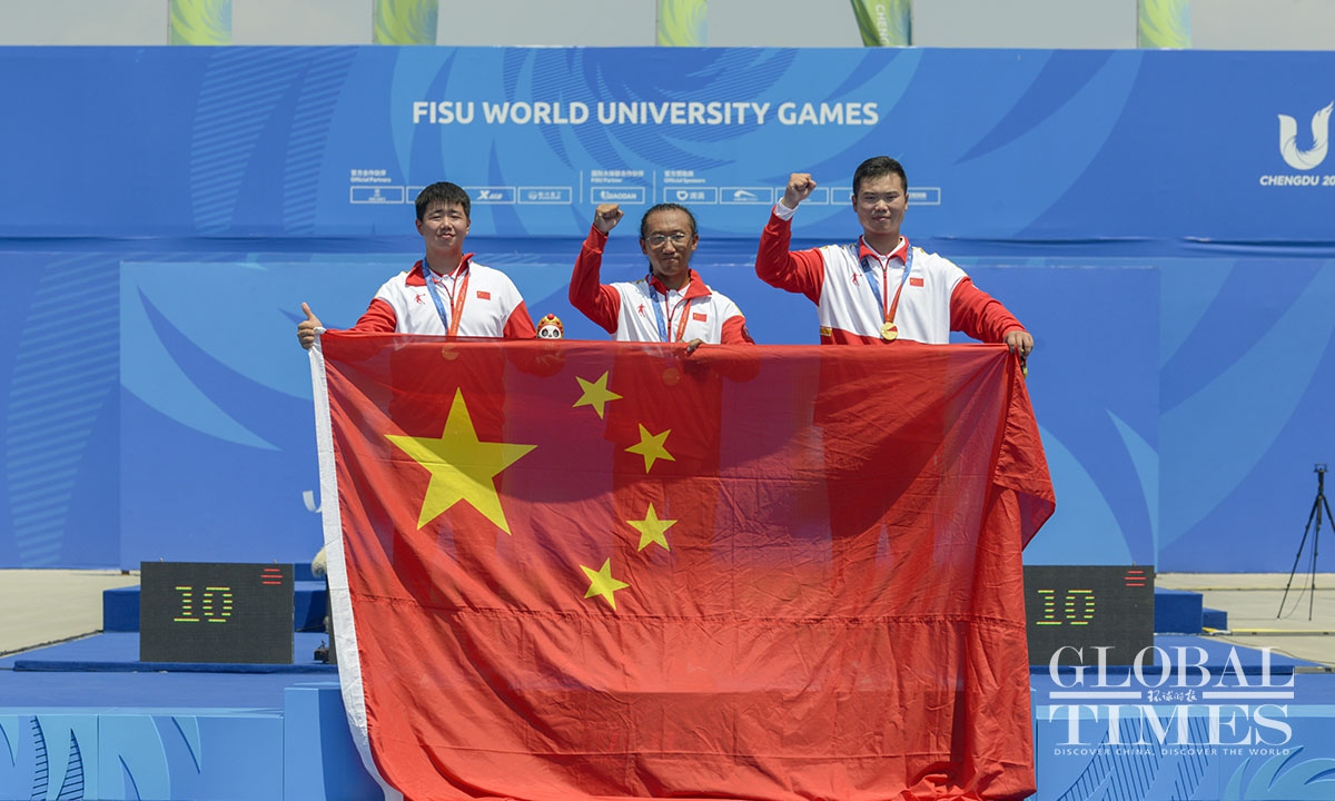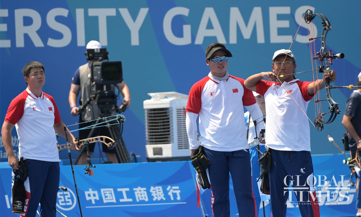 On July 30th, after a fierce competition, the Chinese athletes defeated the French team in the men's compound archery team final at the Chengdu FISU World University Games and won the Chinese Archery Team's first gold medal. Photos: Chen Tao/GT