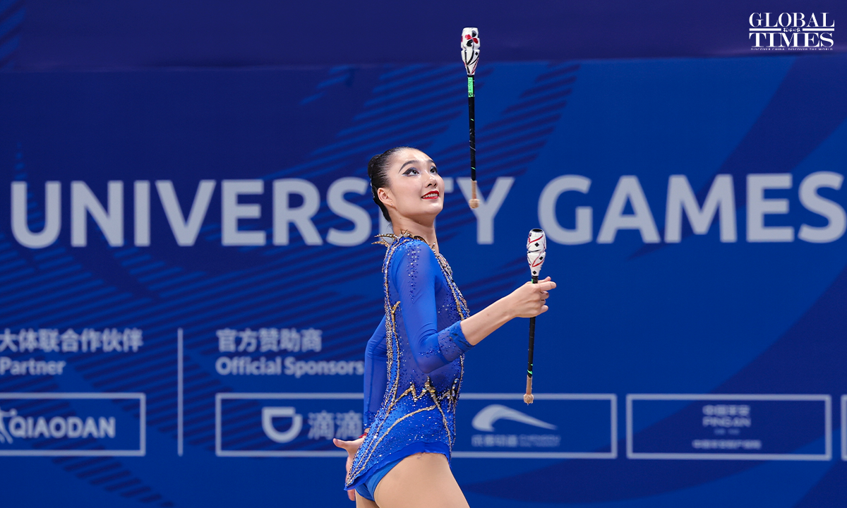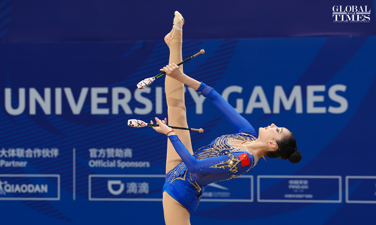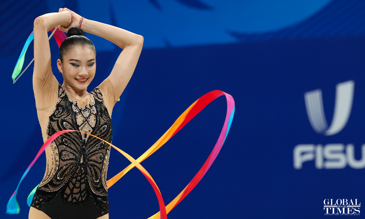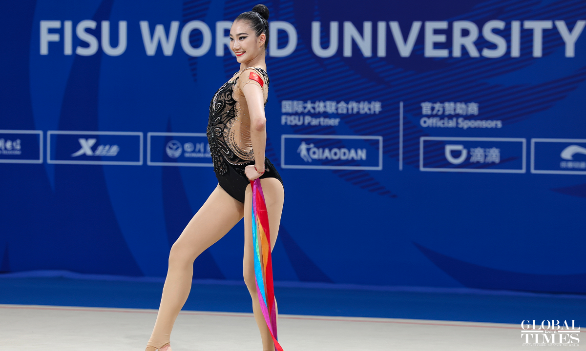 On July 30, 2023, in Chengdu, Sichuan, the 31st Chengdu FISU Games, Chinese athlete Li Huilin competed in the Artistic Gymnastics Individual All-Around (Ribbon and Clubs) event. In the end, she finished in seventh place with a score of 117.550 points. Photos: Cui Meng/GT