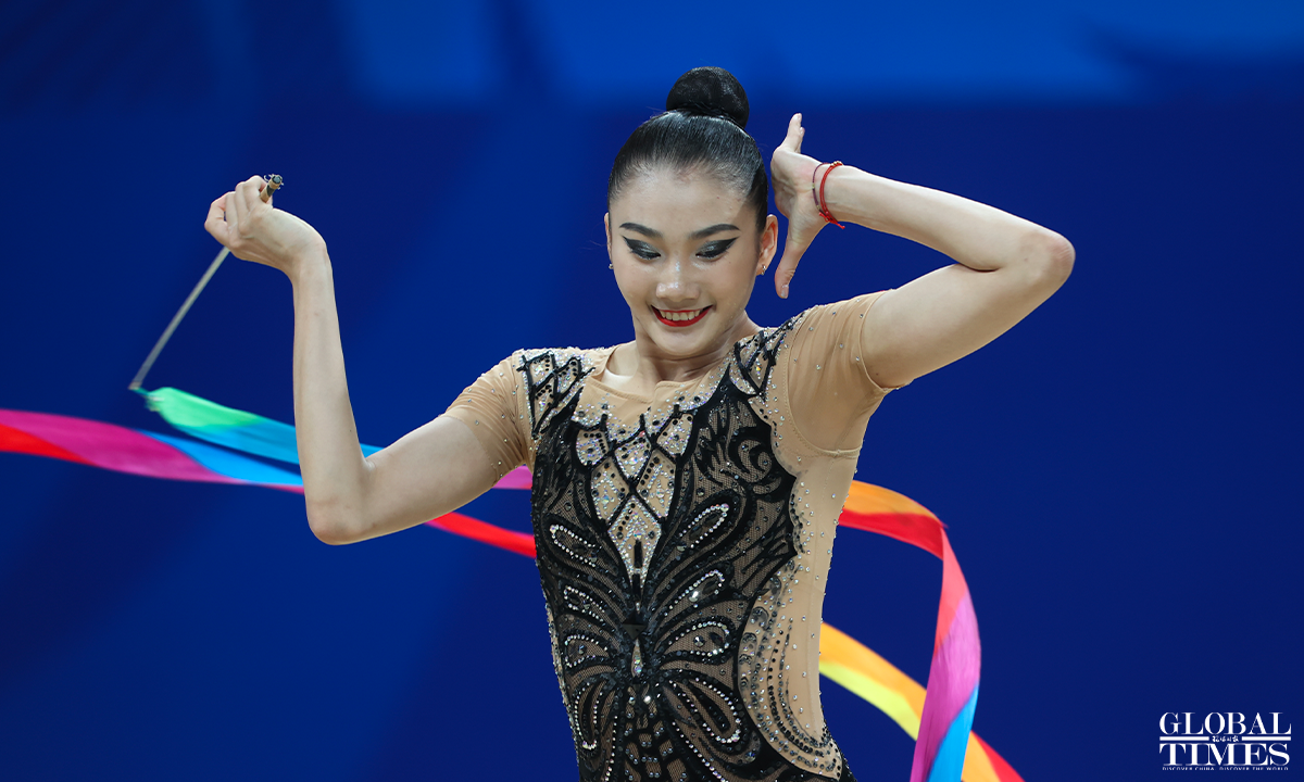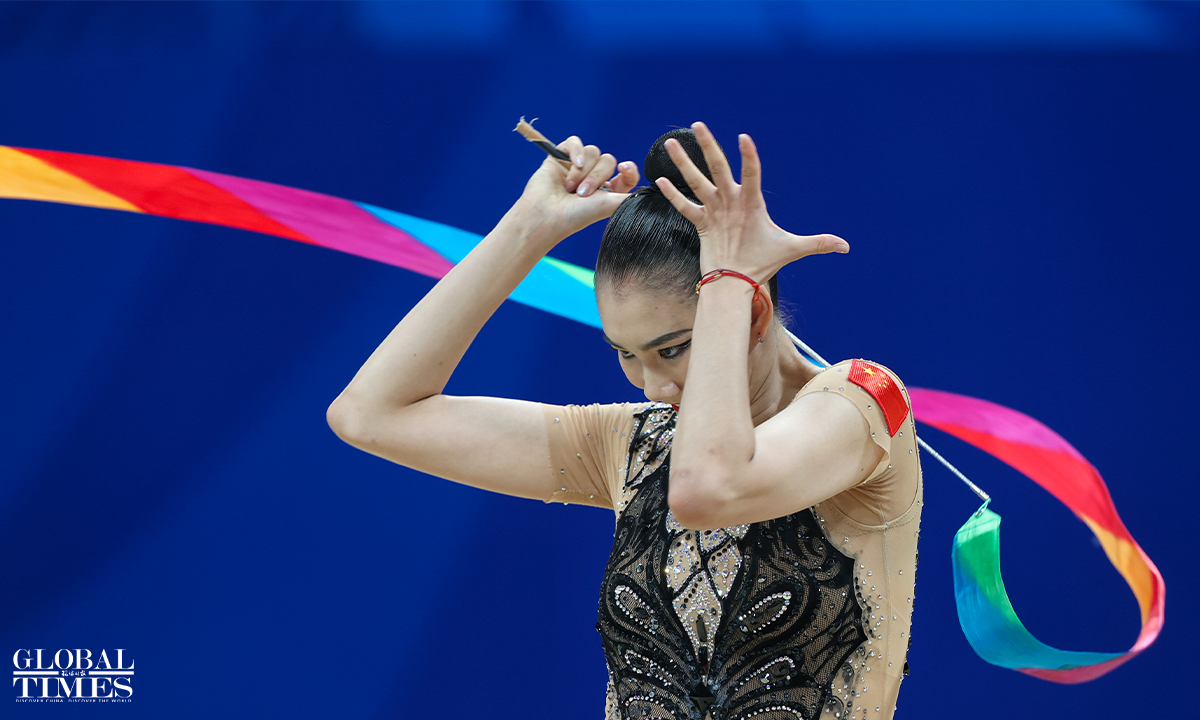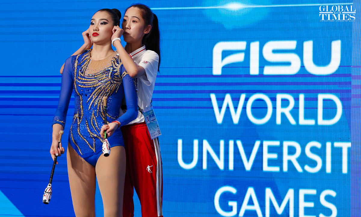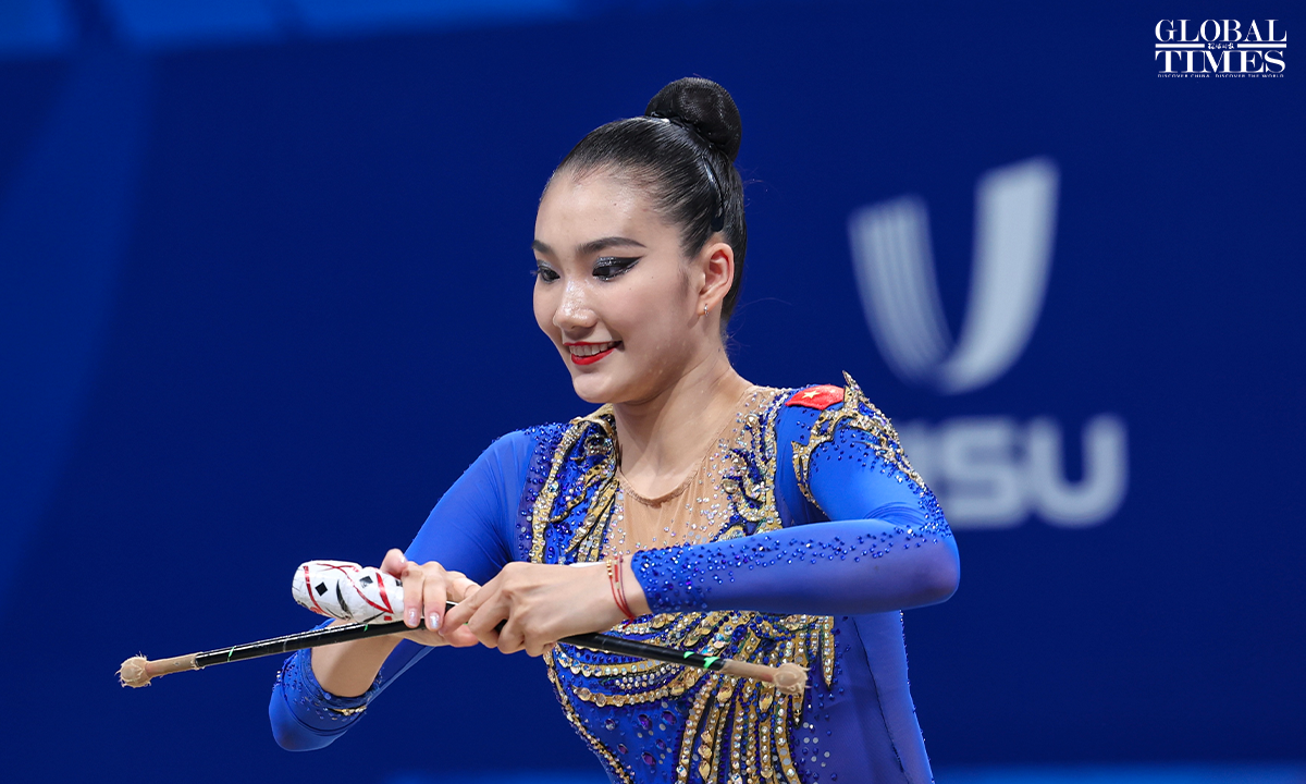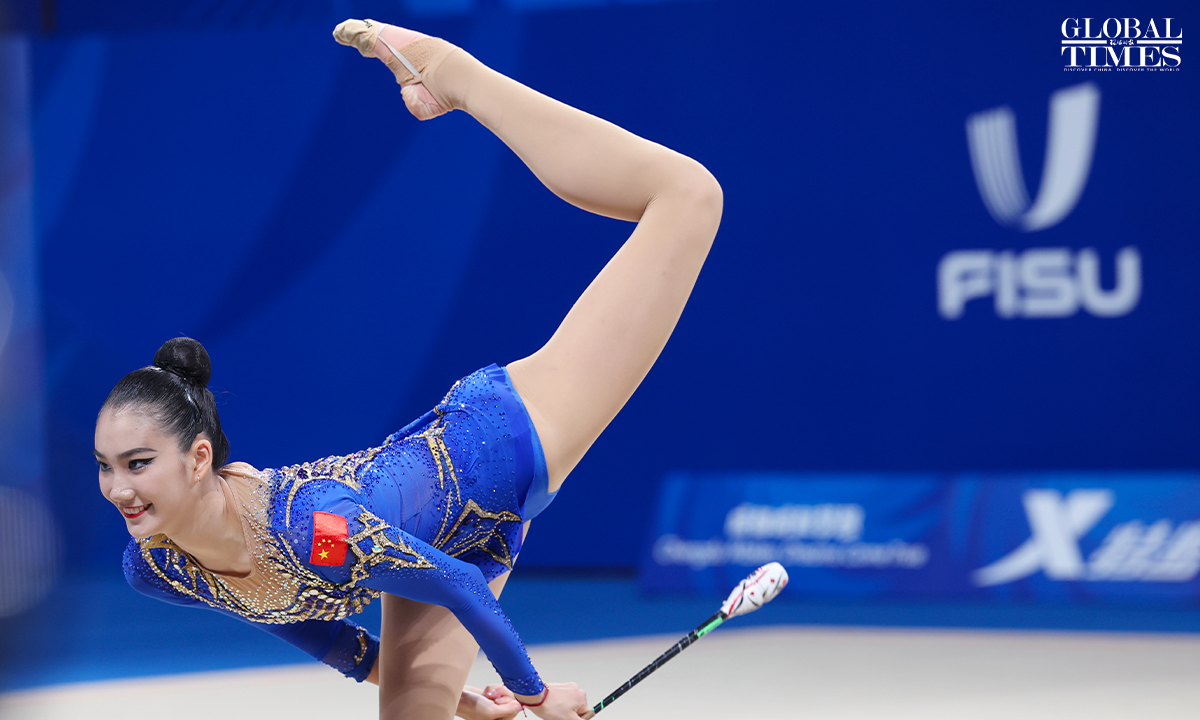 On July 30, 2023, in Chengdu, Sichuan, the 31st Chengdu FISU Games, Chinese athlete Li Huilin competed in the Artistic Gymnastics Individual All-Around (Ribbon and Clubs) event. In the end, she finished in seventh place with a score of 117.550 points. Photos: Cui Meng/GT