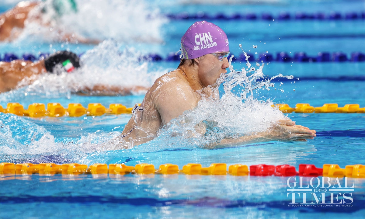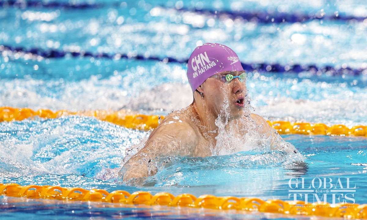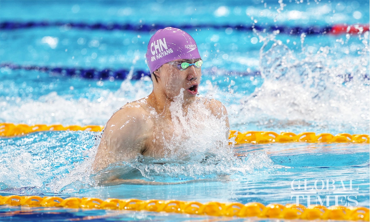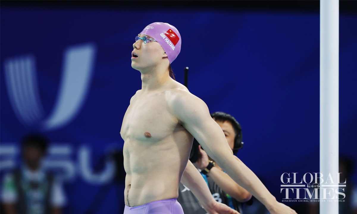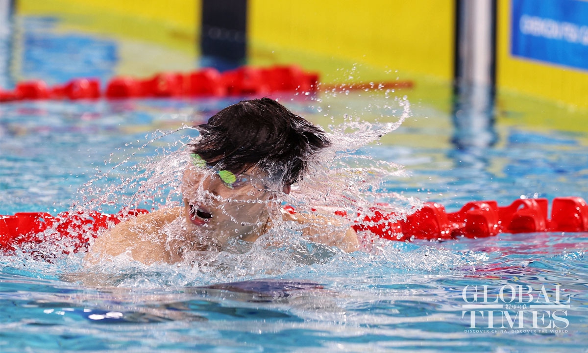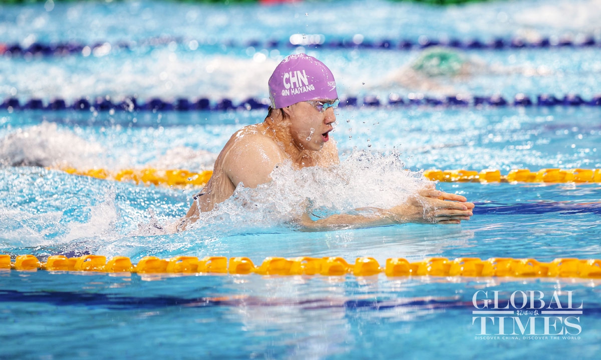 China’s newly crowned triple world champion Qin Haiyang makes a splash in the men’s 100 meters breaststroke heat on Tuesday morning at the FISU Games in Chengdu. He will compete in seven disciplines. Photos: Cui Meng/GT
