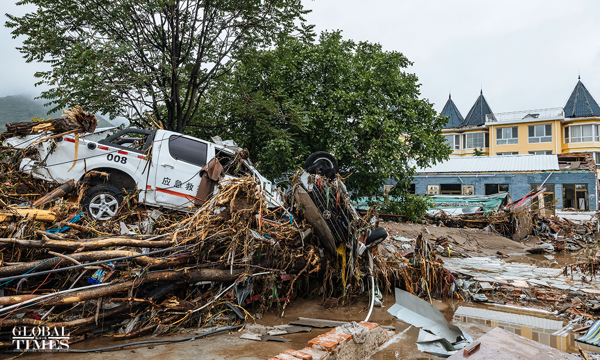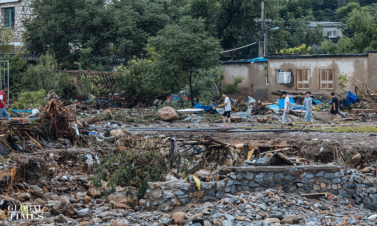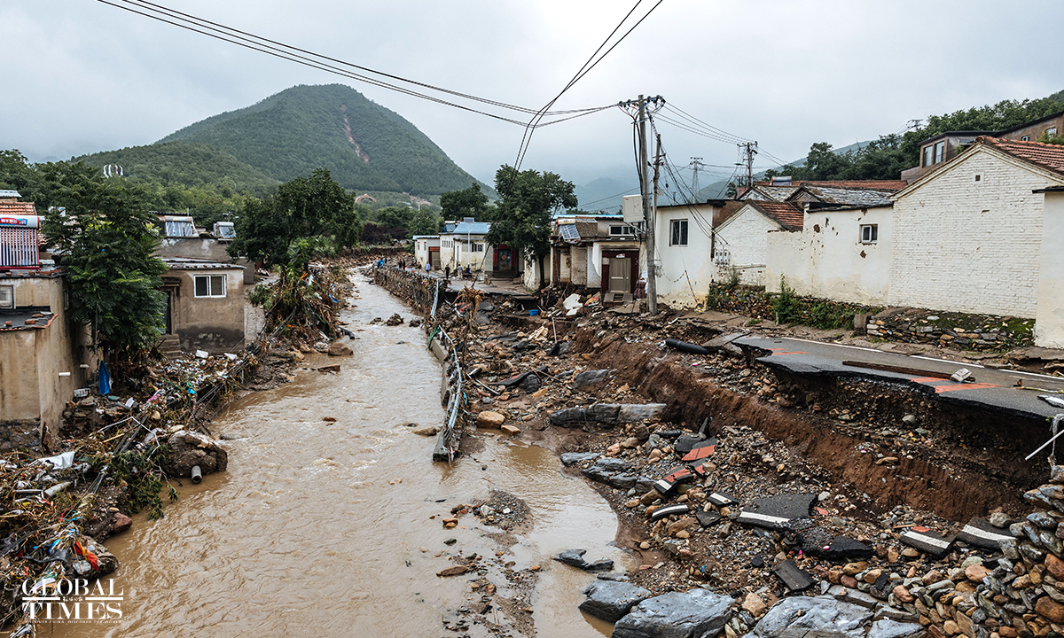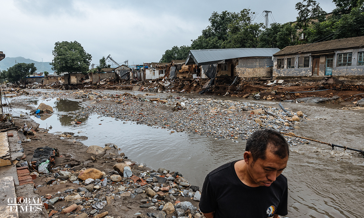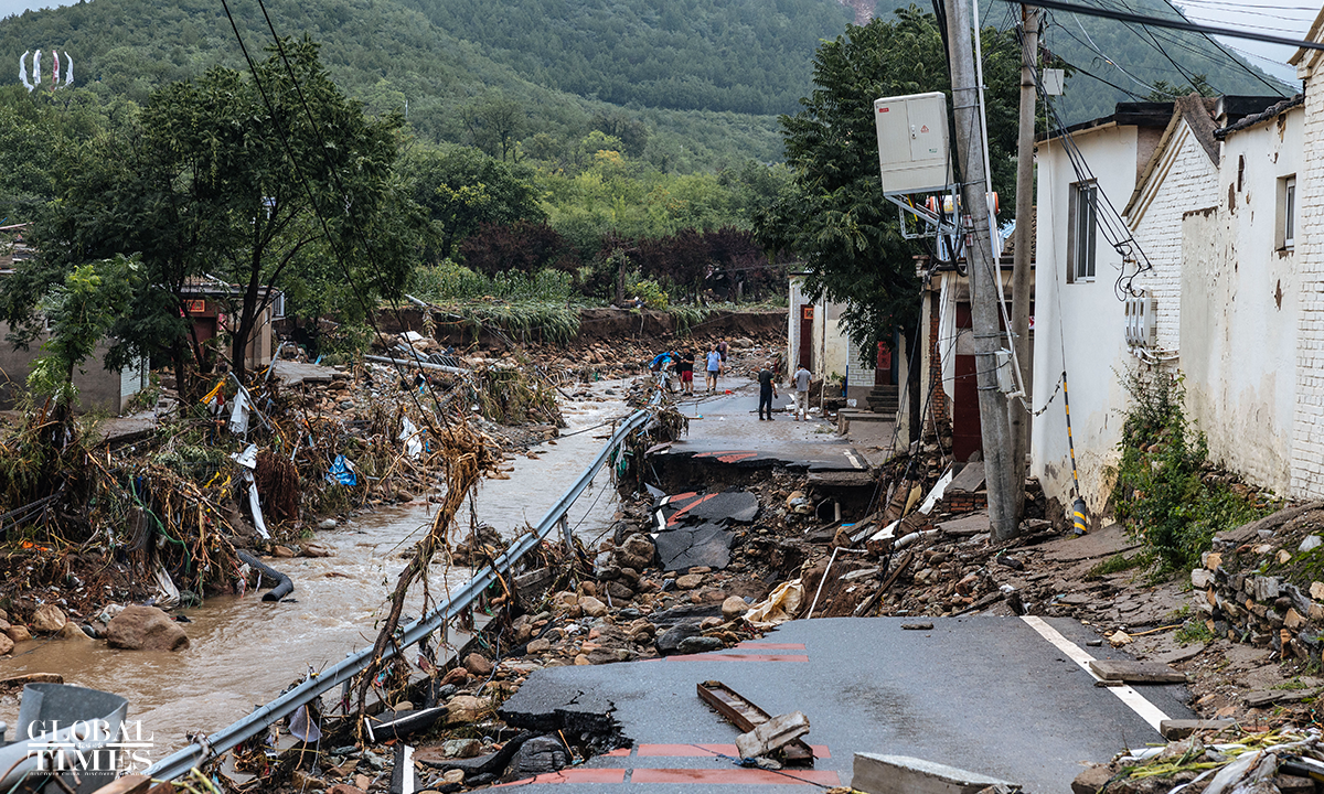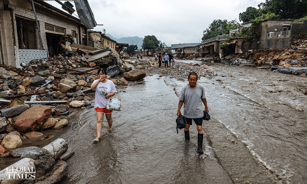 As Beijing is struck by the heaviest rain in decades for consecutive days, the Tanzhesi township in Beijing's mountainous Mentougou district has been severely affected. With the assistance of rescue teams and village volunteers, all residents in Nanxinfang village in the township have been evacuated to safe locations. Currently, the city's waterways are experiencing rising water levels and flooding, with the water carrying debris such as mud, damaged tree branches and even cars. Photos: Li Hao/GT