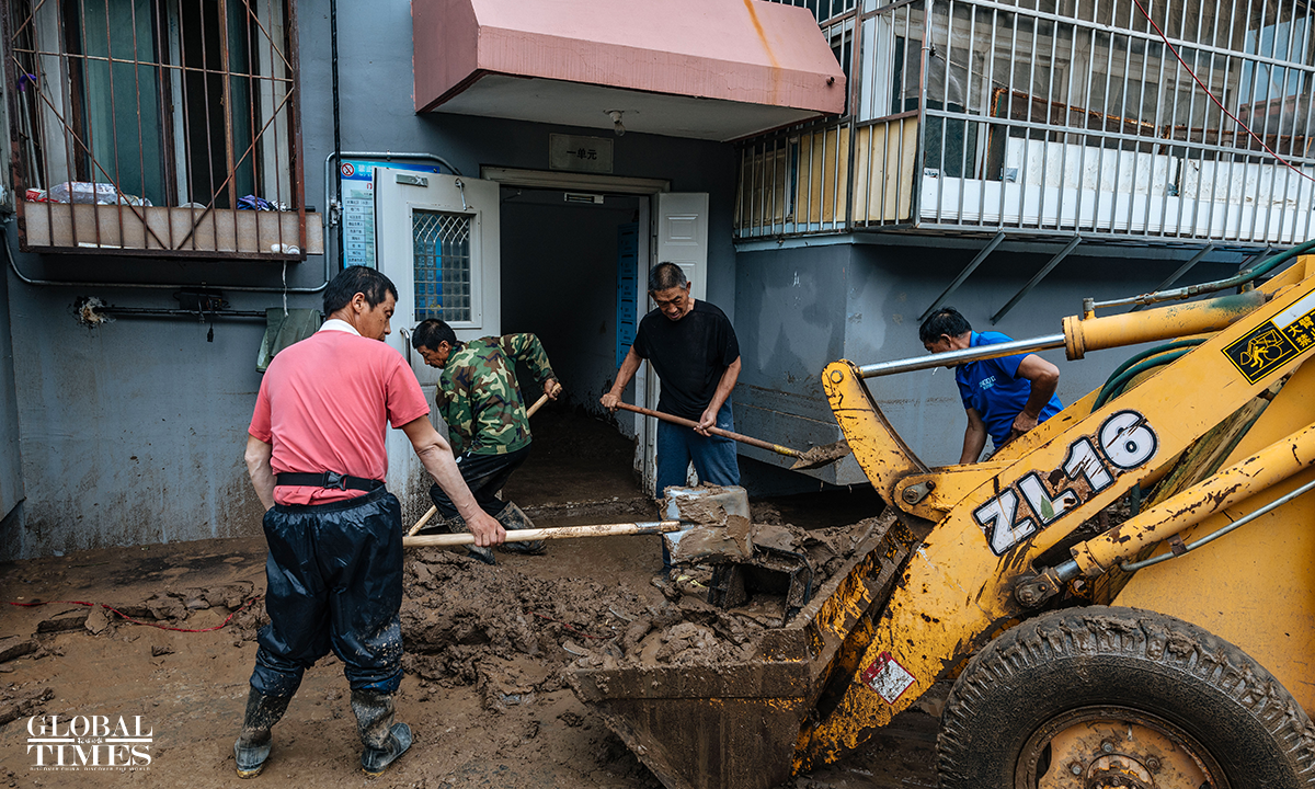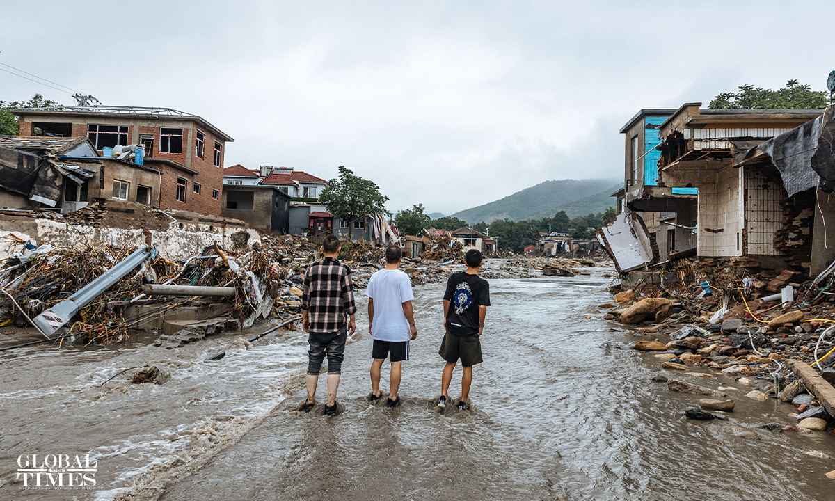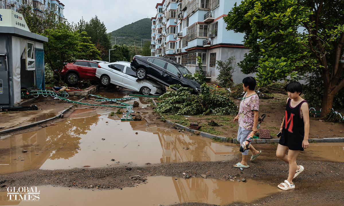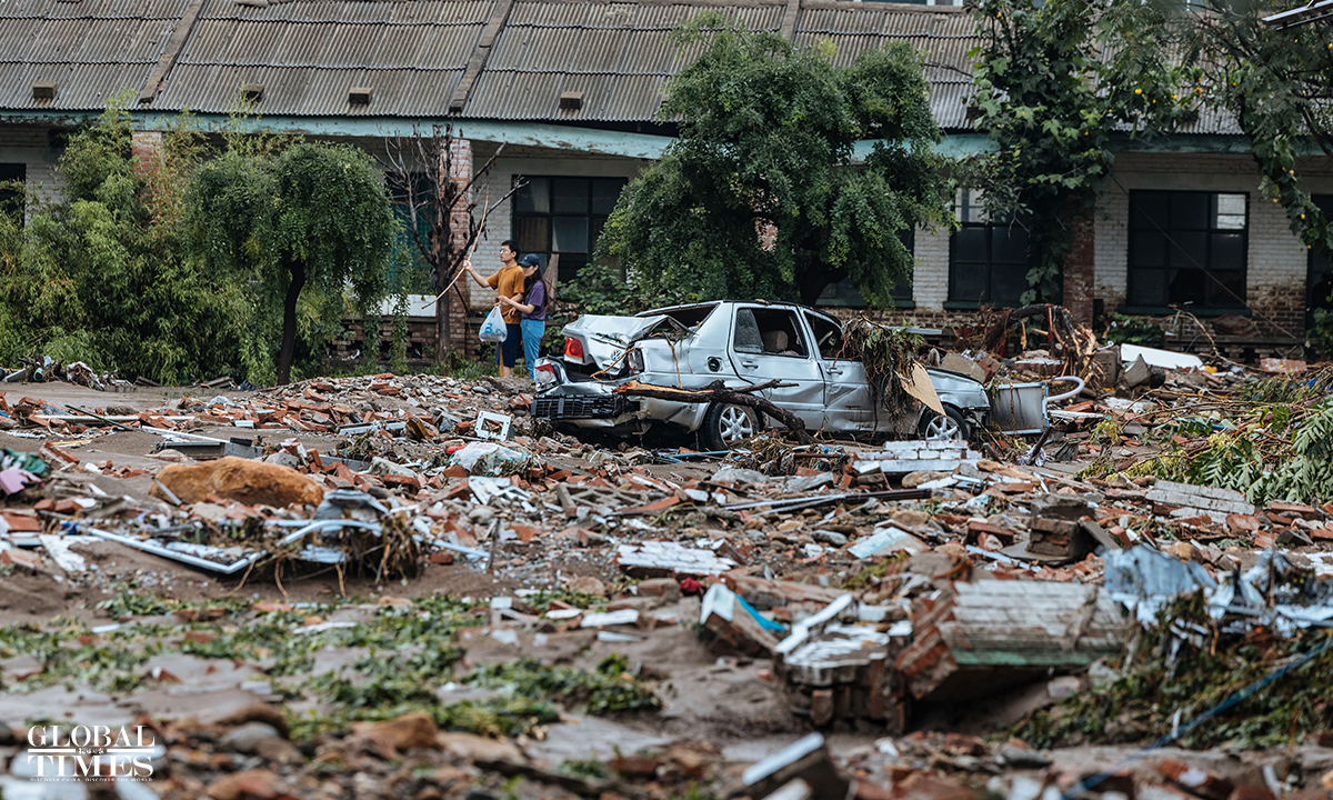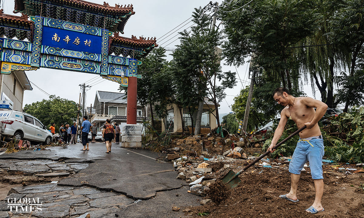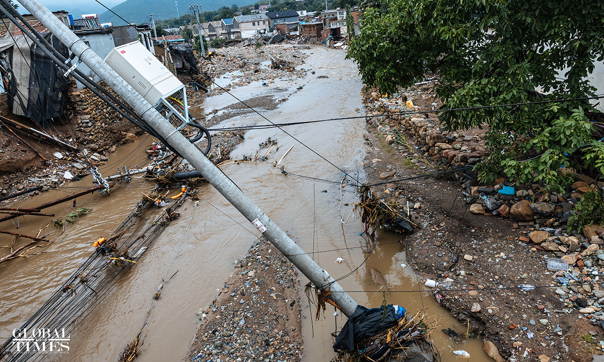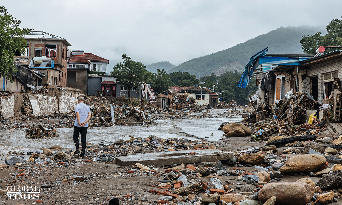 As Beijing is struck by the heaviest rain in decades for consecutive days, the Tanzhesi township in Beijing's mountainous Mentougou district has been severely affected. With the assistance of rescue teams and village volunteers, all residents in Nanxinfang village in the township have been evacuated to safe locations. Currently, the city's waterways are experiencing rising water levels and flooding, with the water carrying debris such as mud, damaged tree branches and even cars. Photos: Li Hao/GT