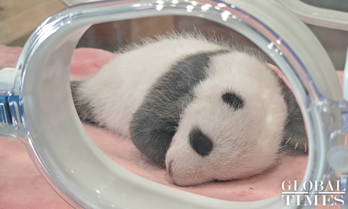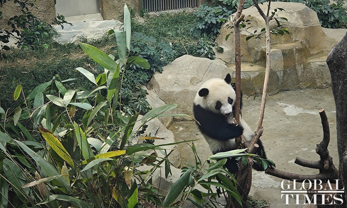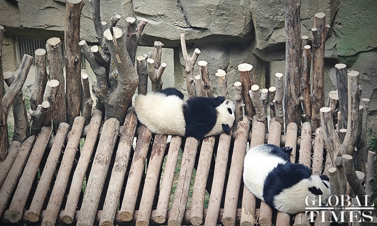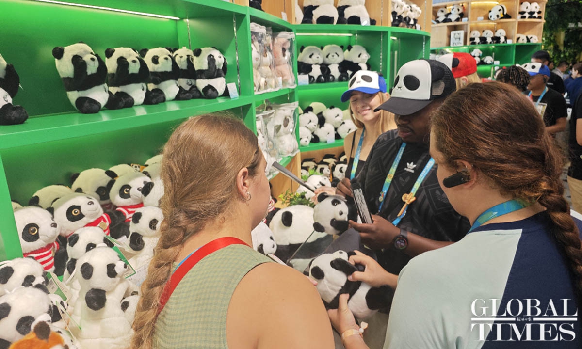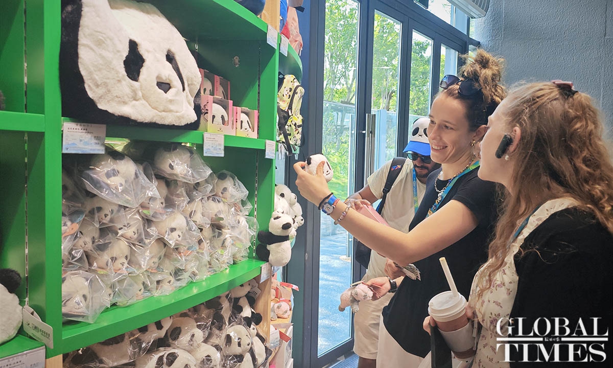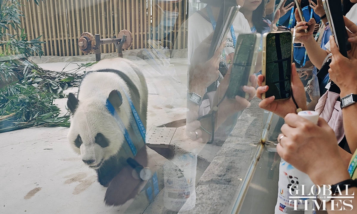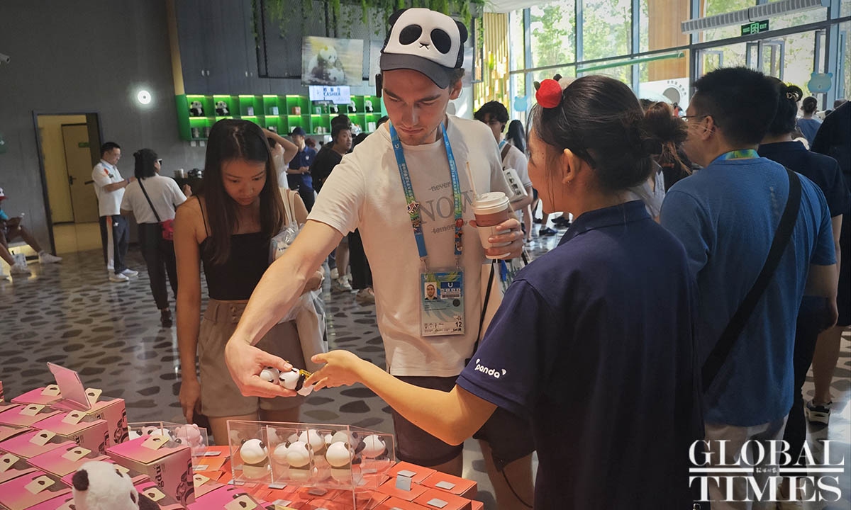 On Saturday, university athletes from various countries, including China’s top swimmer Zhang Yufei, visited the Chengdu Research Base of Giant Panda Breeding. Today happens to be the full moon day of the newborn panda cub Xingyun. Seeing pandas eating, playing or sleeping on trees, on shelves or even in incubators, athletes excitedly held up their mobile phones to take crazy photos and buy panda-themed accessories in souvenir shops. (Photos: Lin Xiaoyi/GT)