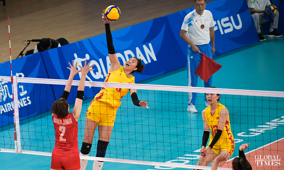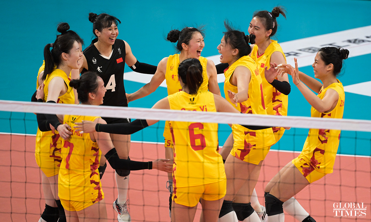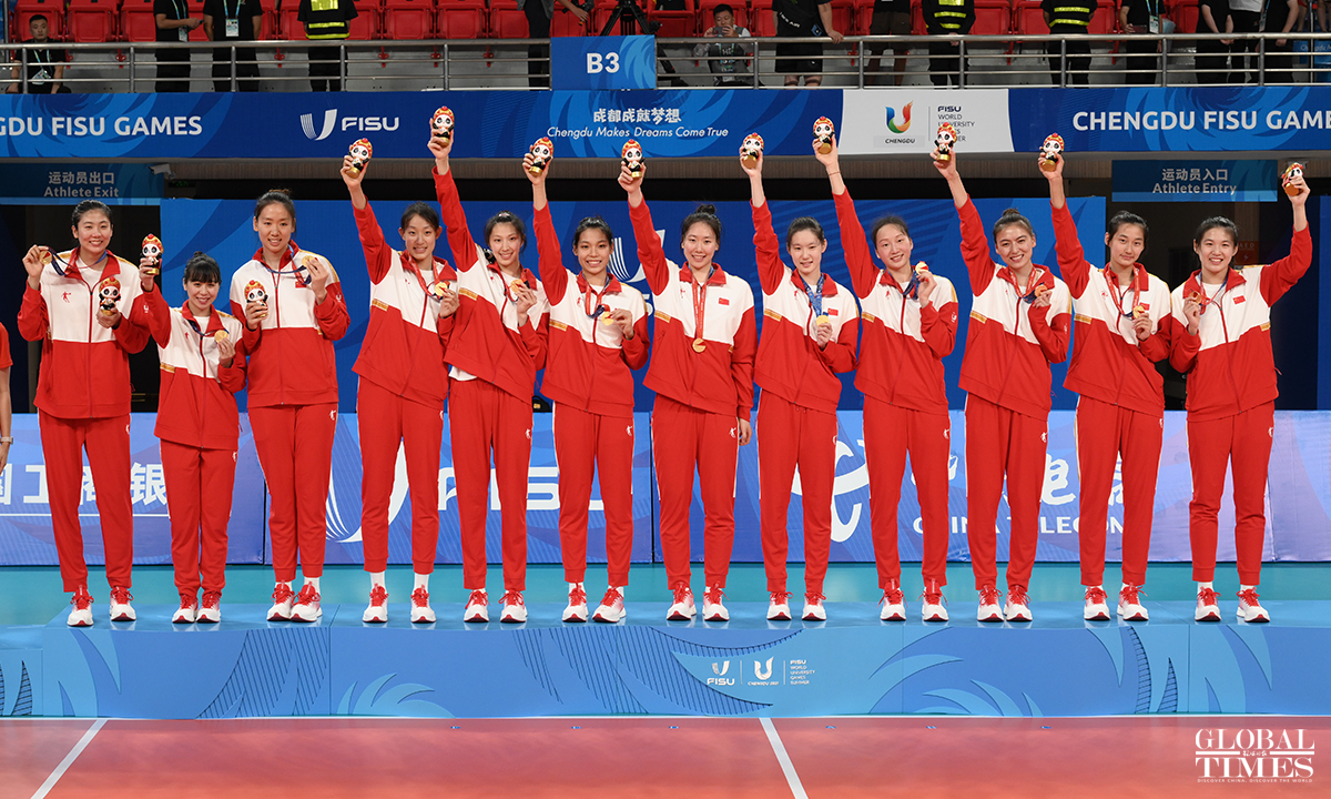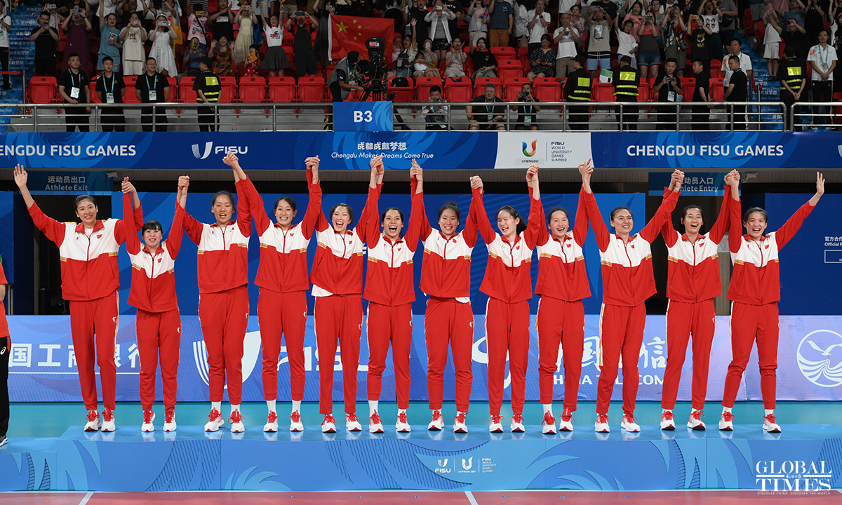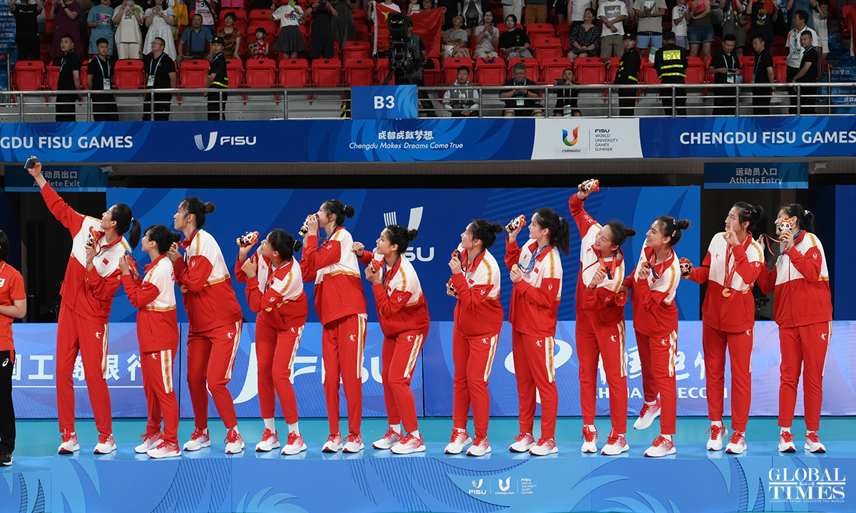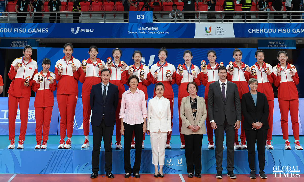Team China edged past Japan 29-27, 29-27, 25-22 to win the women's volleyball gold medal at the Chengdu Universiade on Sunday. The Japanese team and the Polish team claimed the silver and bronze medals, respectively. Photos: Chen Tao/GT