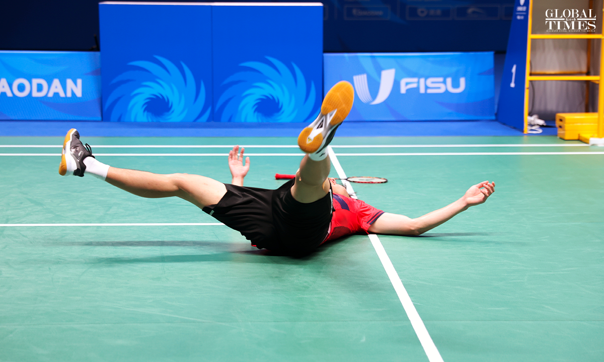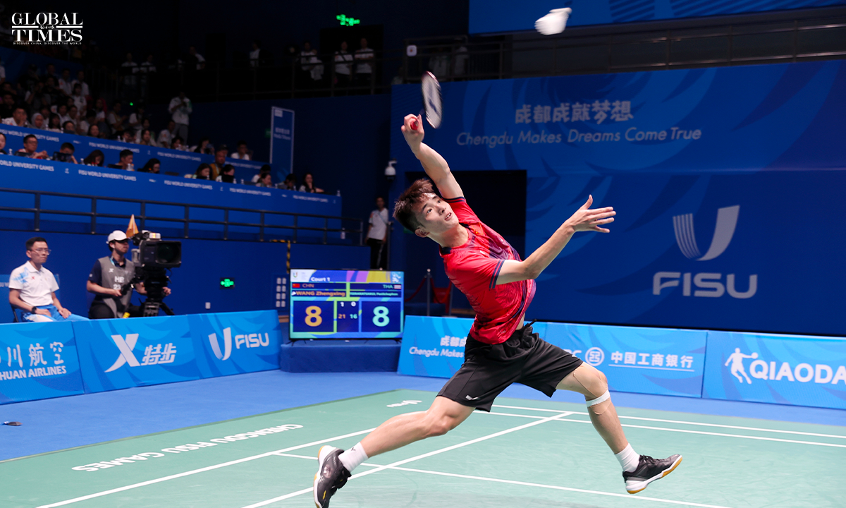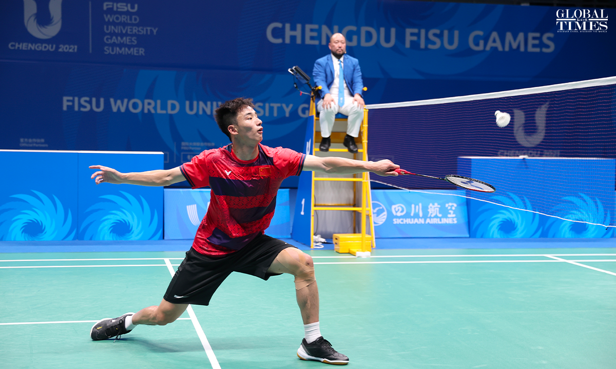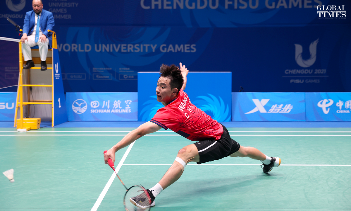In the men's singles final, the last match of the badminton tournament, China's Wang Zhengxing defeated Thailand's Teeraratsakul Panitchaphon 21-16, 21-14 and claimed gold, at Chengdu Universiade on Sunday. Photos: Cui Meng/GT