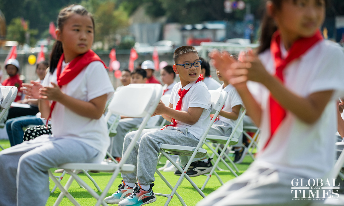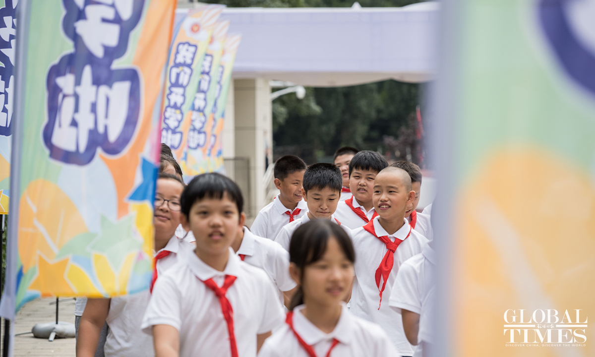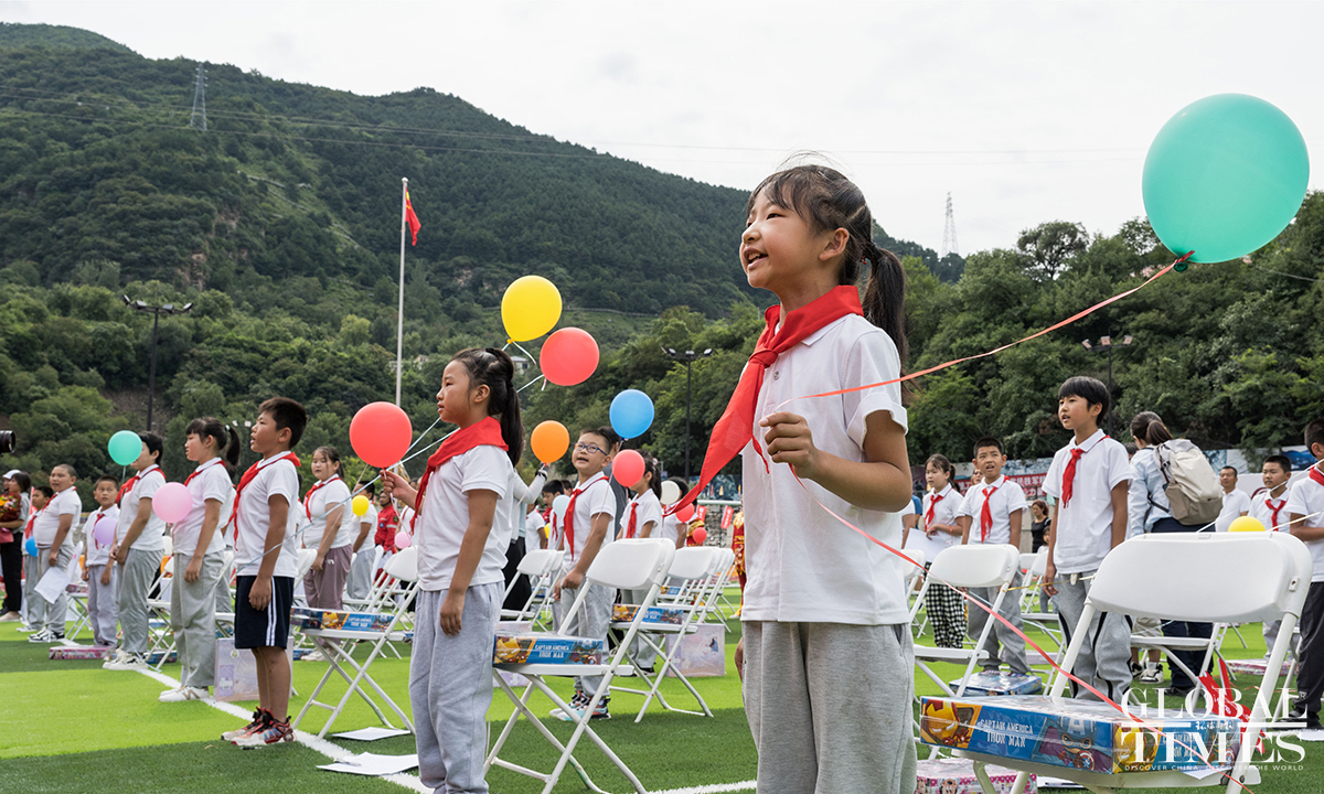 Xiayunling Central Elementary School, which suffered severe damage due to Beijing's record rainfall in August, has started its new semester as scheduled. Students, teachers, and parents were joined by emergency construction workers on the refurbished playground.