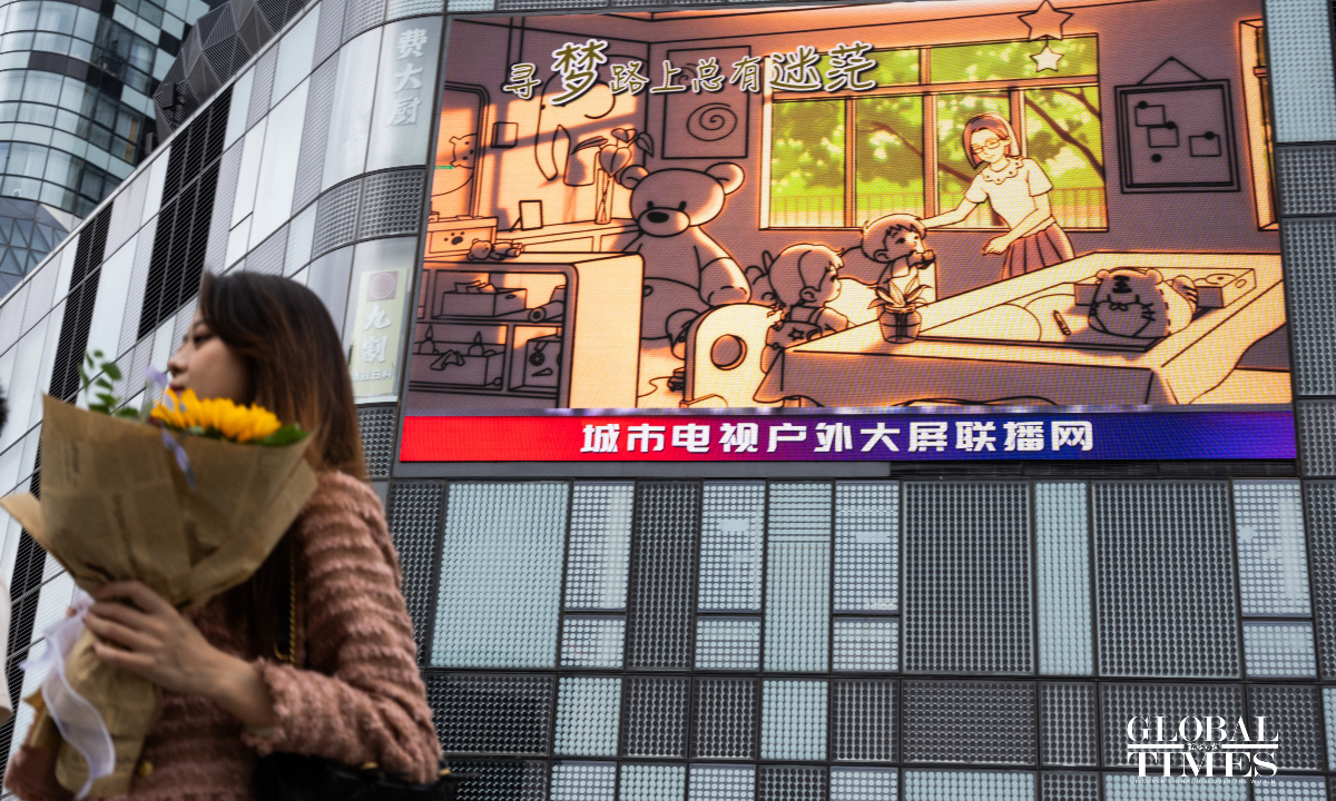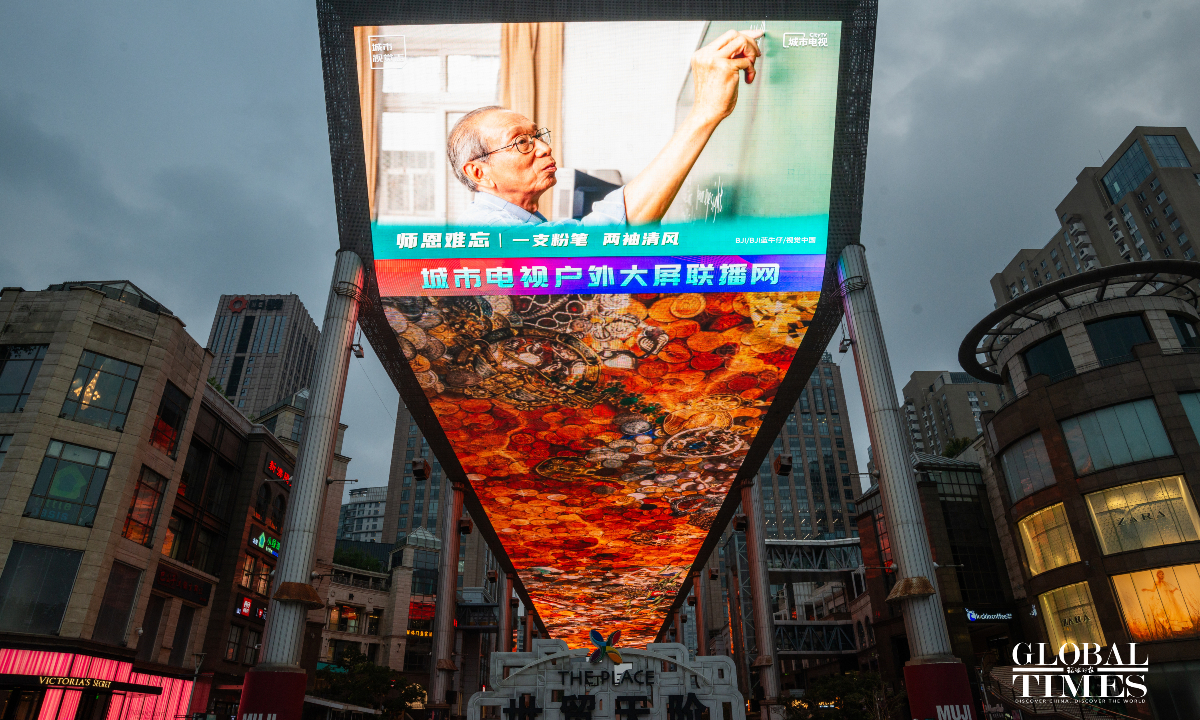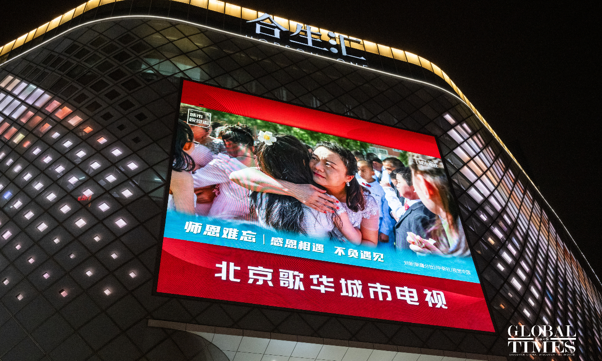 September 10, 2023 marks China's 39th Teachers' Day, a day dedicated to honoring educators. Outdoor large screens in many business districts in Beijing light up with pictures to celebrate this festival for teachers. (Photos:Chen Tao/GT)