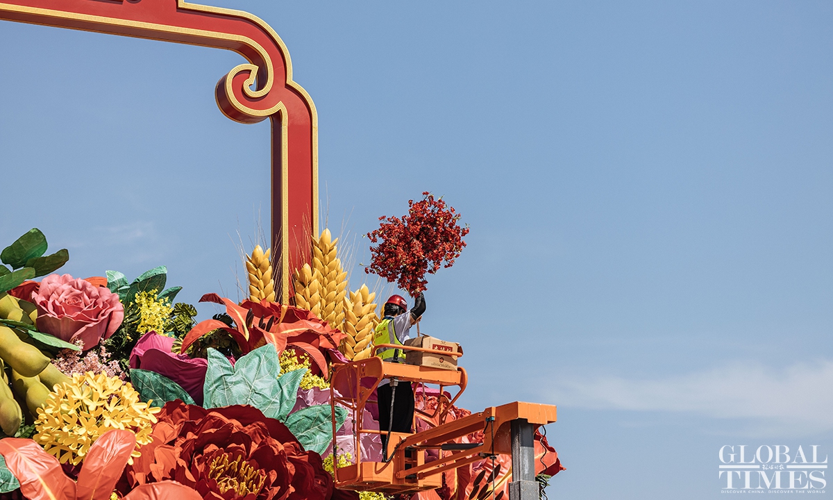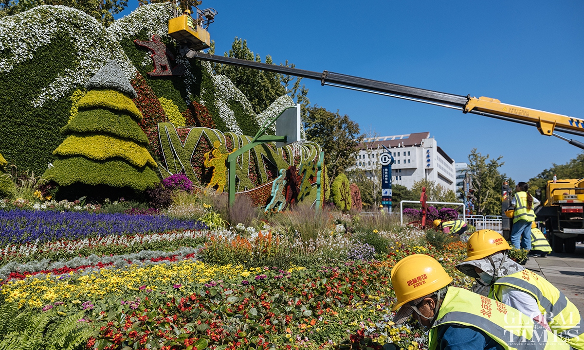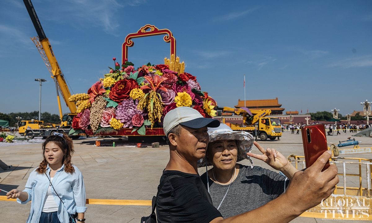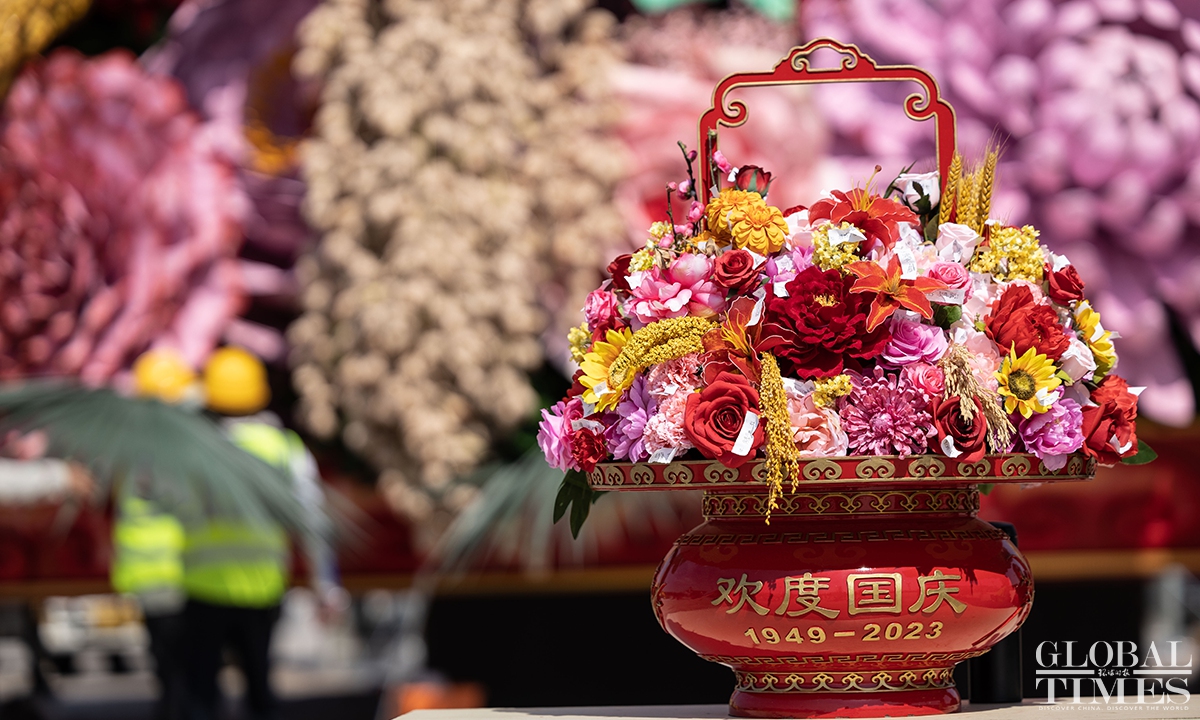 Staff from the Beijing Municipal Bureau of Landscape and Greening have arranged a giant flower basket with the words "Bless the Motherland" at Tiananmen Square. The basket is filled with flowers that symbolize good wishes and abundant harvest, such as rice, wheat, millet, yellow corn, and soybeans, representing a prosperous scene of blooming flowers and abundant grains. It expresses the determination of people from all ethnic groups in China to build a better future together on the great journey of realizing the Chinese Dream. Photos:Li Hao/GT