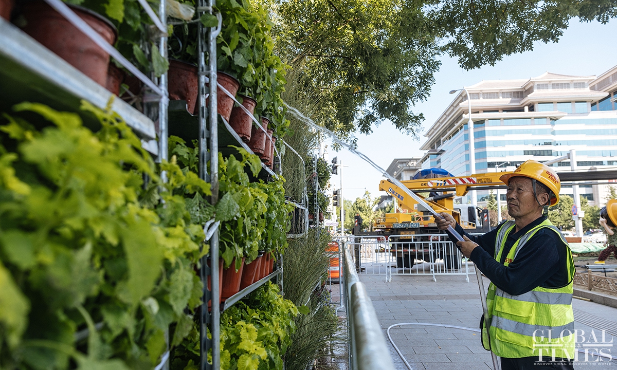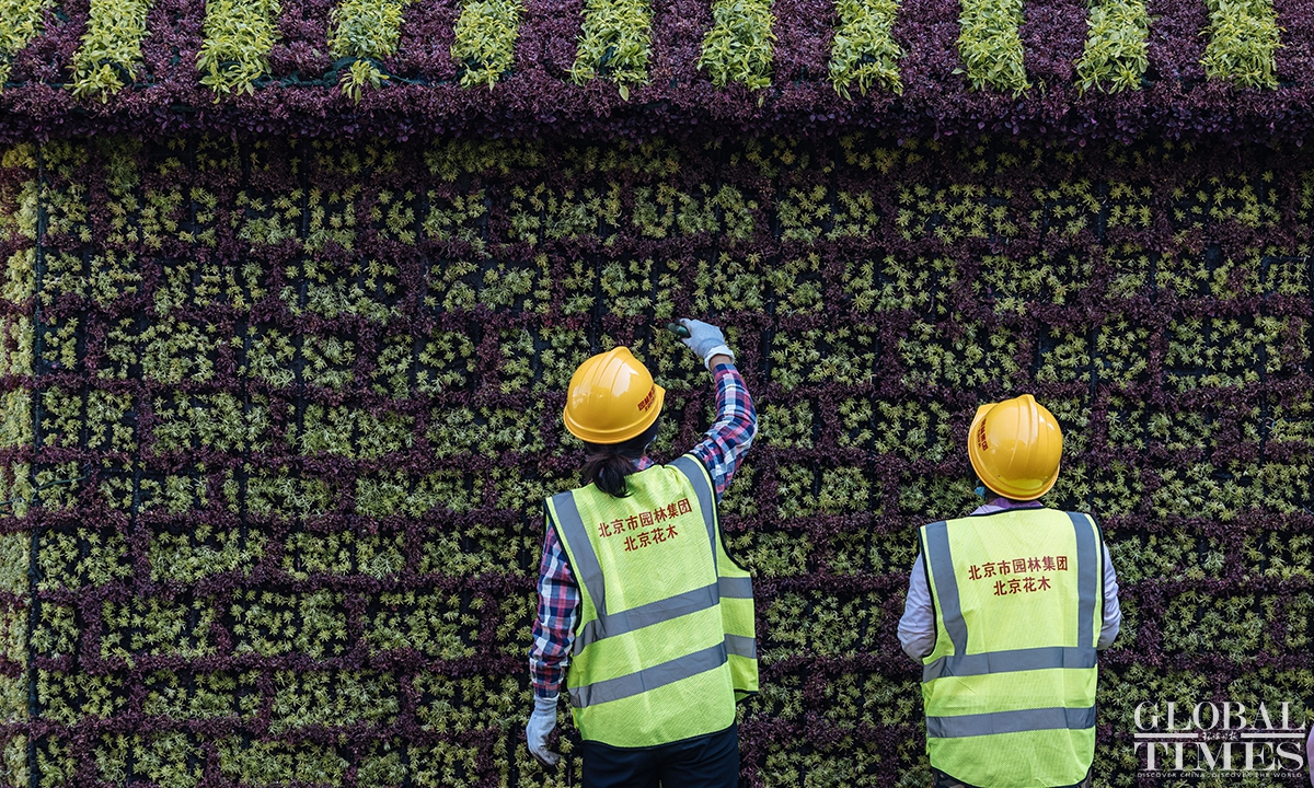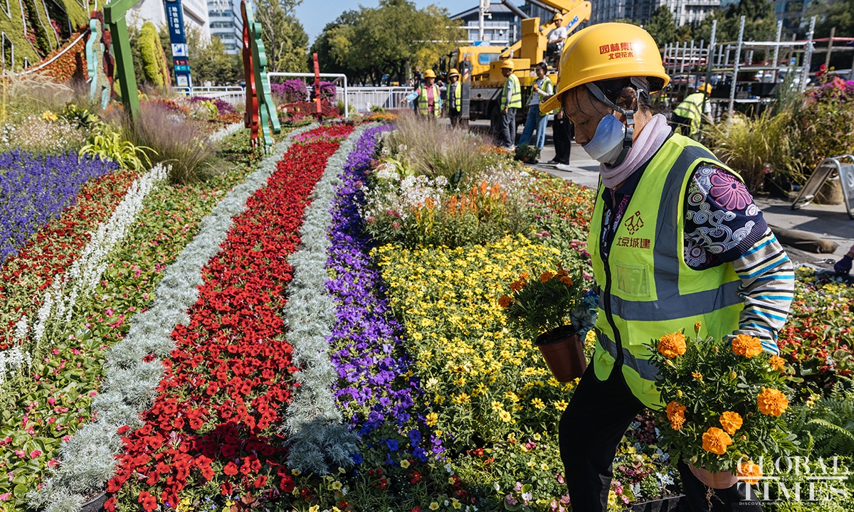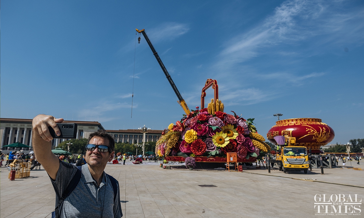 Staff from the Beijing Municipal Bureau of Landscape and Greening have arranged a giant flower basket with the words "Bless the Motherland" at Tiananmen Square. The basket is filled with flowers that symbolize good wishes and abundant harvest, such as rice, wheat, millet, yellow corn, and soybeans, representing a prosperous scene of blooming flowers and abundant grains. It expresses the determination of people from all ethnic groups in China to build a better future together on the great journey of realizing the Chinese Dream. Photos:Li Hao/GT