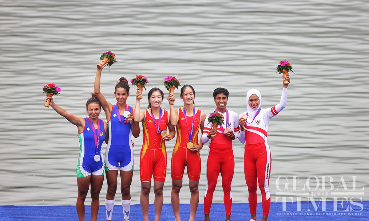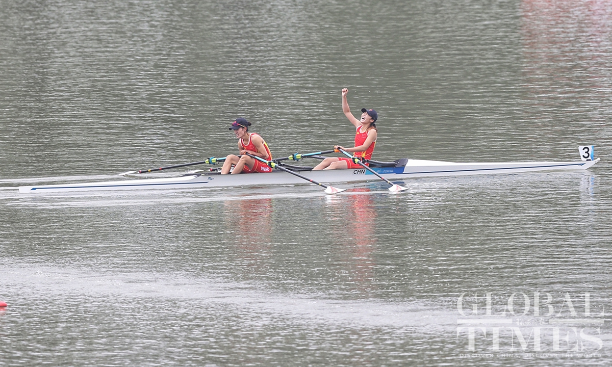 On Sunday morning, China secured the opening gold at the Hangzhou Asian Games in the women's lightweight double sculls. Zou Jiaqi and Qiu Xiuping clinched victory with a comfortable lead, completing the race in 7 minutes and 6.78 seconds, Uzbekistan and Indonesia came in second & third respectively.(Photos: Cui Meng/GT)