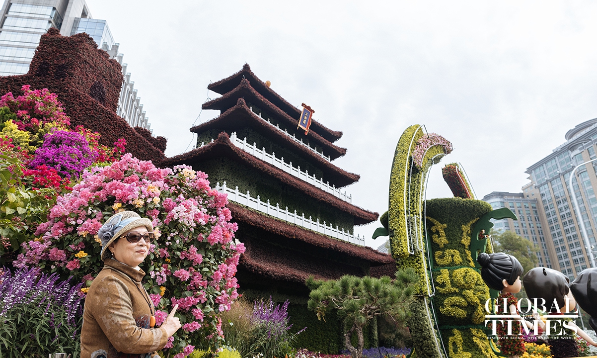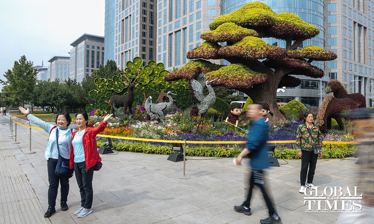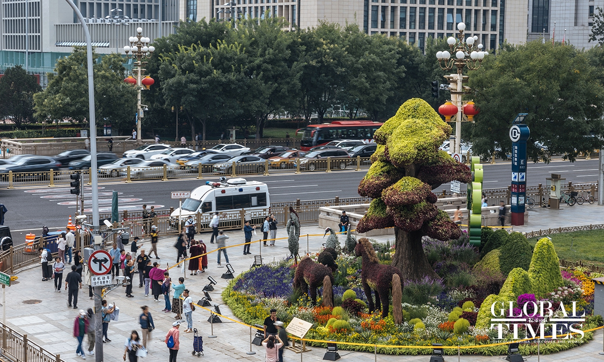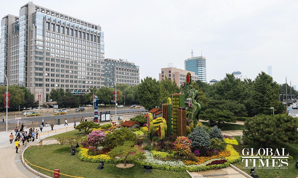 On September 25, an 18-meter-tall flower basket display was officially unveiled at the Tiananmen Square to celebrate China's National Day on October 1. Additionally, 10 meticulously designed three-dimensional flower beds were arranged and completed along the Chang'an Avenue. Photos: Li Hao/GT
