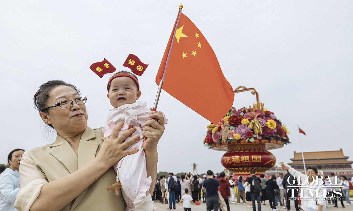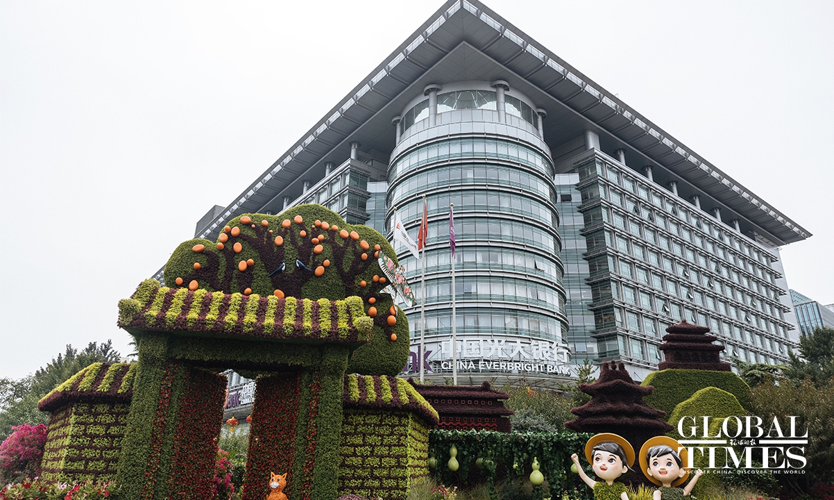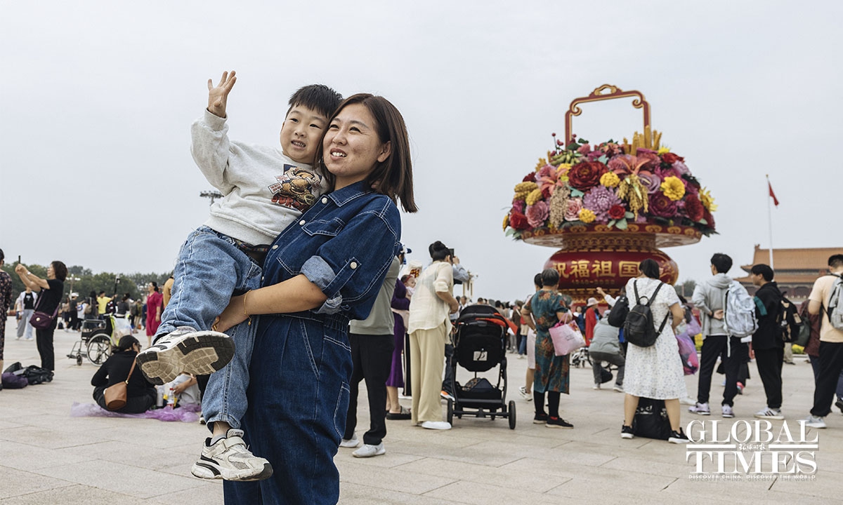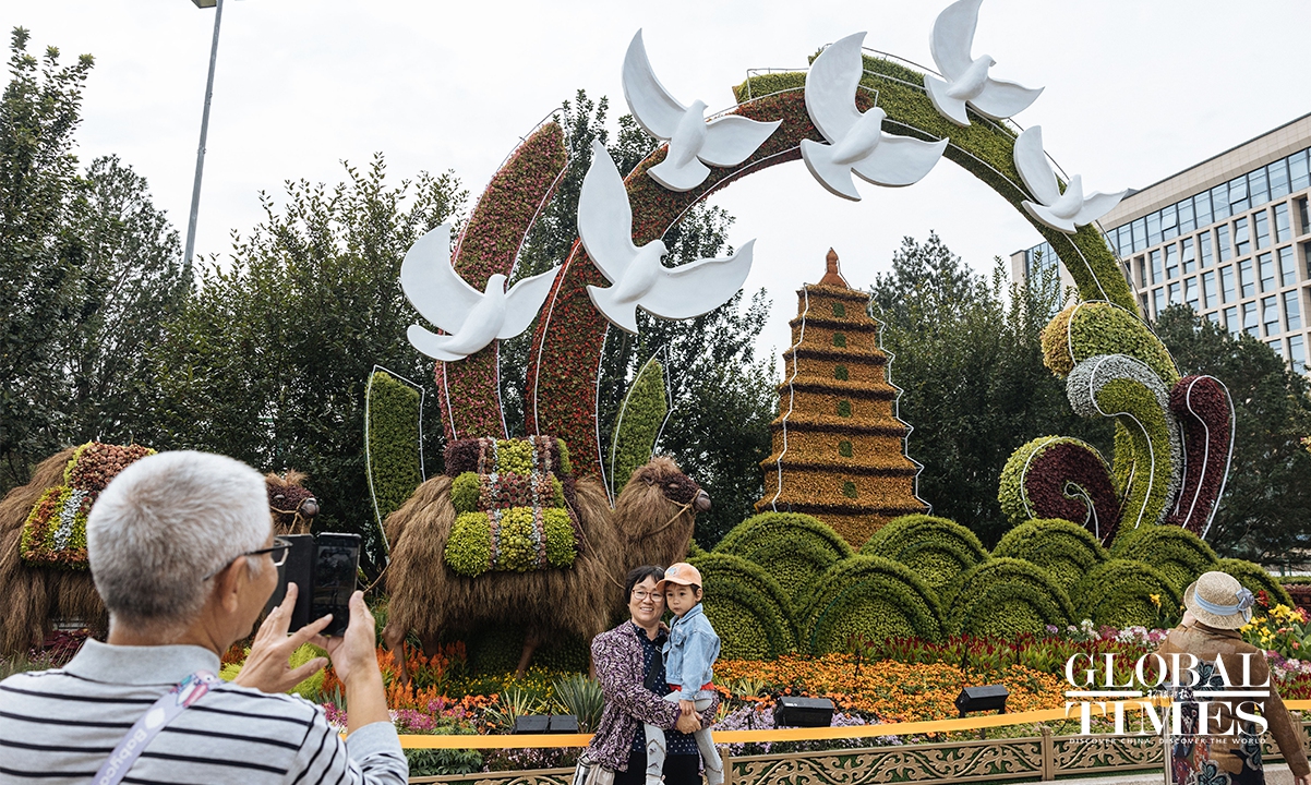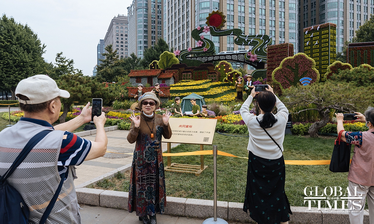 On September 25, an 18-meter-tall flower basket display was officially unveiled at the Tiananmen Square to celebrate China's National Day on October 1. Additionally, 10 meticulously designed three-dimensional flower beds were arranged and completed along the Chang'an Avenue. Photos: Li Hao/GT